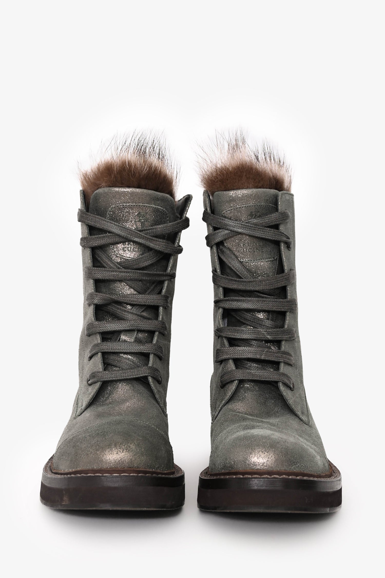 Refresh availabilityBrunello Cucinelli Grey Metallic Leather Fur Lace-Up Combat Boots. Pull-on. Round toe. Tonal stitching