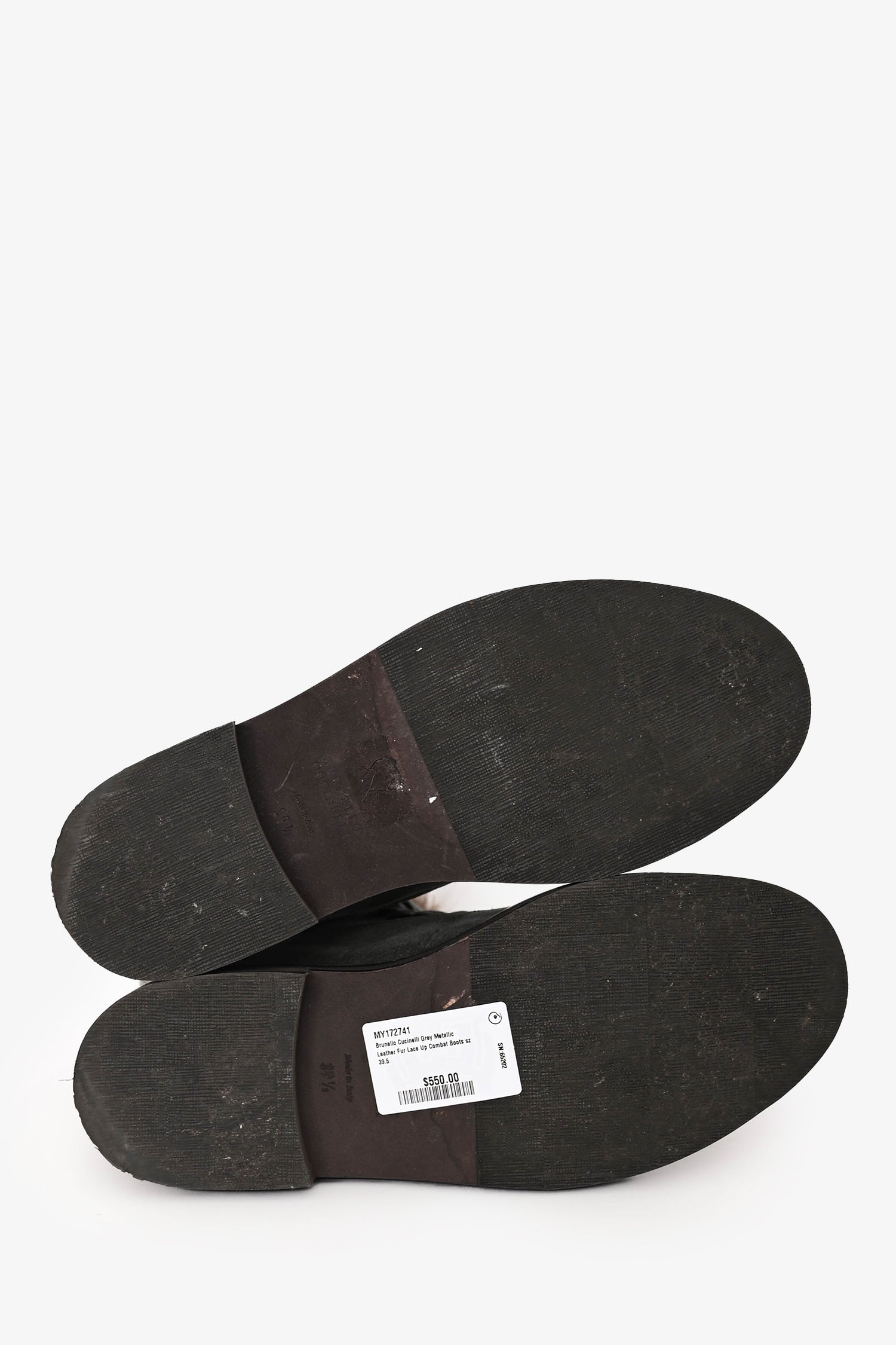Brunello Cucinelli Grey Metallic Leather Fur Lace-Up Combat Boots Size 39.5