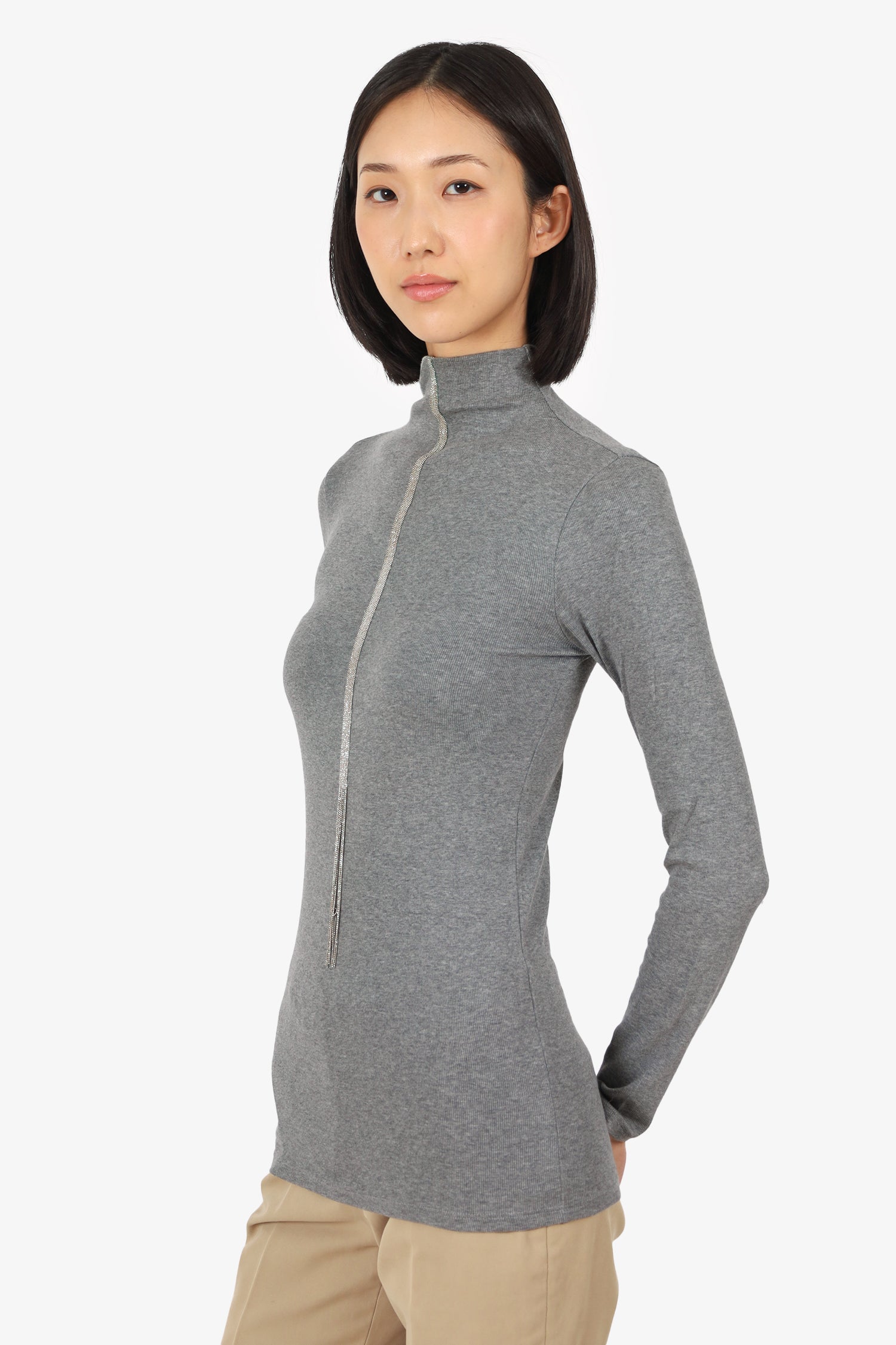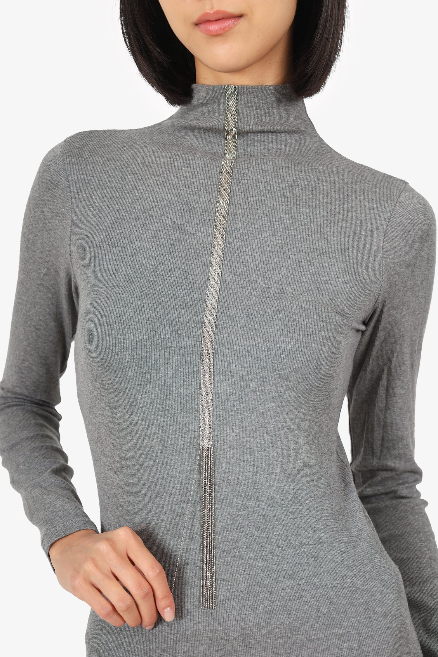 Refresh availabilityBrunello Cucinelli Grey Ribbed Beaded Fringe Detail Top. Pull-on. Mock-neckline. Silver-tone hardware. Tonal stitching.
