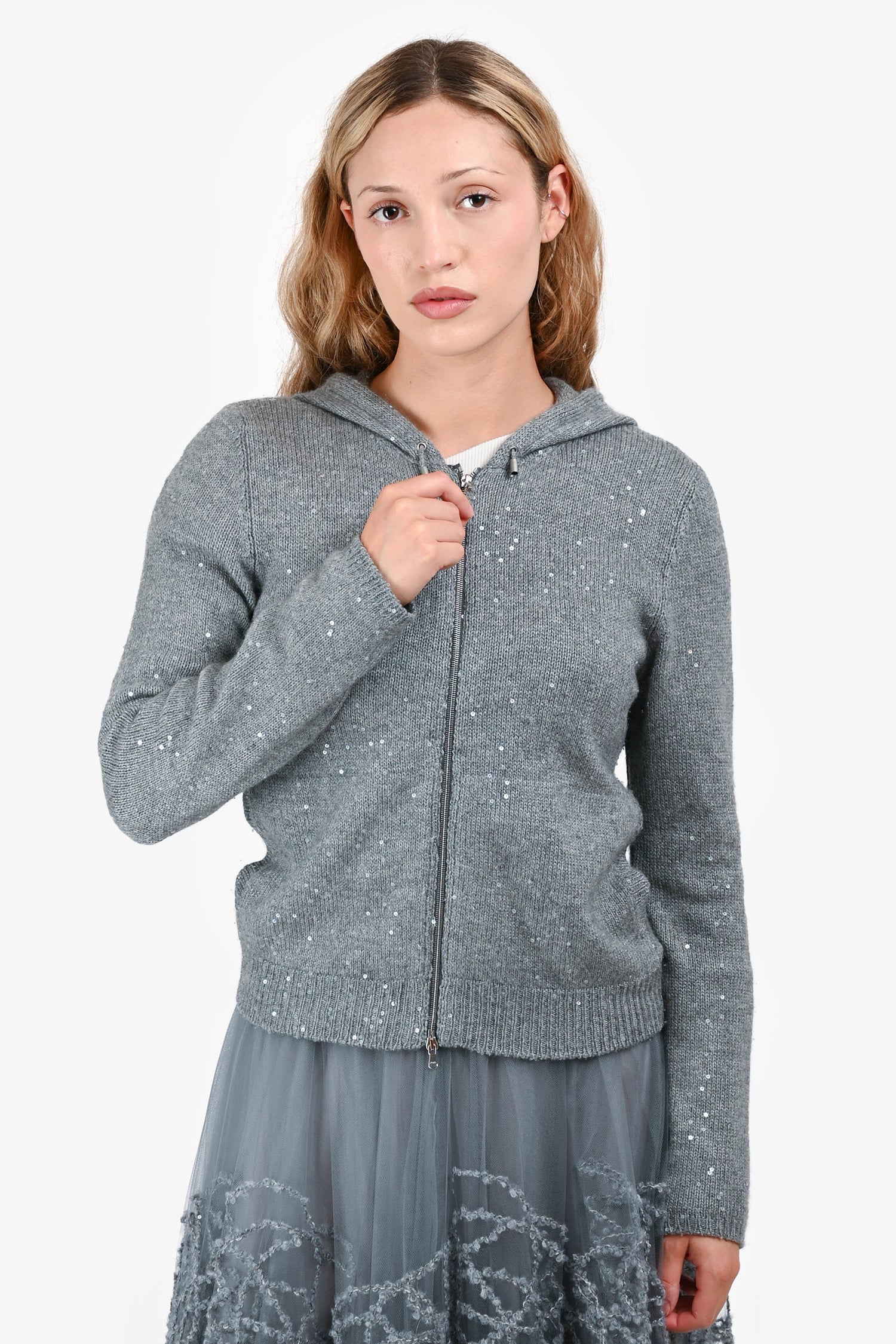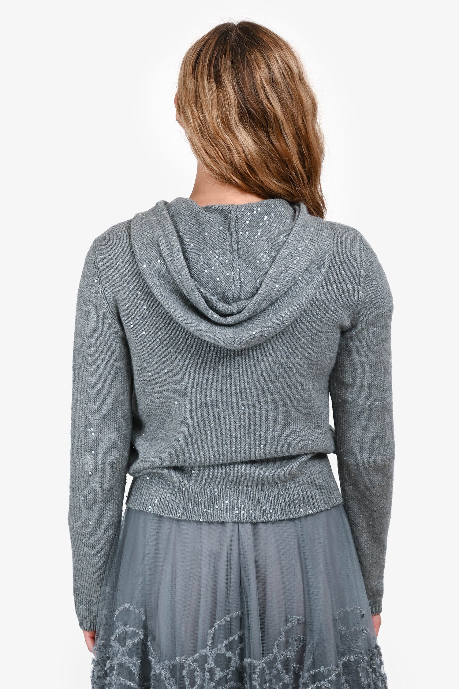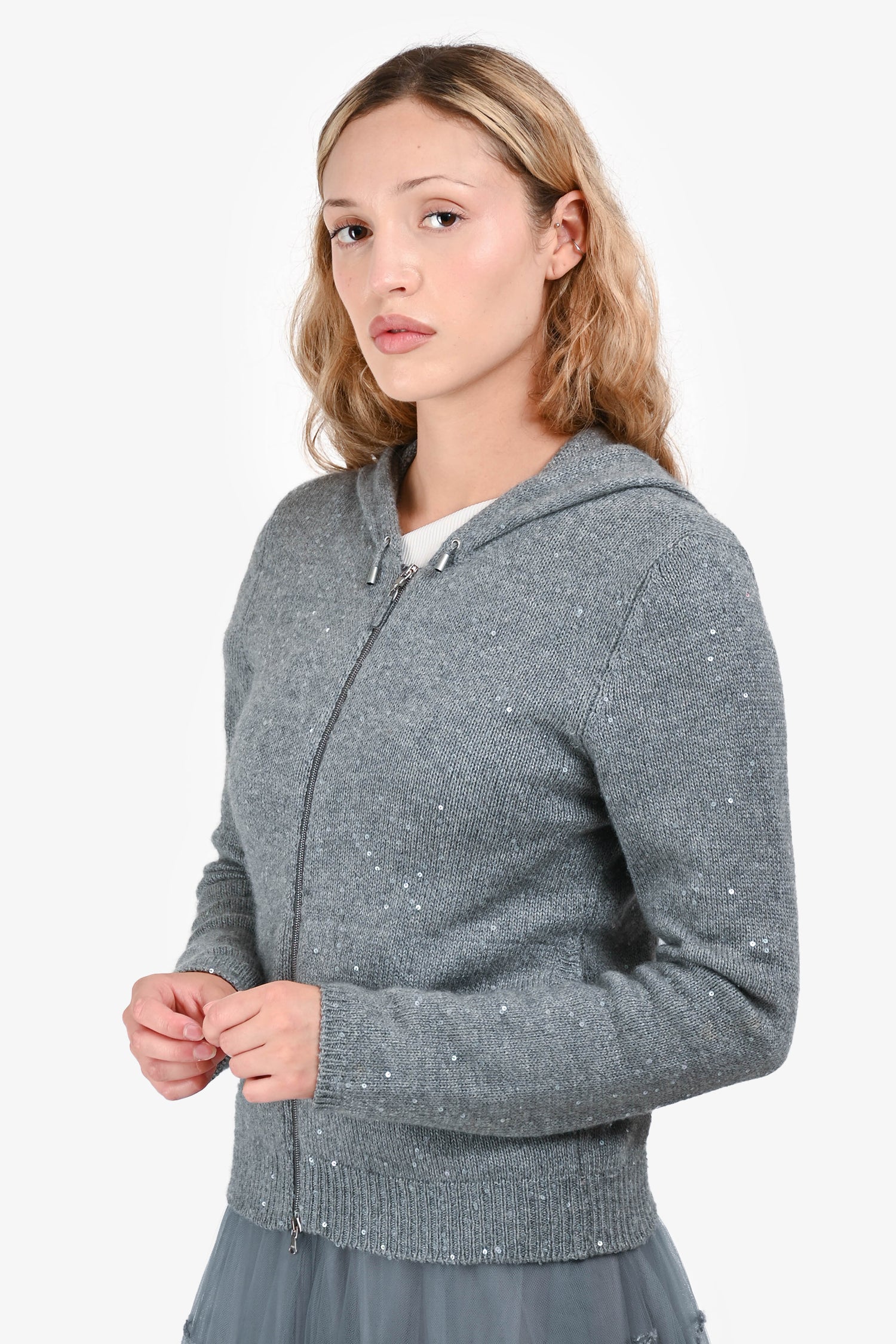 Brunello Cucinelli Grey Sequinned Cashmere/Silk Hooded Cardigan Size XS