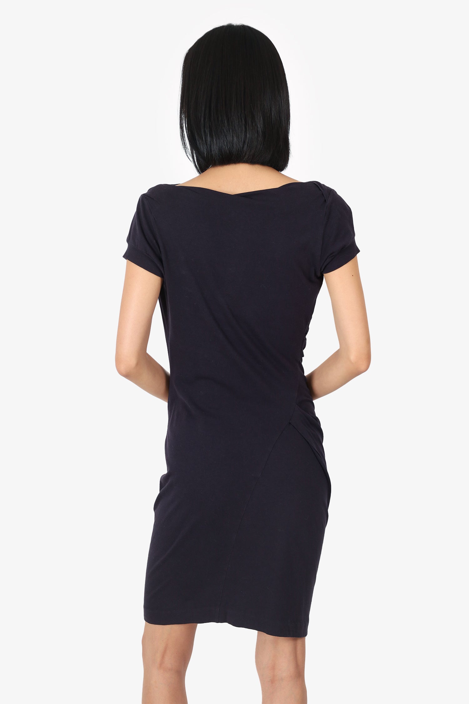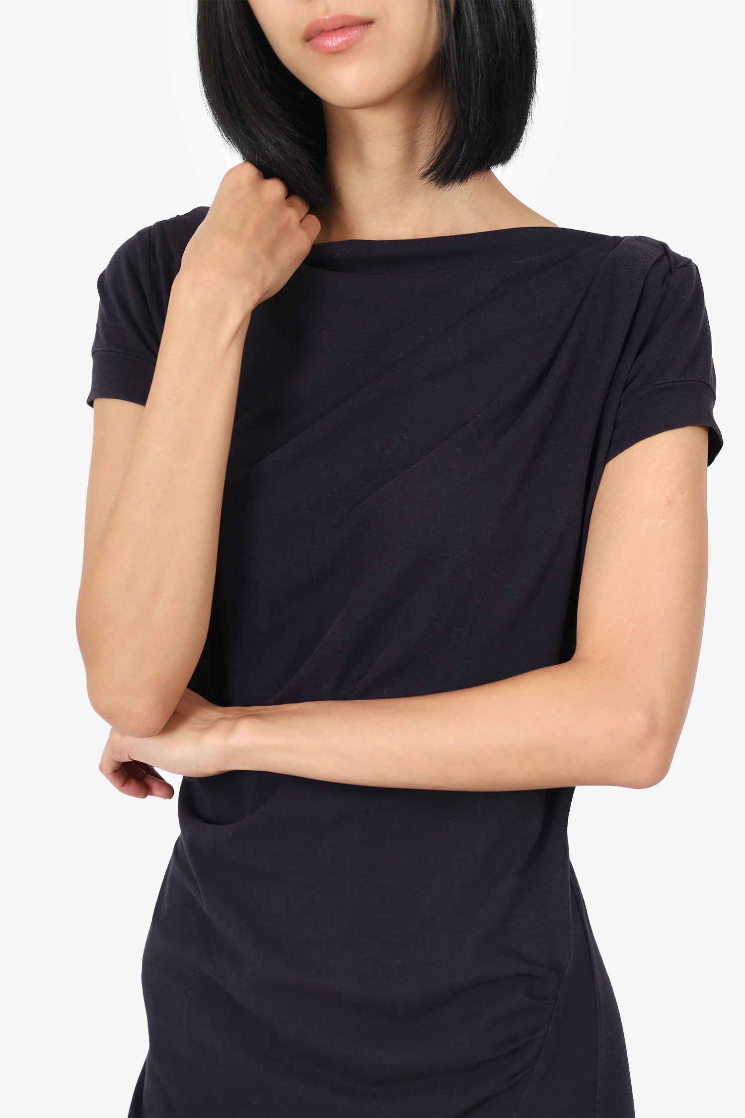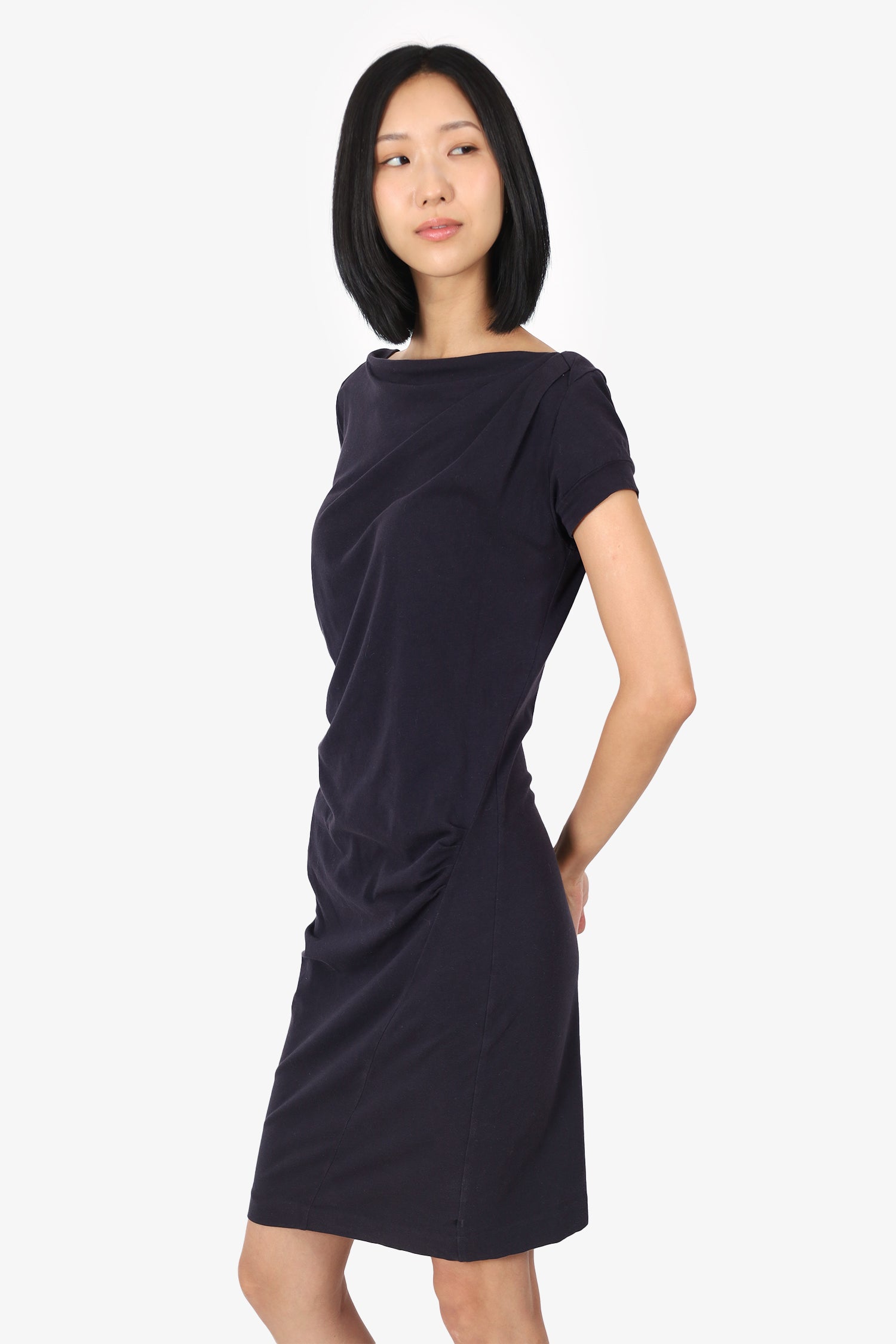 Refresh availabilityBrunello Cucinelli Navy Ruched Short Sleeve Midi Dress. Pull-on. Boat-neckline. Tonal stitching.