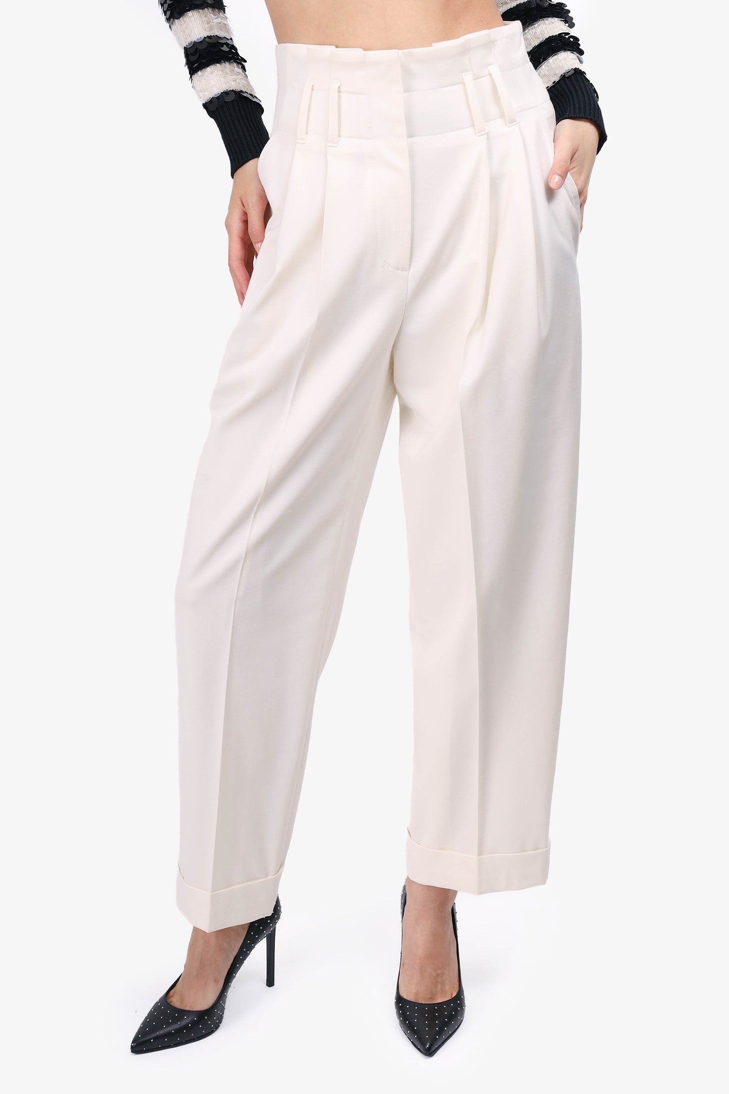 Refresh availabilityBrunello Cucinelli Off White Wool Trousers. Front zip closure. Front slip pockets. Belt loops along waistline. Pleats on front and rear of pants. Folded leg cuffs. Lined. Tonal stitching.
