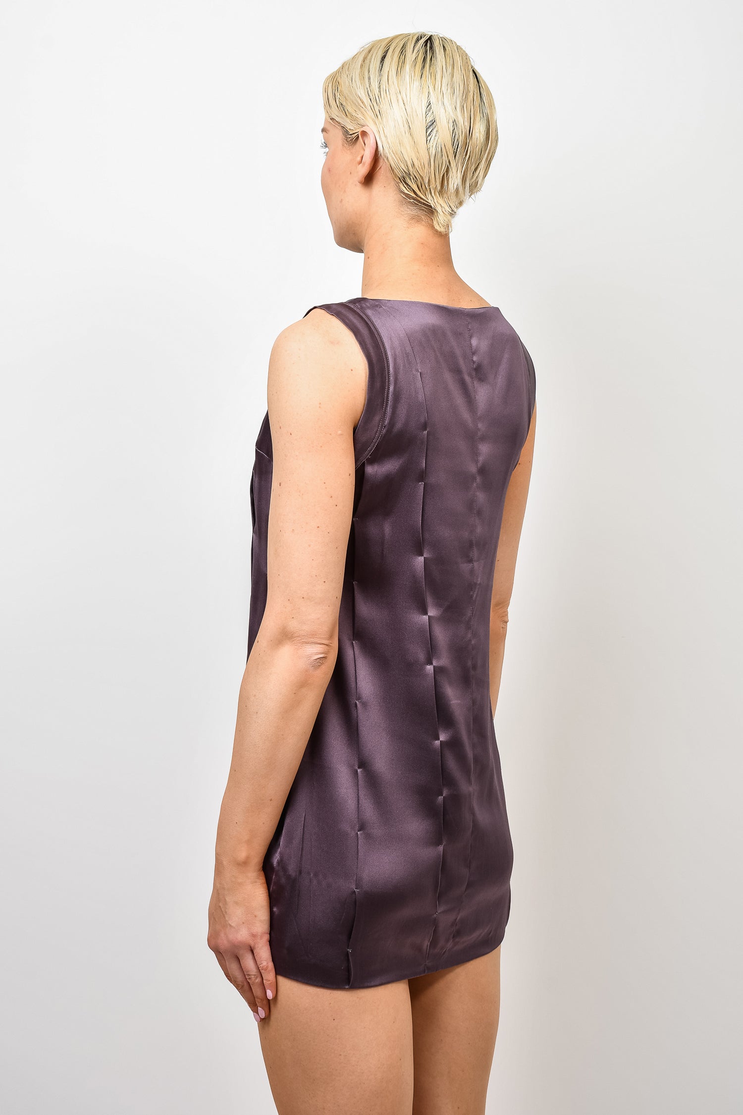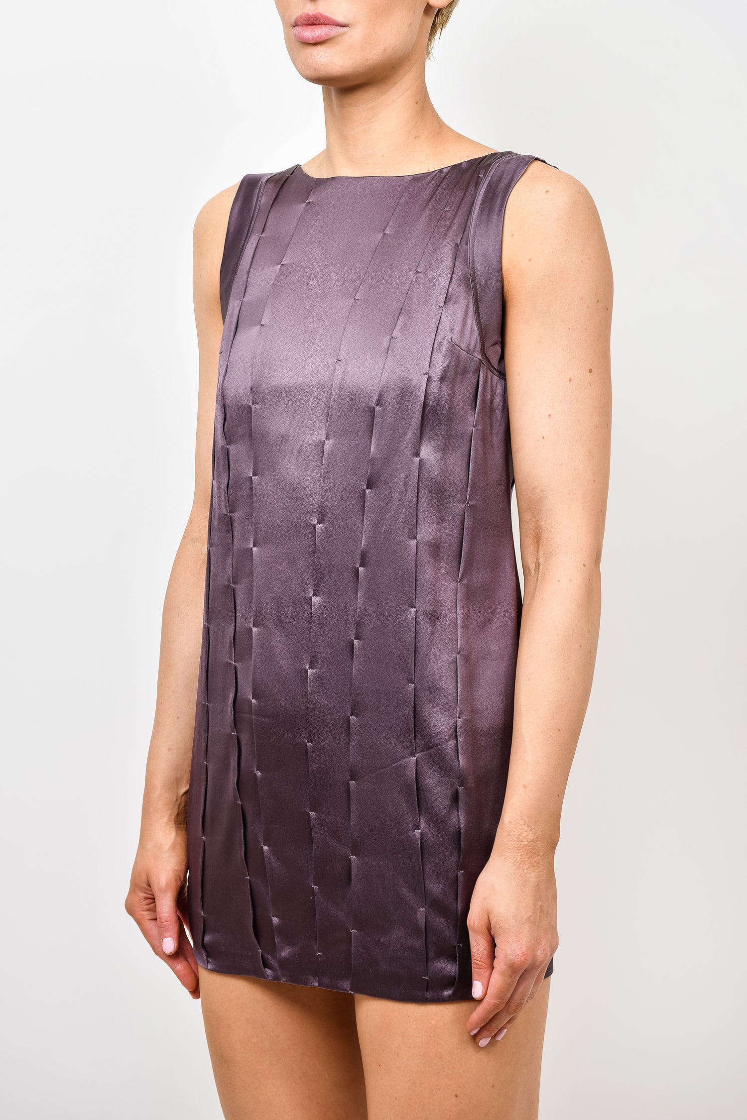 Refresh availabilityBrunello Cucinelli Purple Silk Sleeveless Mini Dress. Pullover. Unlined. Round neckline. Stitching detail throughout. Tonal stitching.
