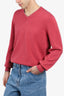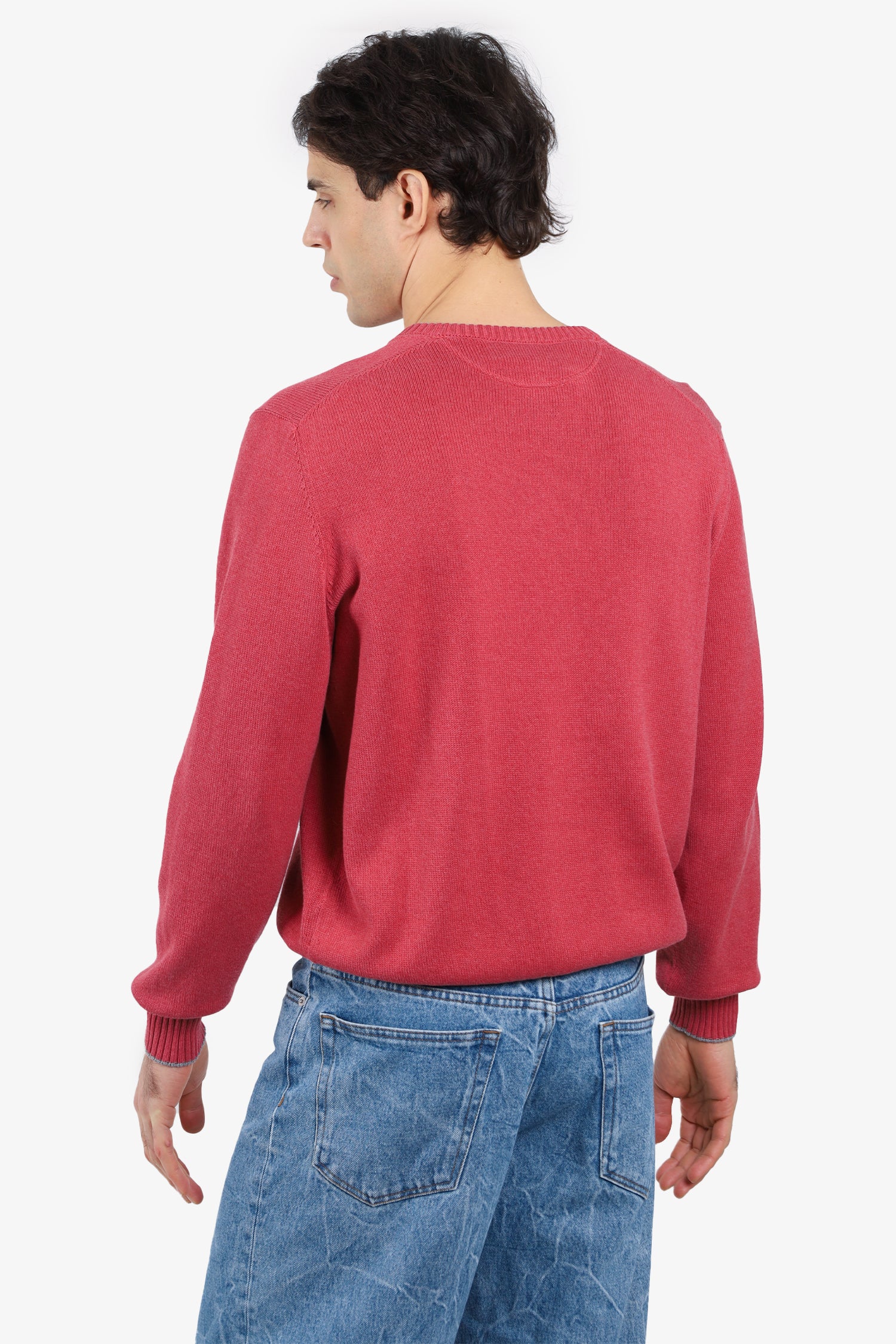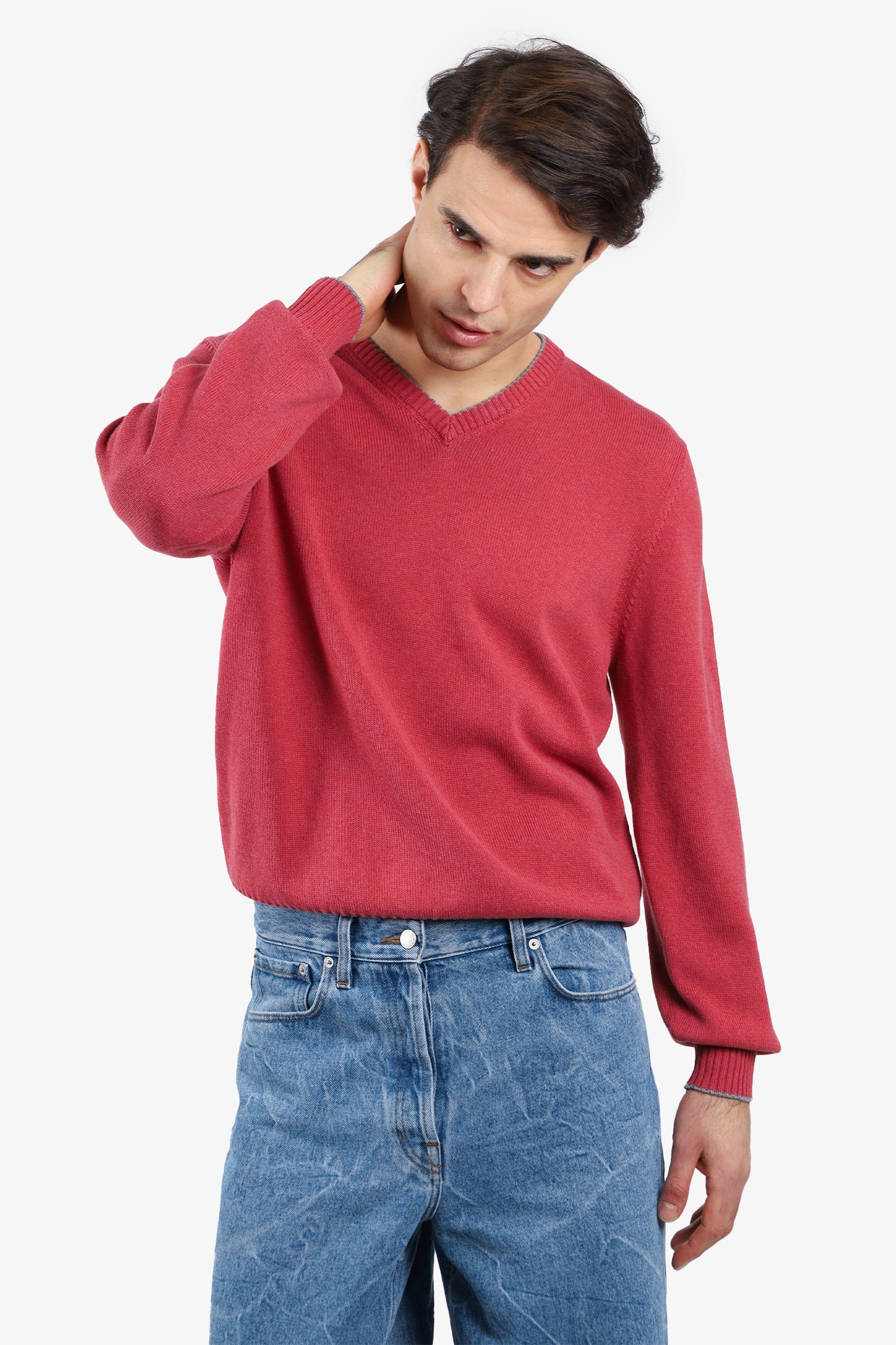 Refresh availabilityBrunello Cucinelli Red Cotton Sweater. Ribbed v-neck. Cuffed & Ribbed hem and sleeves. Tonal stitching.