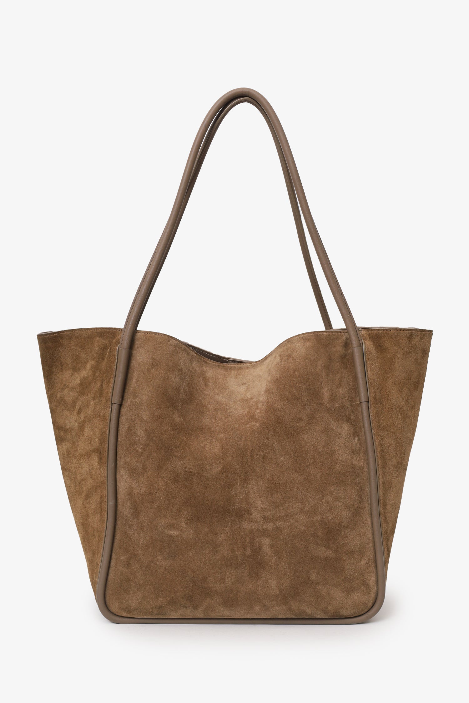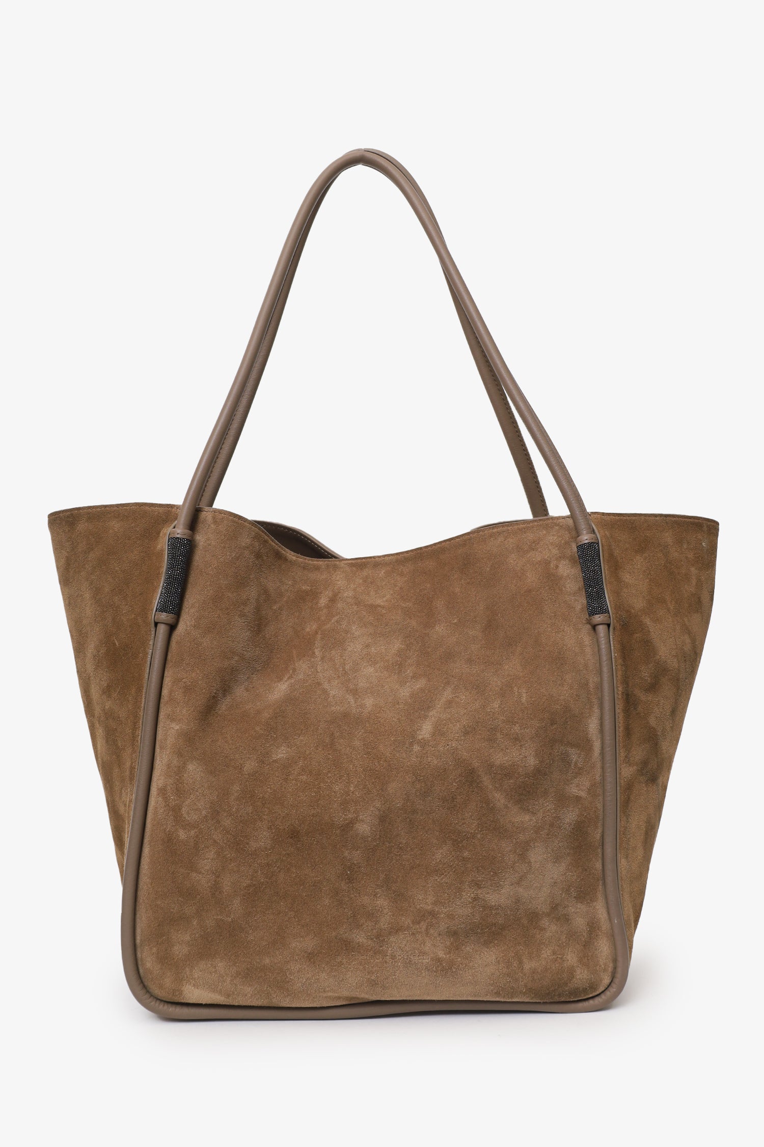 Refresh availabilityBrunello Cucinelli Suede Monili-embellished Shopper. Open top with magnetic closure. Twin shoulder straps. Leather-lined interior. Top zip-closure pouch with side strap attachment included. Tonal stitching.