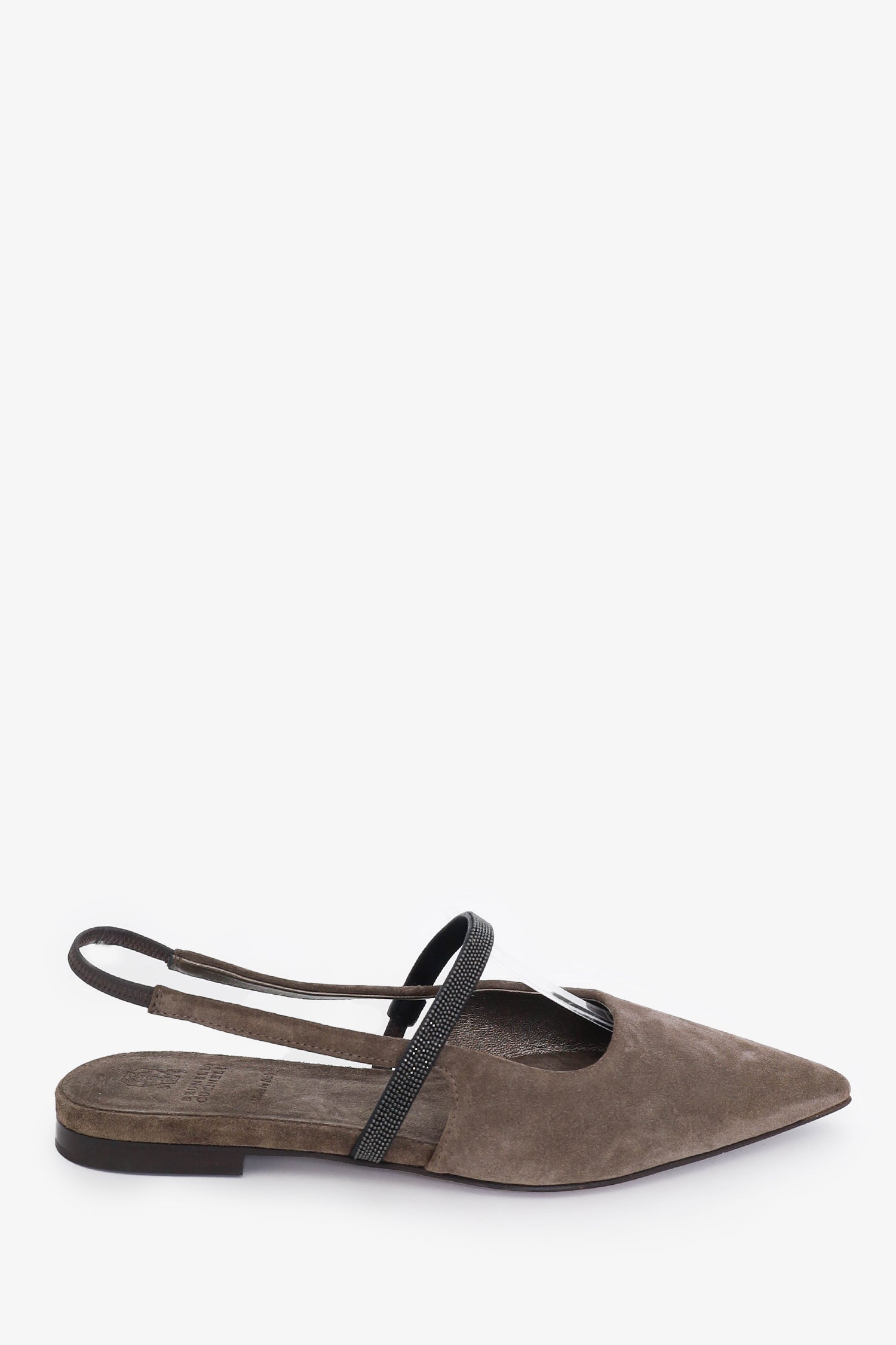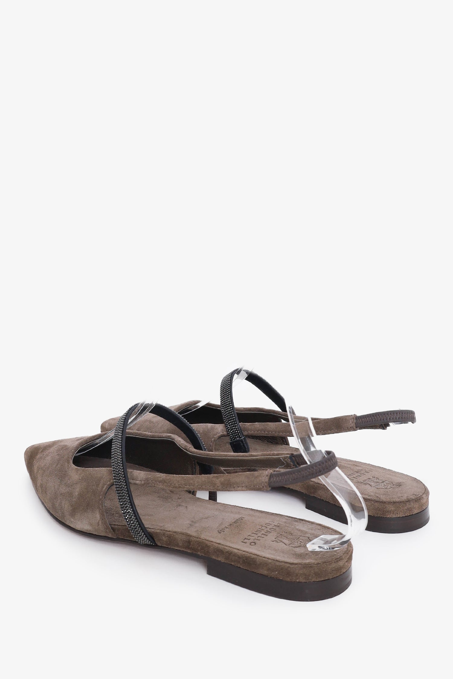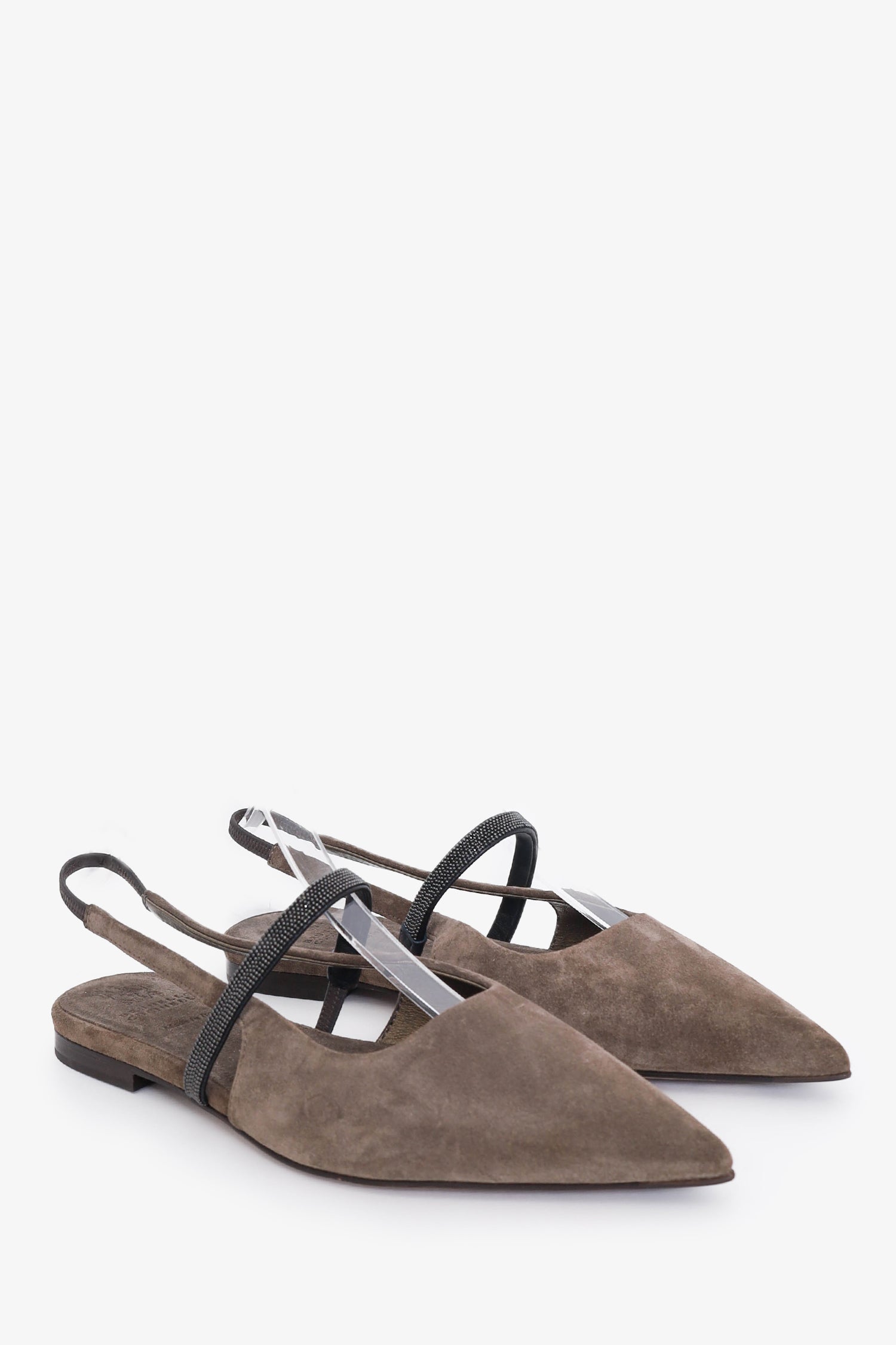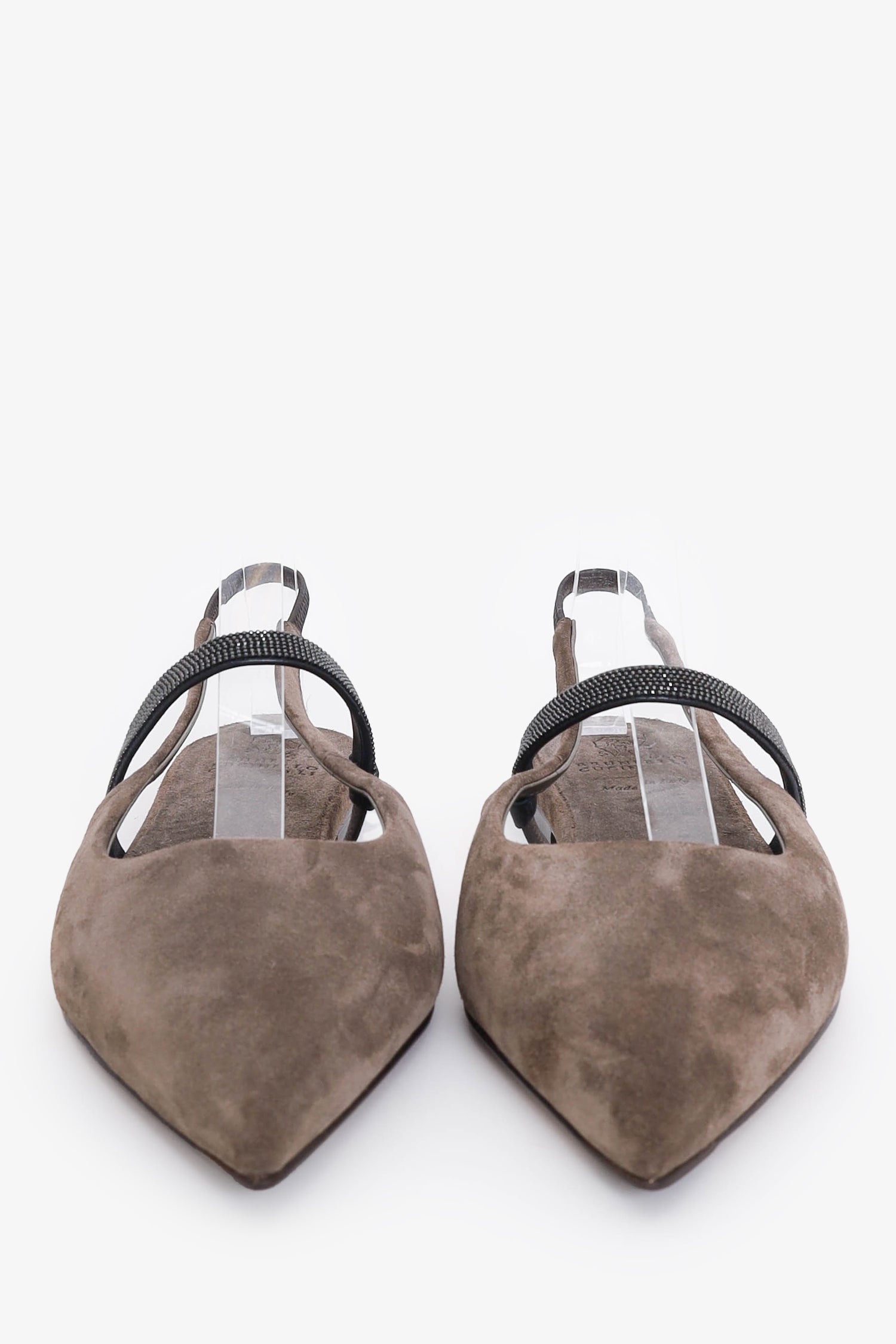 Refresh availabilityBrunello Cucinelli Taupe Crystal Detail Pointed Flats. Sling-back pull-on. Front elasticated strap. Pointed toe. Suede exterior.