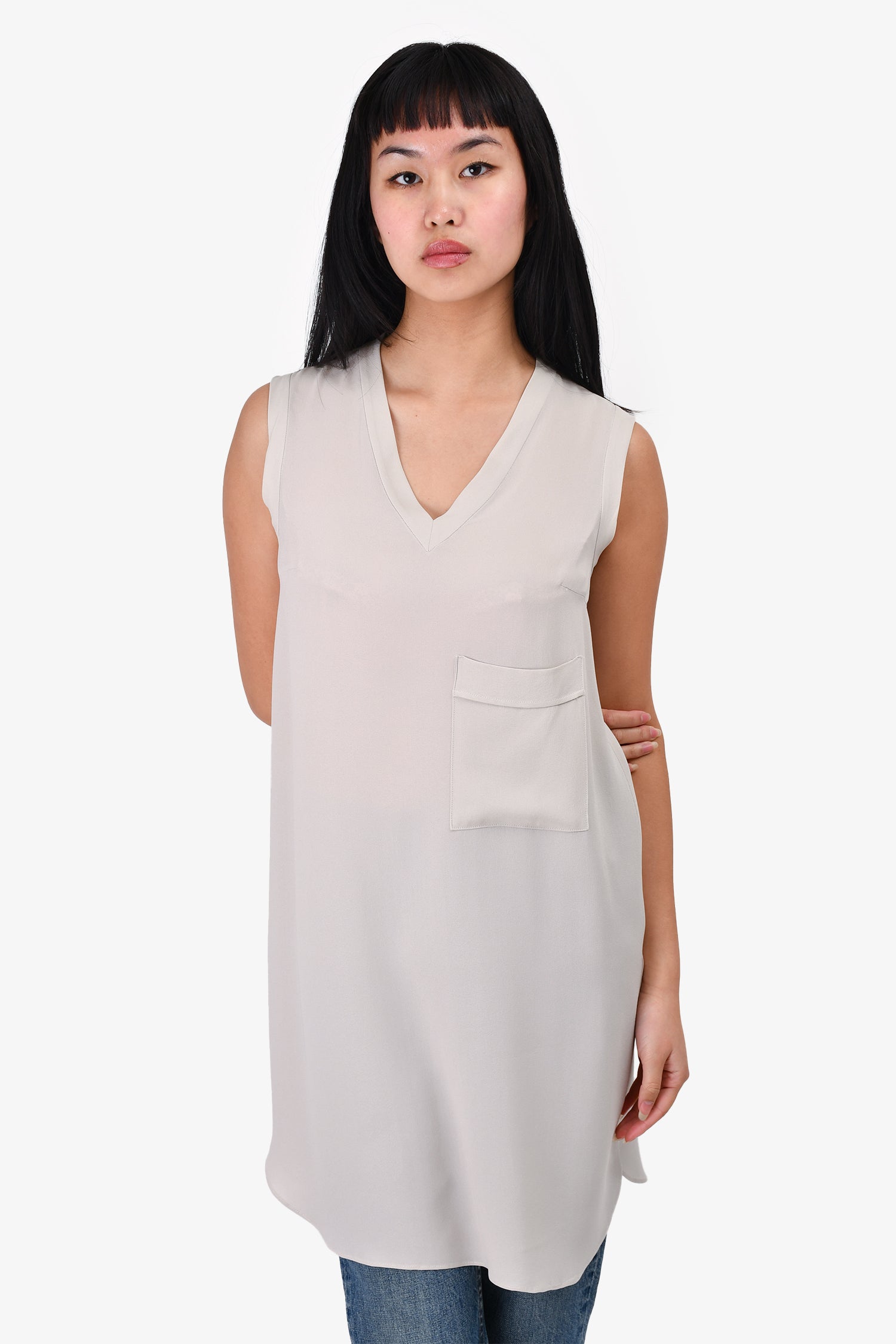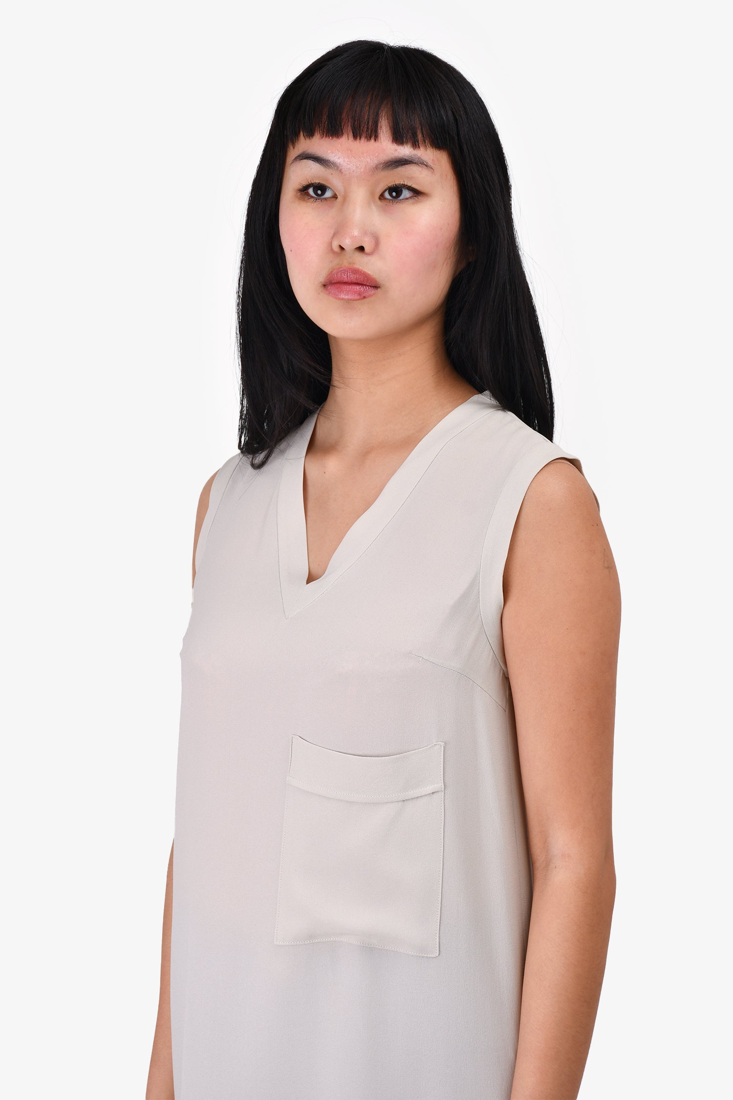 Refresh availabilityBrunello Cucinelli Taupe Silk Sleeveless Tunic. Pull-on. V-neck. Single front. chest pocket. Tonal stitching.