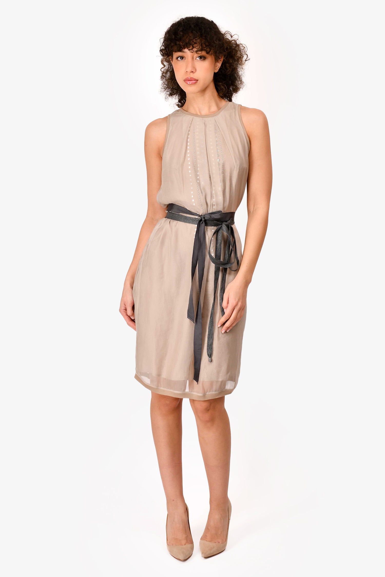 Refresh availabilityBrunello Cucinelli Taupe Silk Stud Embellished Belted Mini Dress. Back zip closure. Lined interior with stud embellishments. Comes with a leather belt. Tonal stitching.