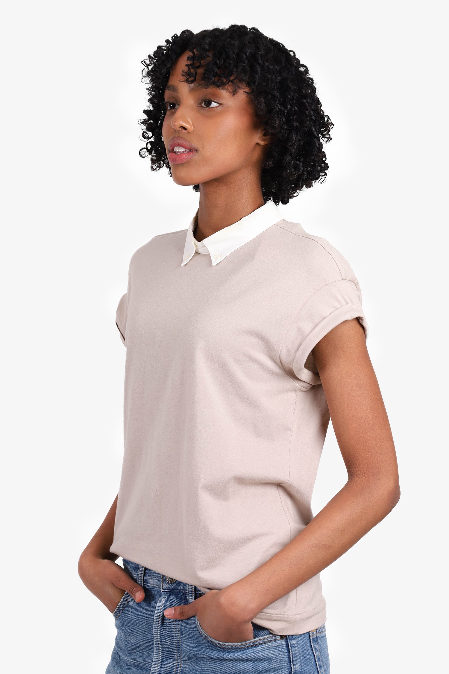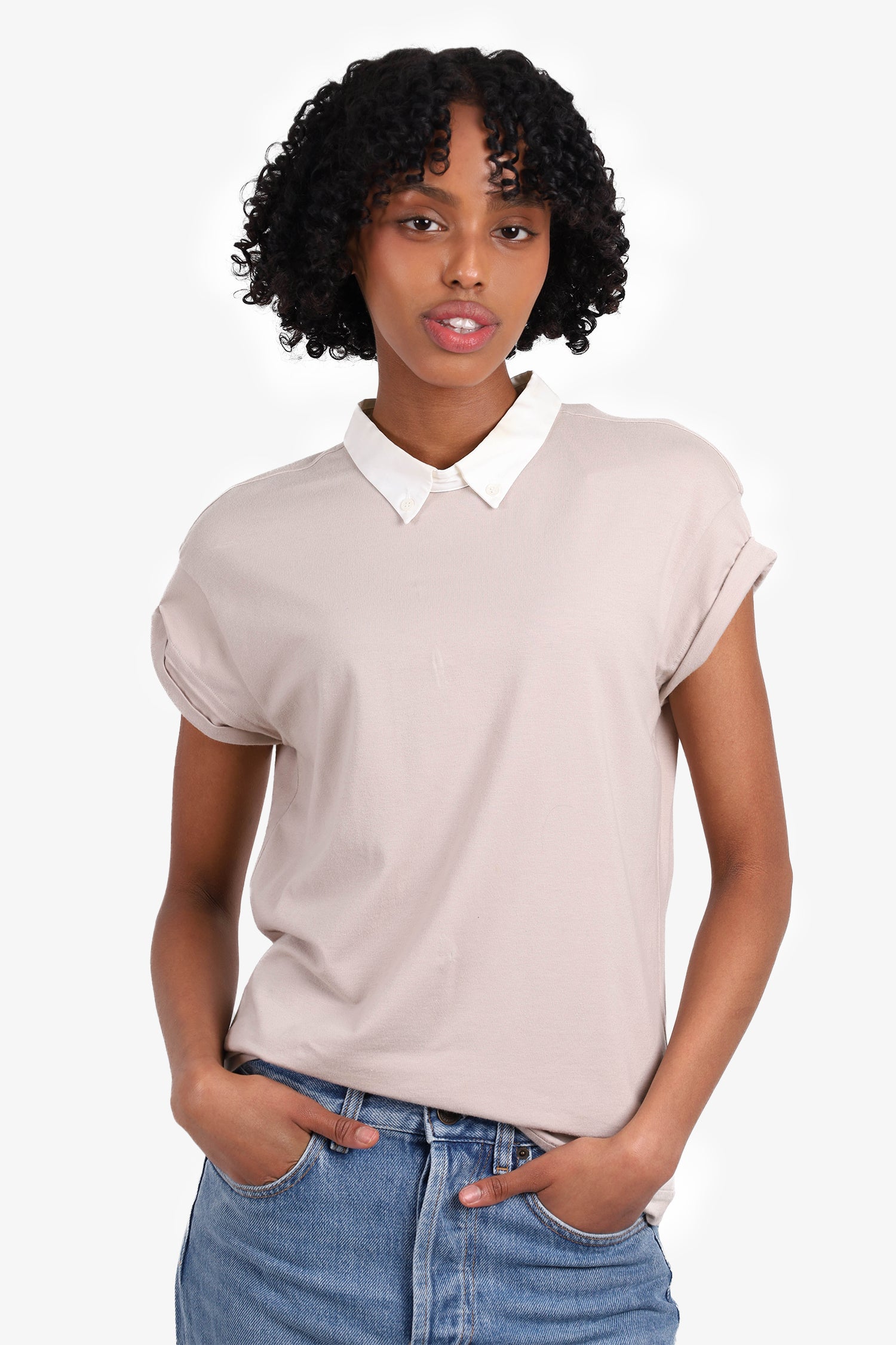 Refresh availabilityBrunello Cucinelli Taupe/White Top. Collared neckline. Back hook closure. Rolled sleeve hem. Tonal stitching.