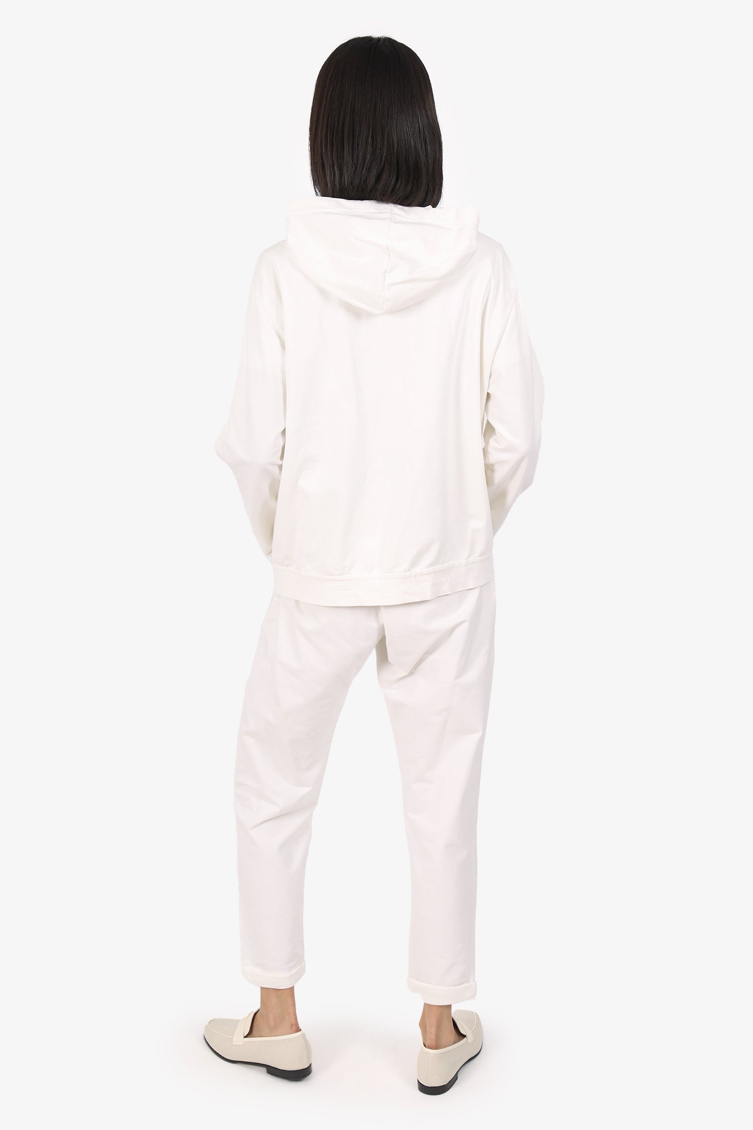 Refresh availabilityBrunello Cucinelli White Beaded Detail Joggers + Zip Up Hoodie. Hoodie: Pull-on. Hooded with adjustable drawstrings. Front zip closure. 2 front exterior slip pockets; Joggers: Slip-on. Elasticized waistline with adjustable drawstrings. 2 front exterior side slip pockets. Silver-tone hardware. Tonal stitching.