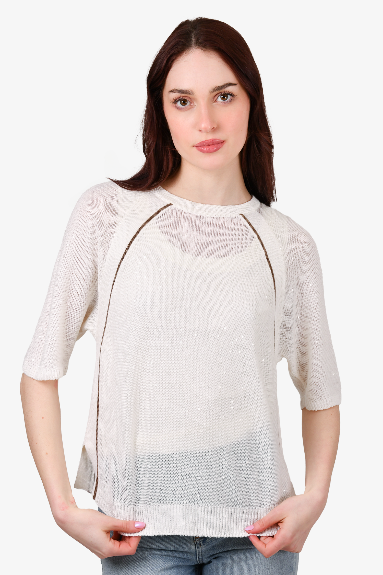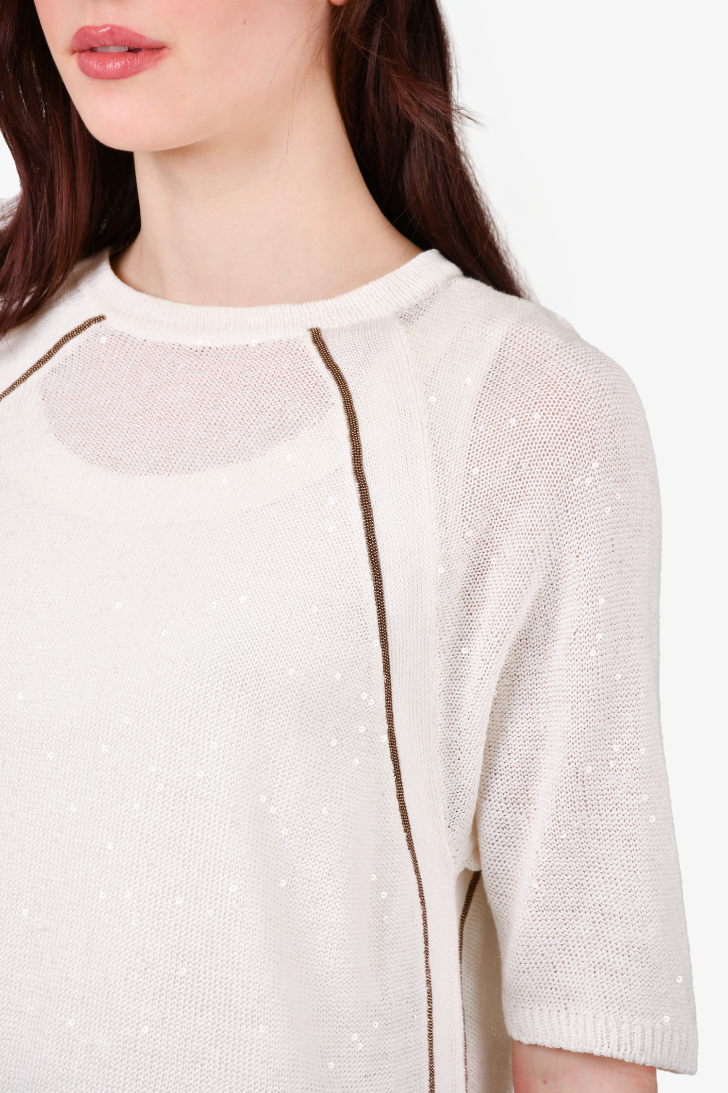 Refresh availabilityBrunello Cucinelli White Knit Sequin Top. Round neck. Pull-on. Sheer; tank top not included. Ribbed neck, cuffs and hem. Tonal stitching.