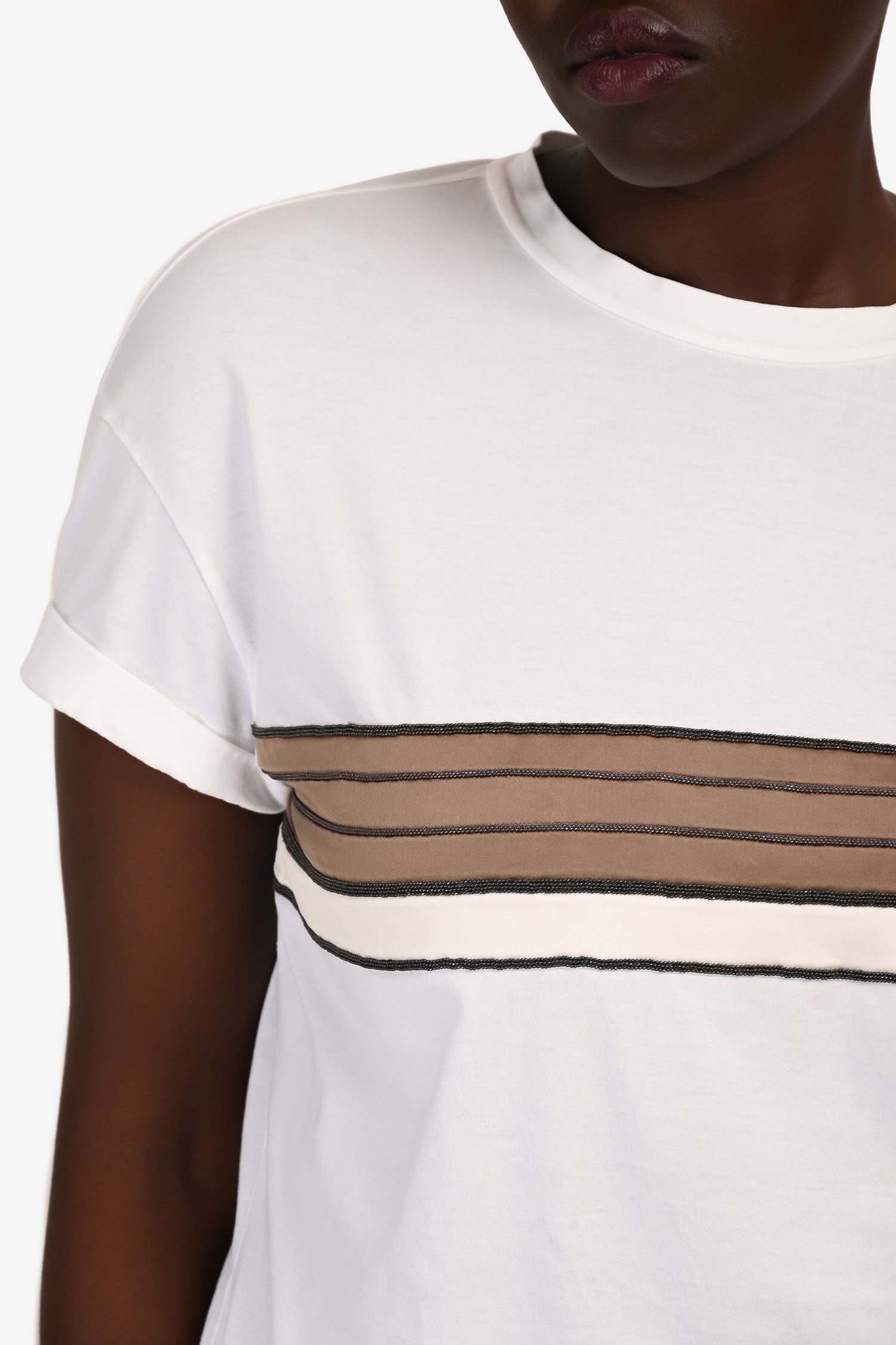 Refresh availabilityBrunello Cucinelli White Patterned Detail T-Shirt. Pull-on. Round neckline. Rear keyhole with button-up closure. Tonal stitching.