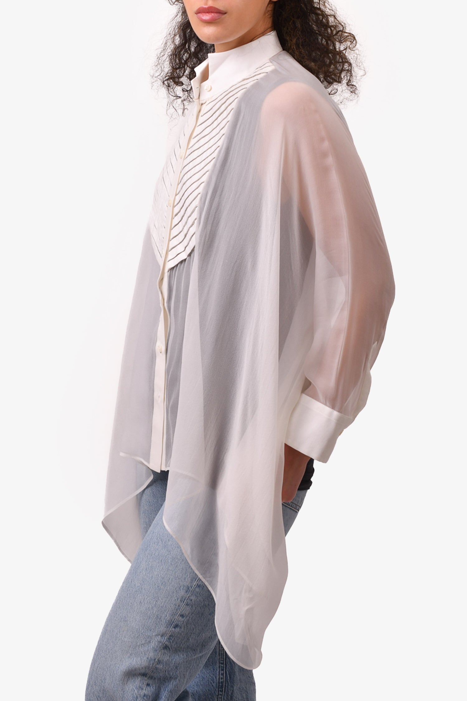 Refresh availabilityBrunello Cucinelli White Silk Sheer Cape Blouse with Studded Detail. Button closure. Bat wing sleeves. Collared neckline. Silver-toned studs. Tonal stitching.