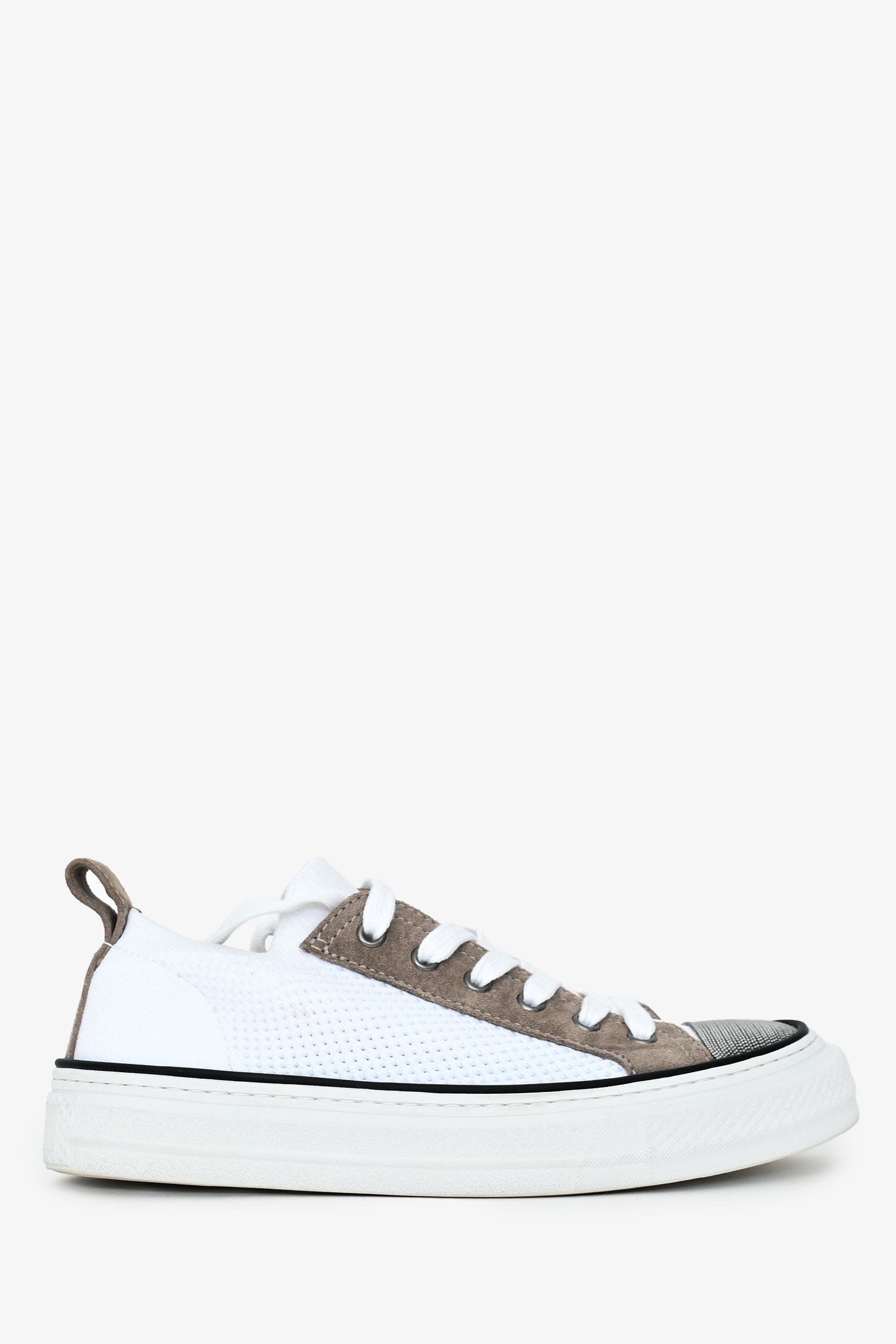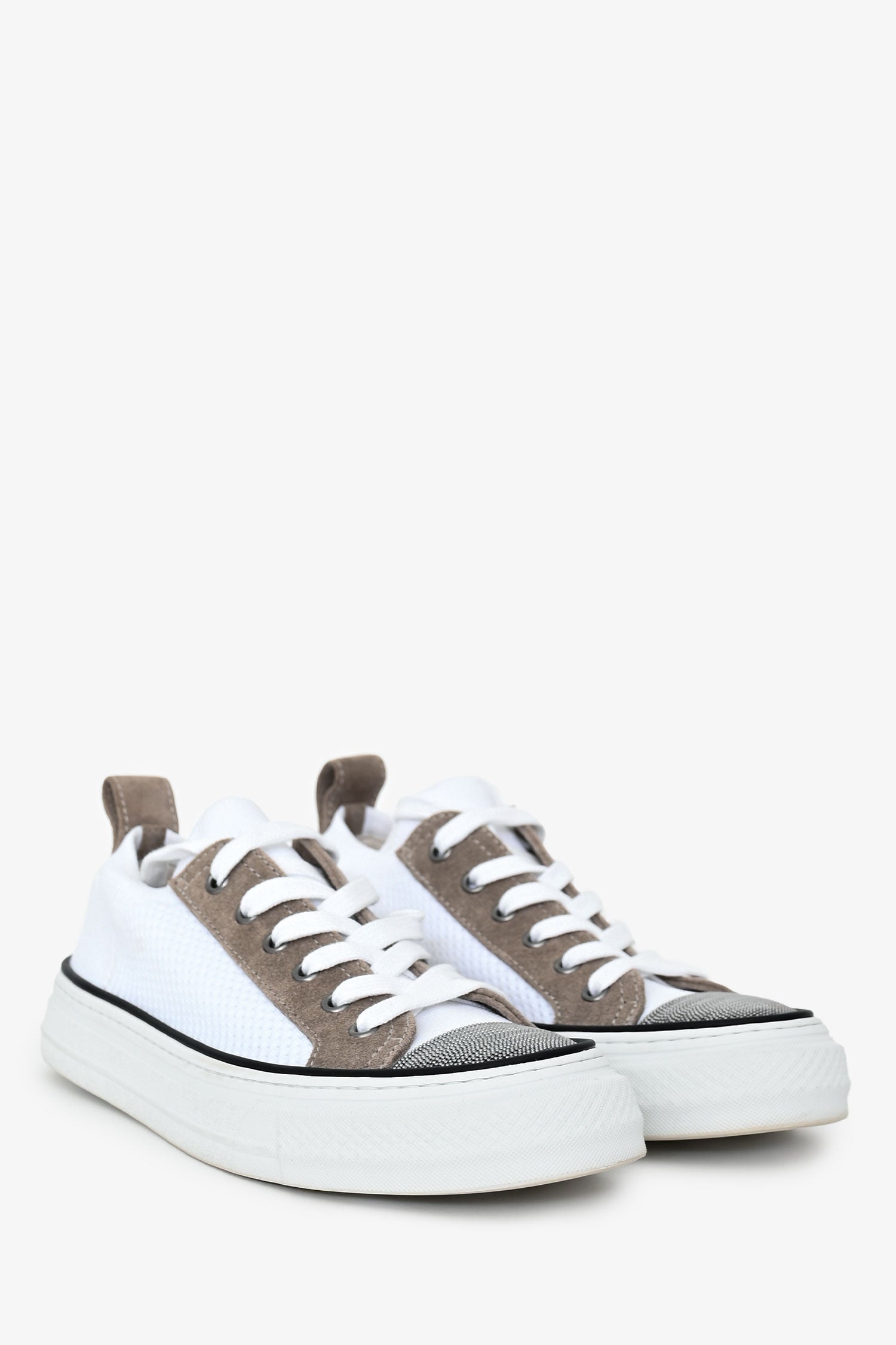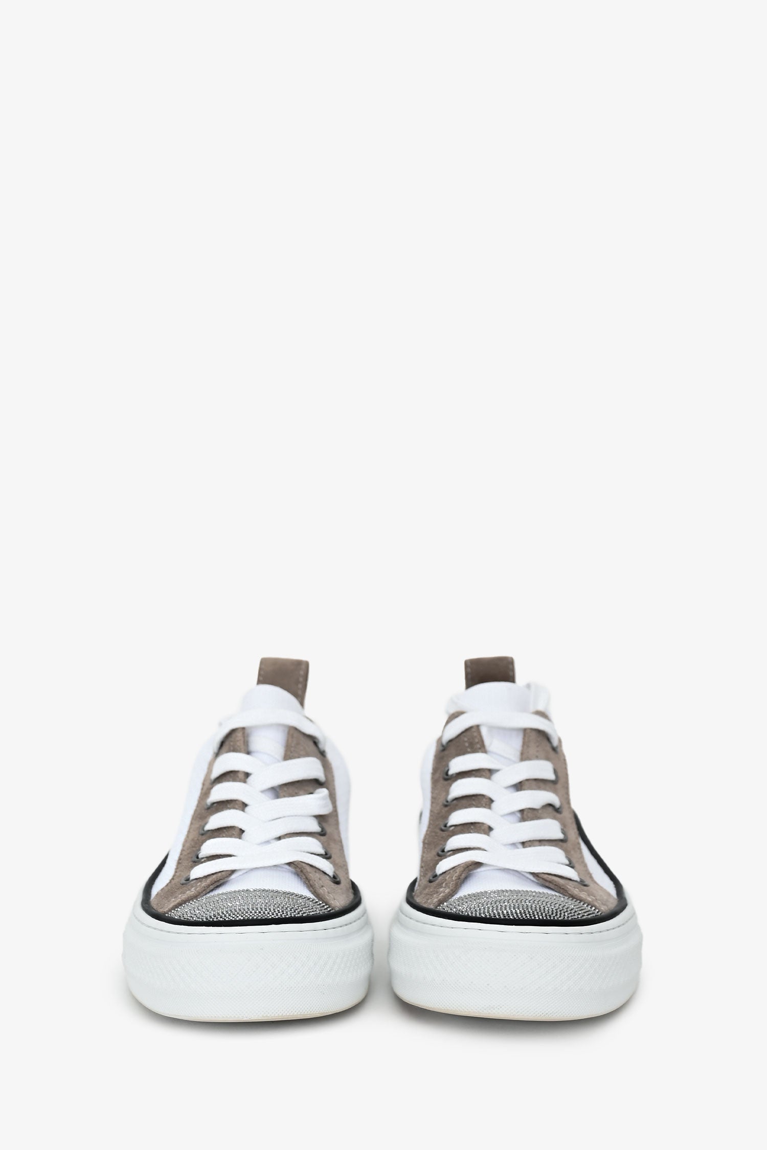 Refresh availabilityBrunello Cucinelli White/Taupe Suede Leather Monili Trim Platform Sneakers. Lace-up. Round toe. Fabric insole. Rubber platform sole. Silver-tone hardware. Tonal stitching.