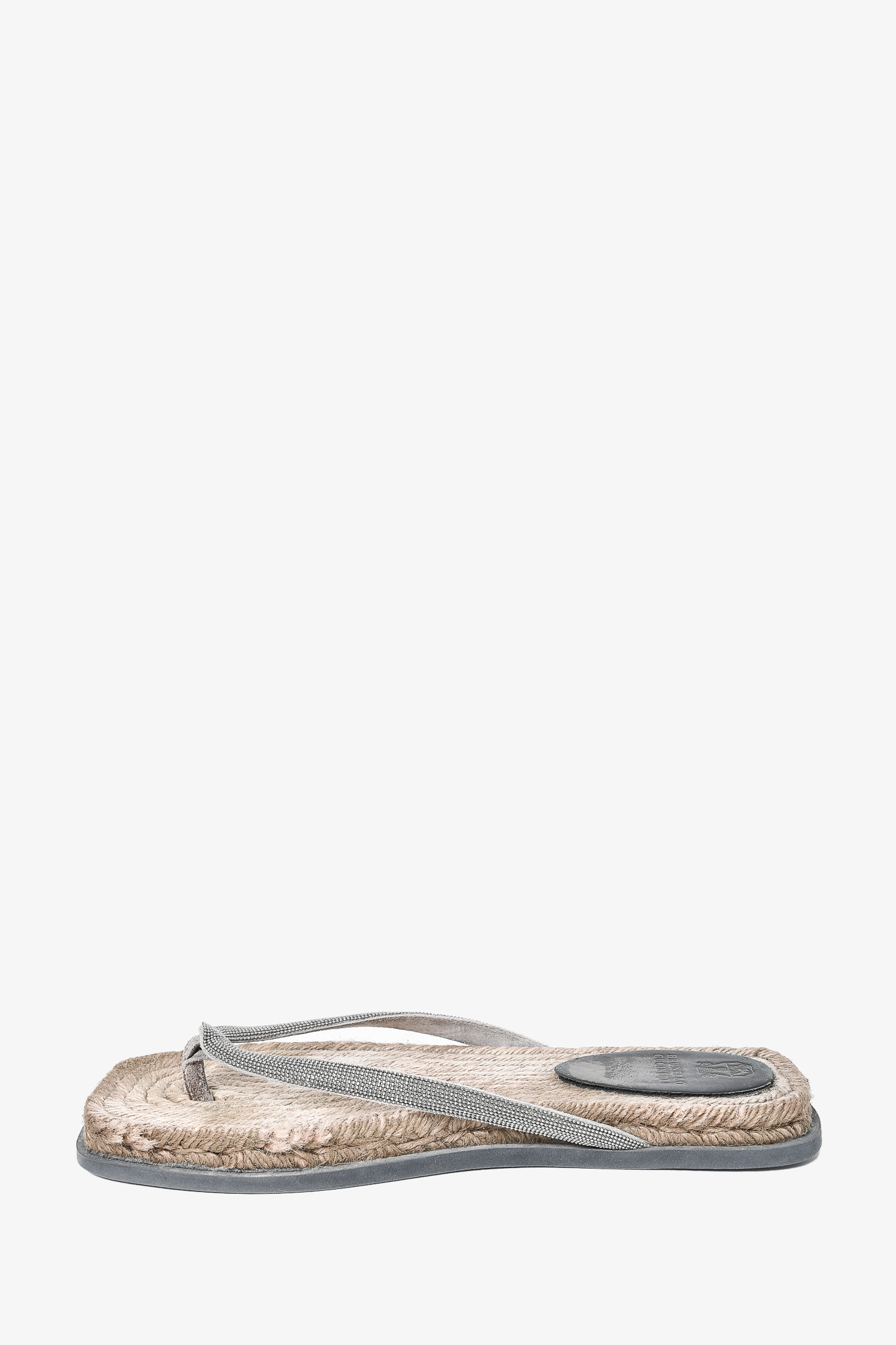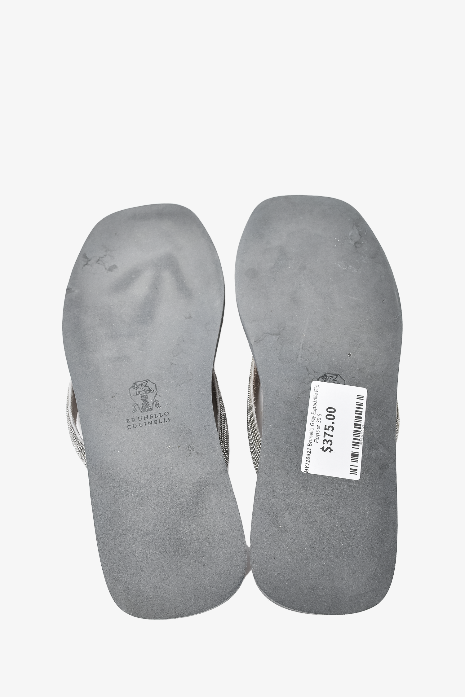 Refresh availabilityBrunello Grey Espadrille Flip Flops. Slip-on. Open square toe. Embellished straps. Tonal stitching.