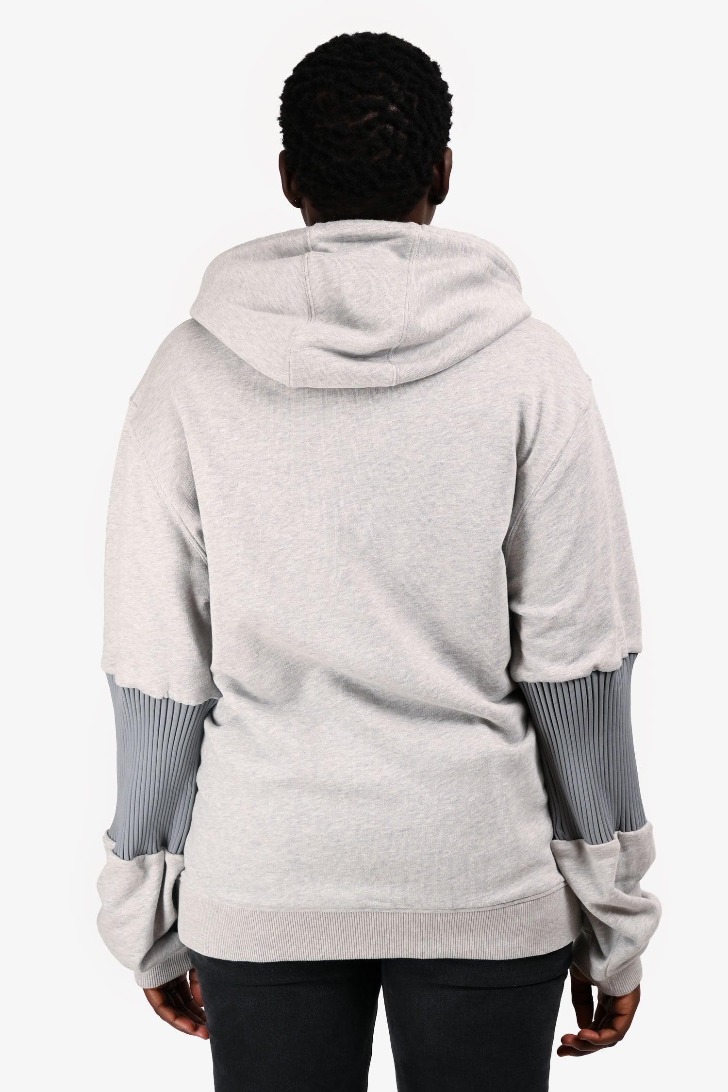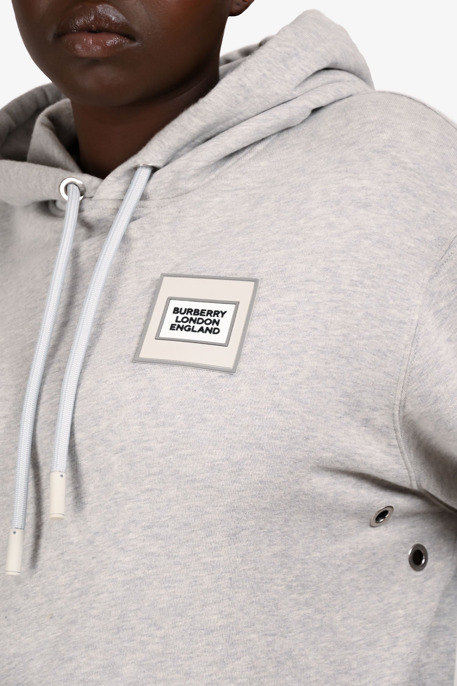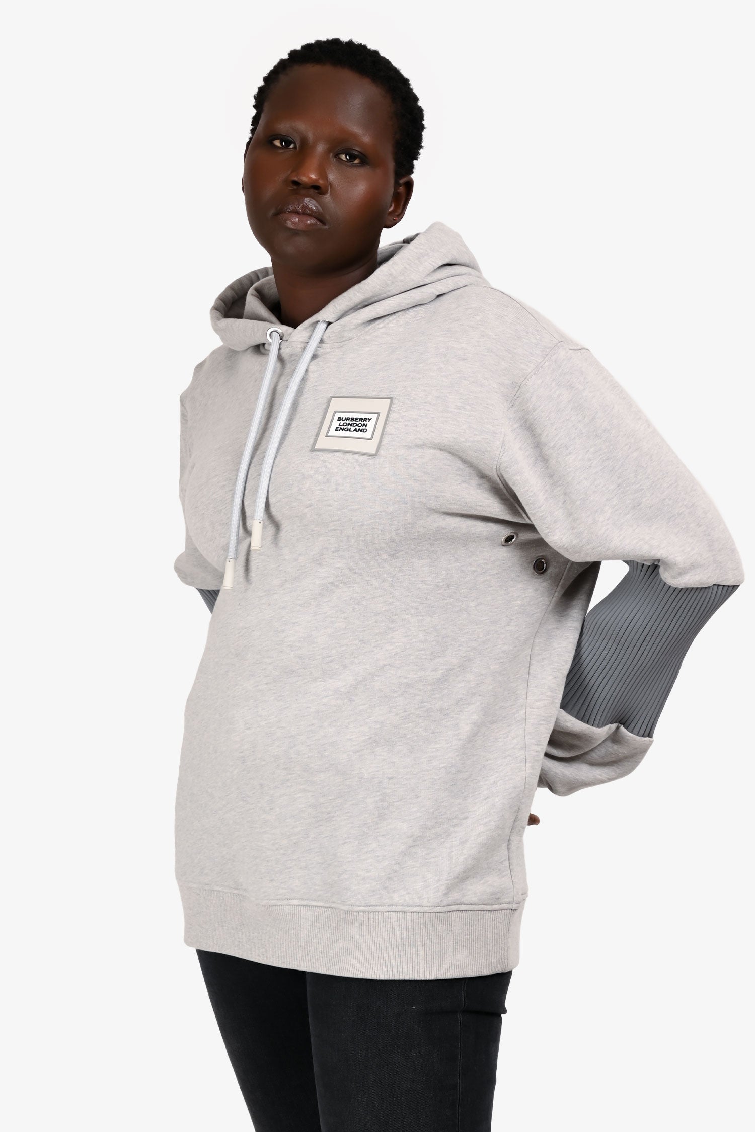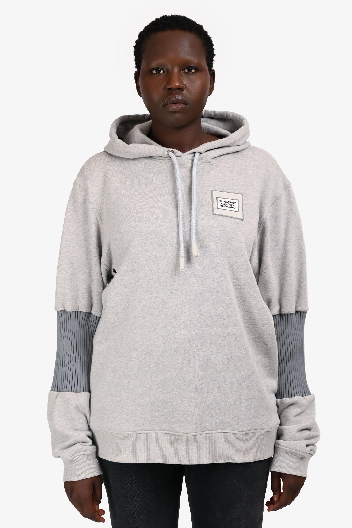 Refresh availabilityBurberry 2023 Grey Stretch Knit Sleeve Patch Logo Hoodie. Pull-on. Drawstring hood. Ribbed cuffs and hem. Terrycloth interior lining.