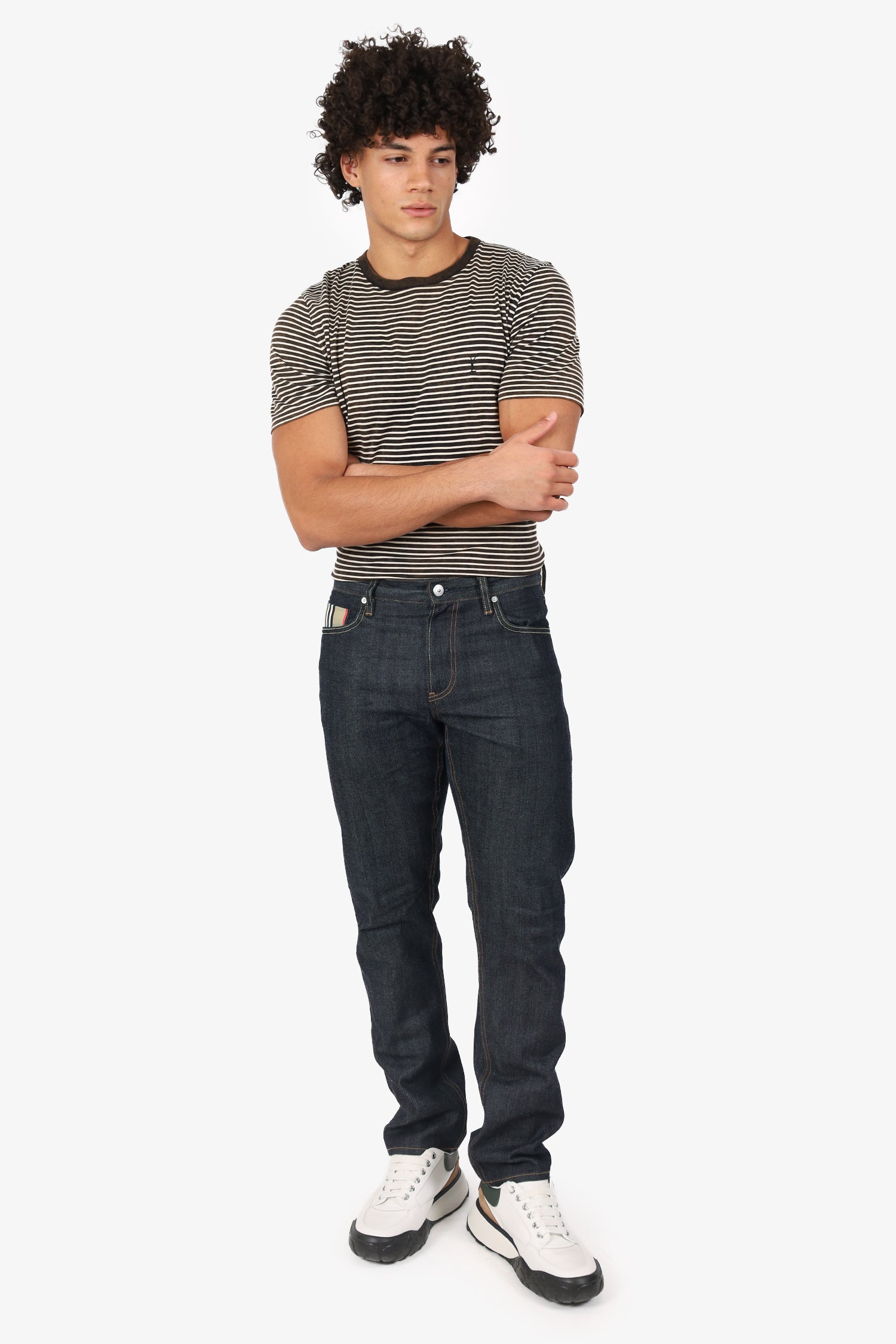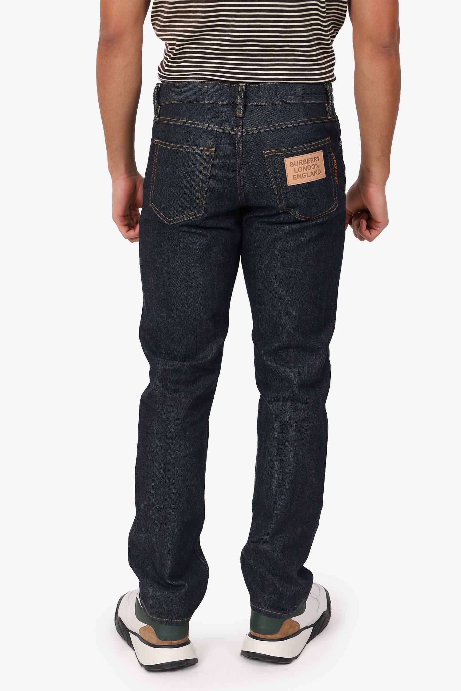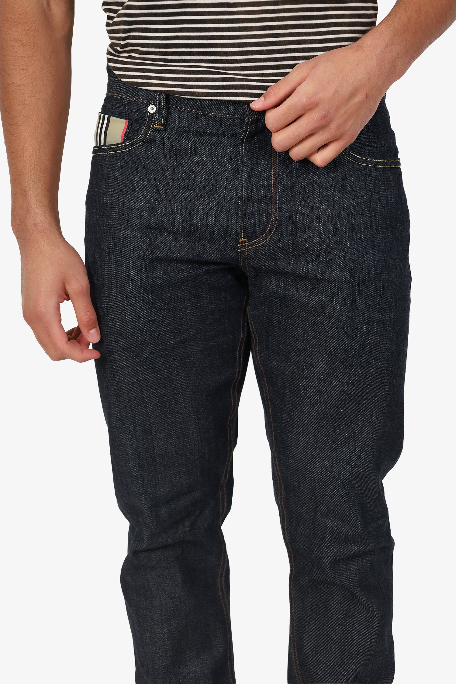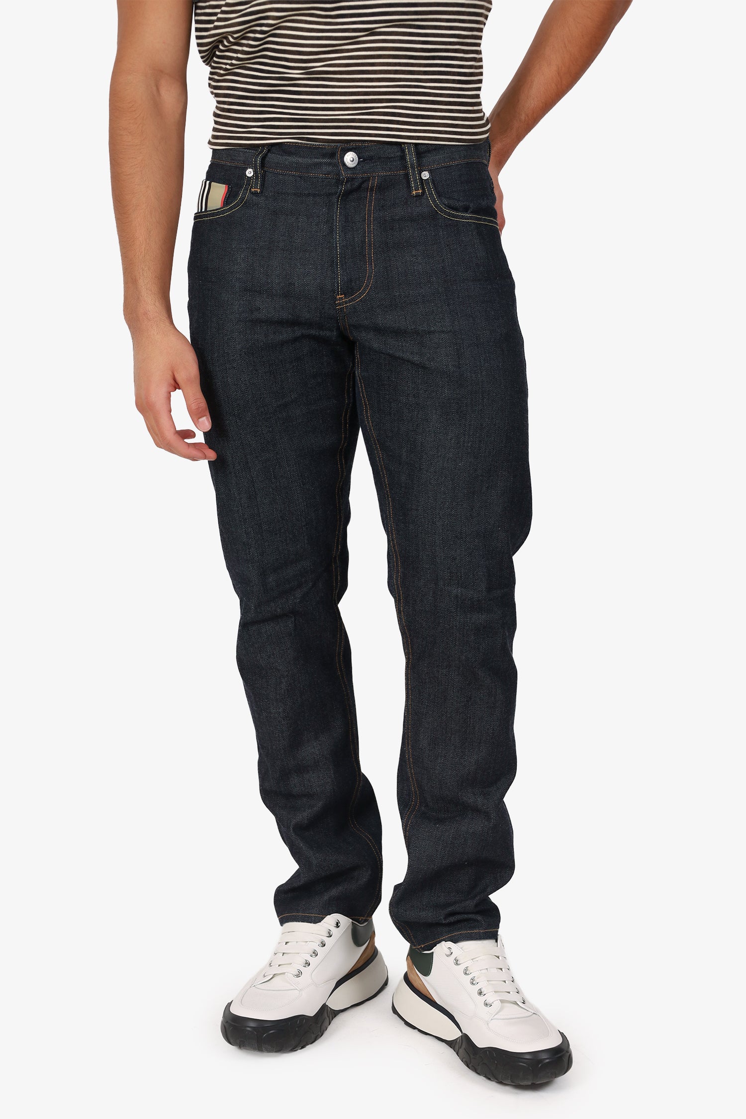 Refresh availabilityBurberry Dark Blue Denim Straight Leg Jeans. Slip on. Front zip with button-up closure. Waistband belt-loops. 5 exterior pockets; 2 front slip, 1 mini compartment, and 2 rear slip. Brass and silver-tone hardware. Contrast stitching.