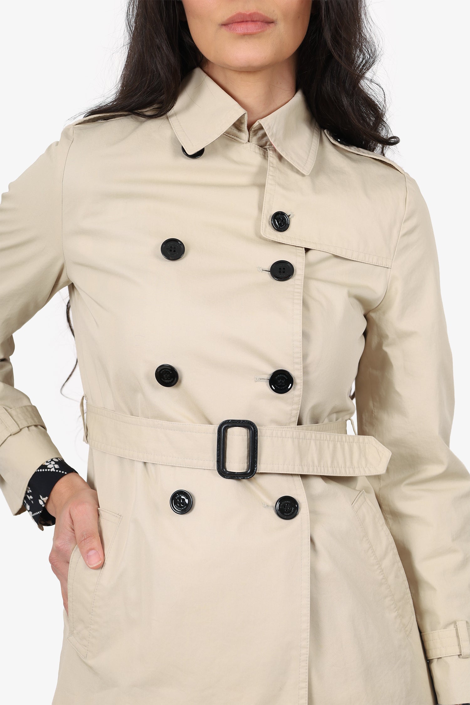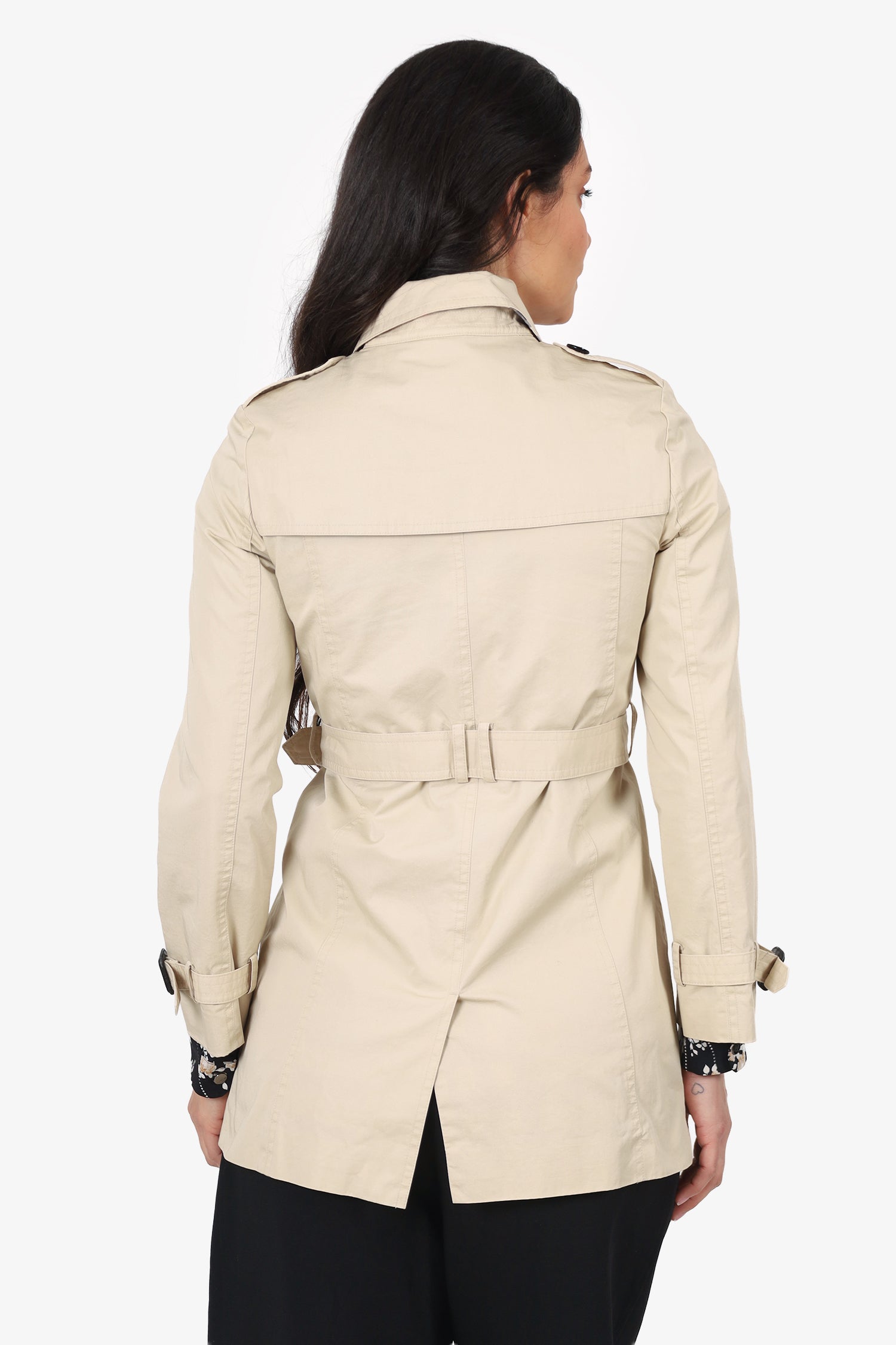 Refresh availabilityBurberry Beige Belted Trench Coat. Pull-on. Collared neckline. Front button-up closure. Removable belt with adjustable pull-through buckle closure. Shoulders with button-up closure. Sleeve cuffs with adjustable pull-through buckle closure. 2 exterior front slip pockets. Single rear slit. Lined interior. Tonal stitching.