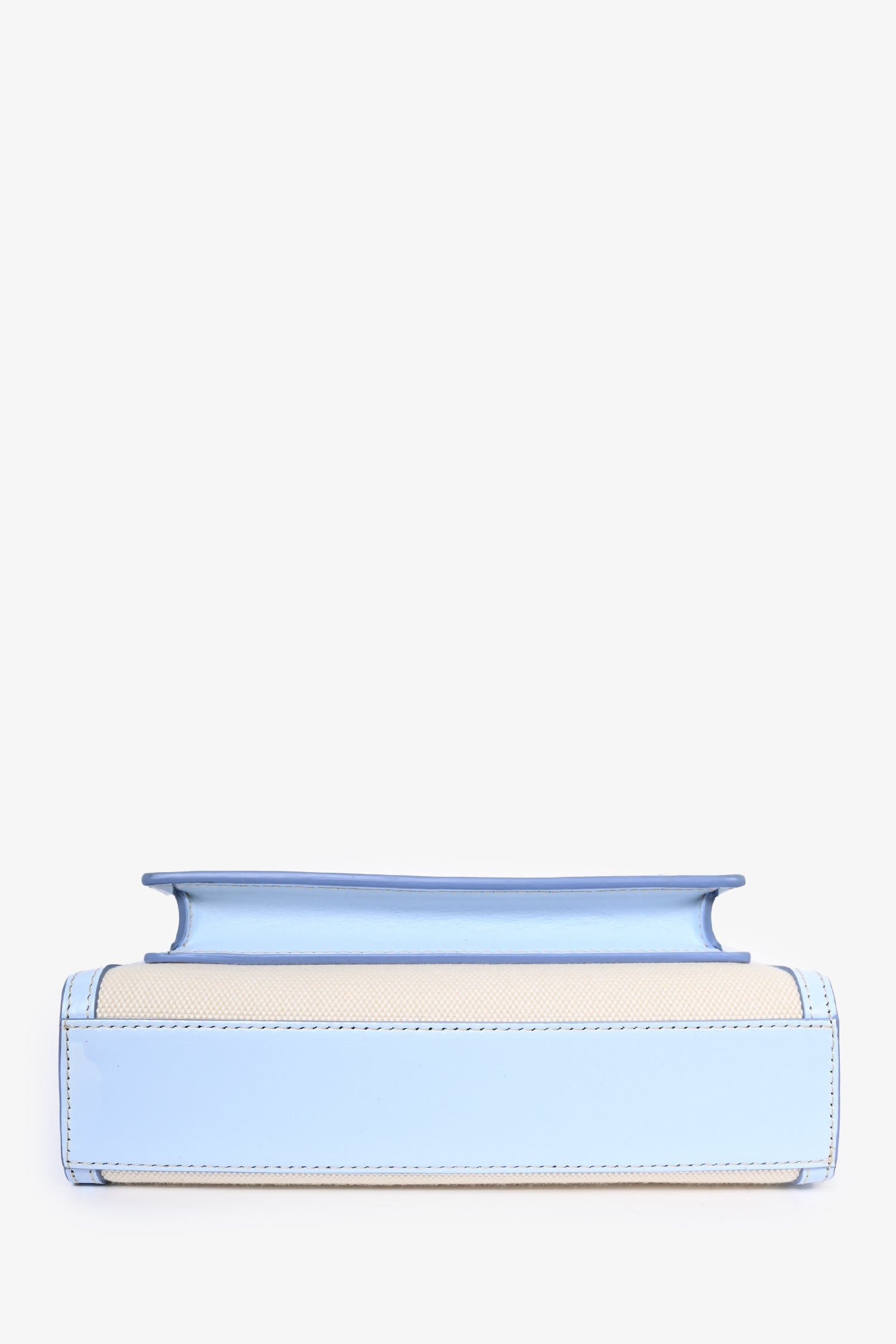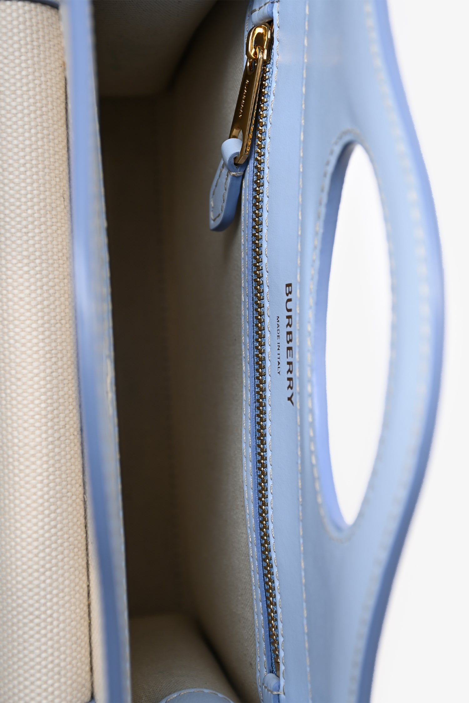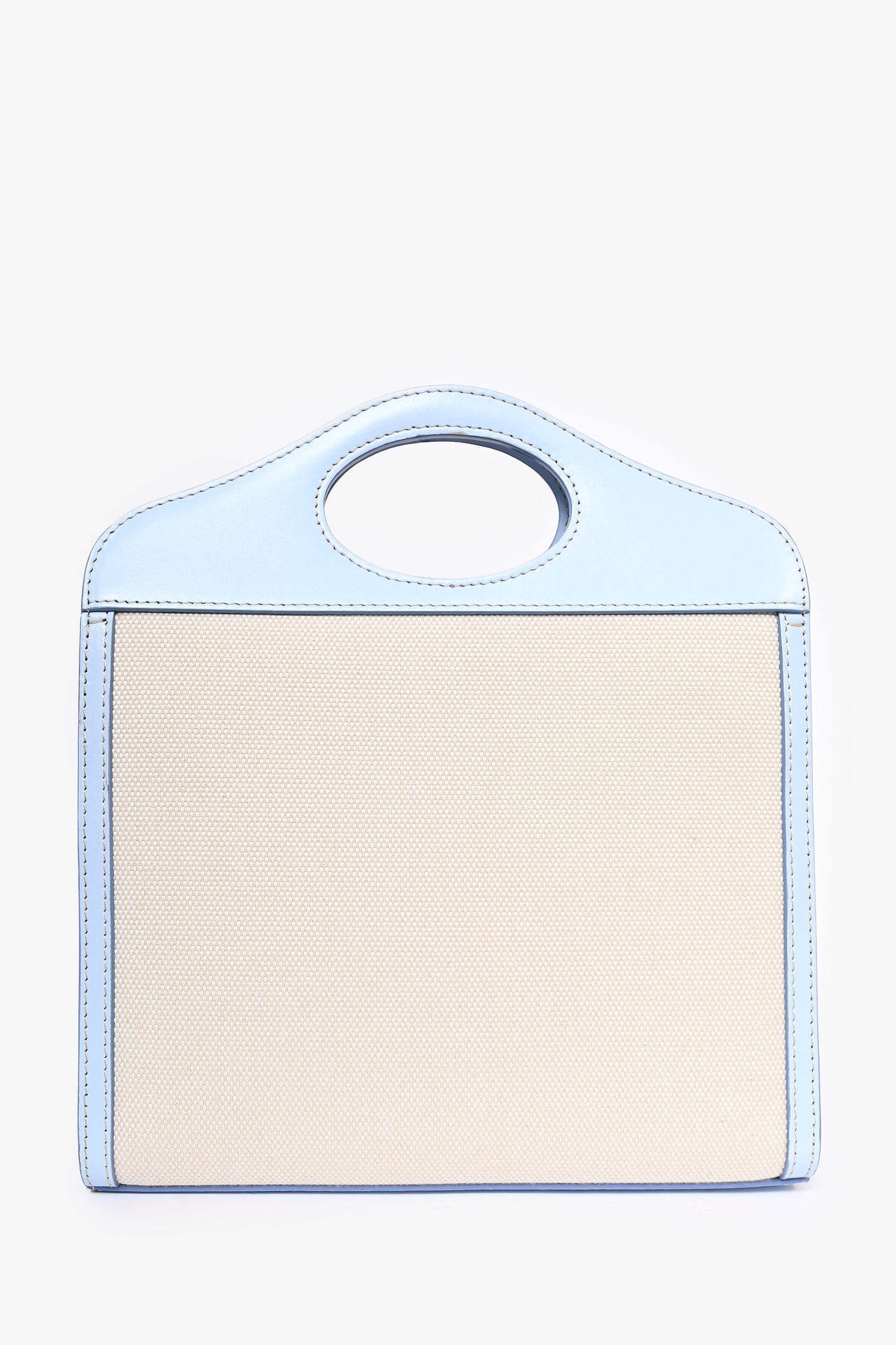Burberry Beige/Burberry Leather Mini Pocket Top Handle Bag with Strap. Front pocket with fold-over flap and magnetic button closures. Cream leather interior. Single interior wall zip pocket. Removable and adjustable strap. Gold-tone hardware.
