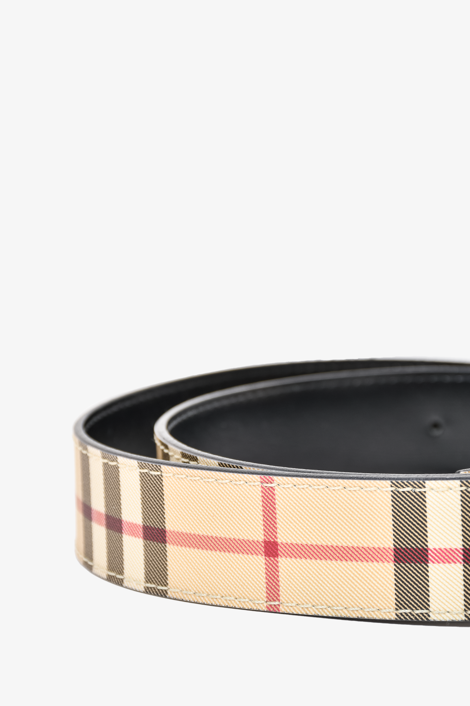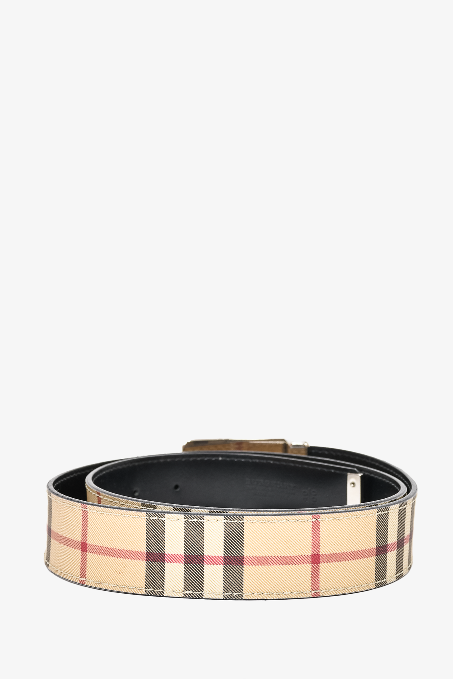 Refresh availabilityBurberry Beige Check Coated Canvas Belt with Silver Buckle. Push tab buckle closure. Tonal stitching.
