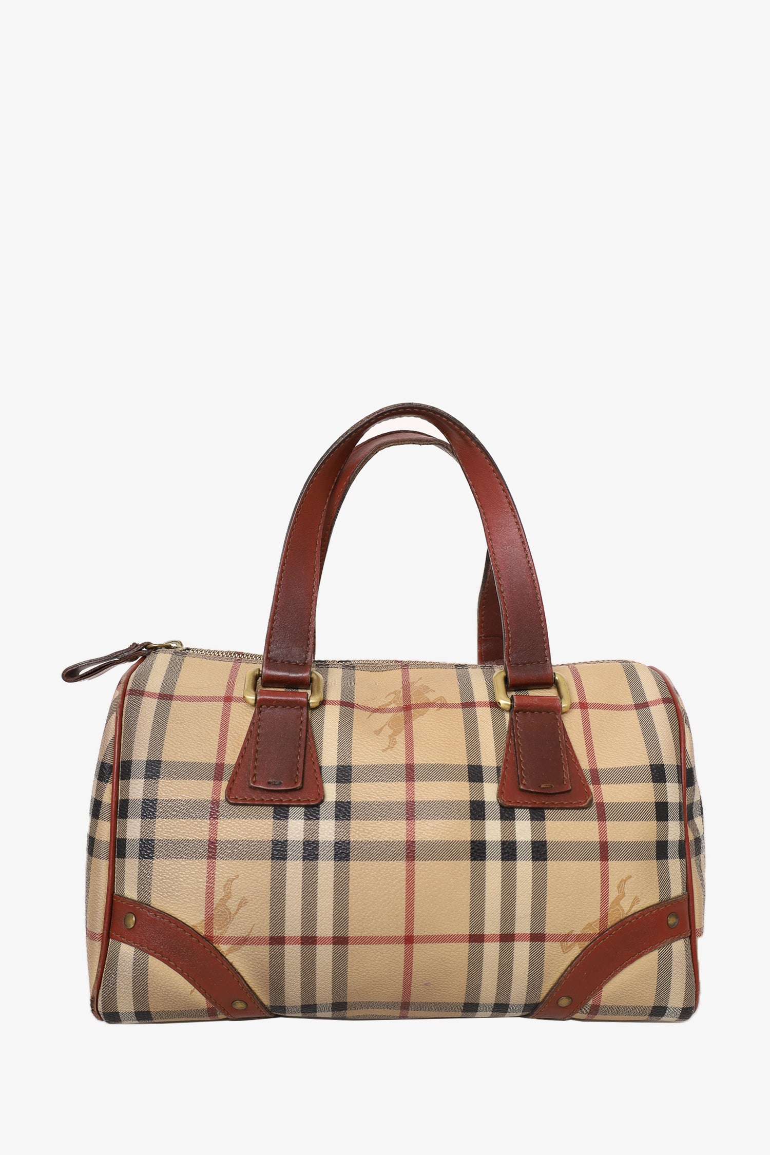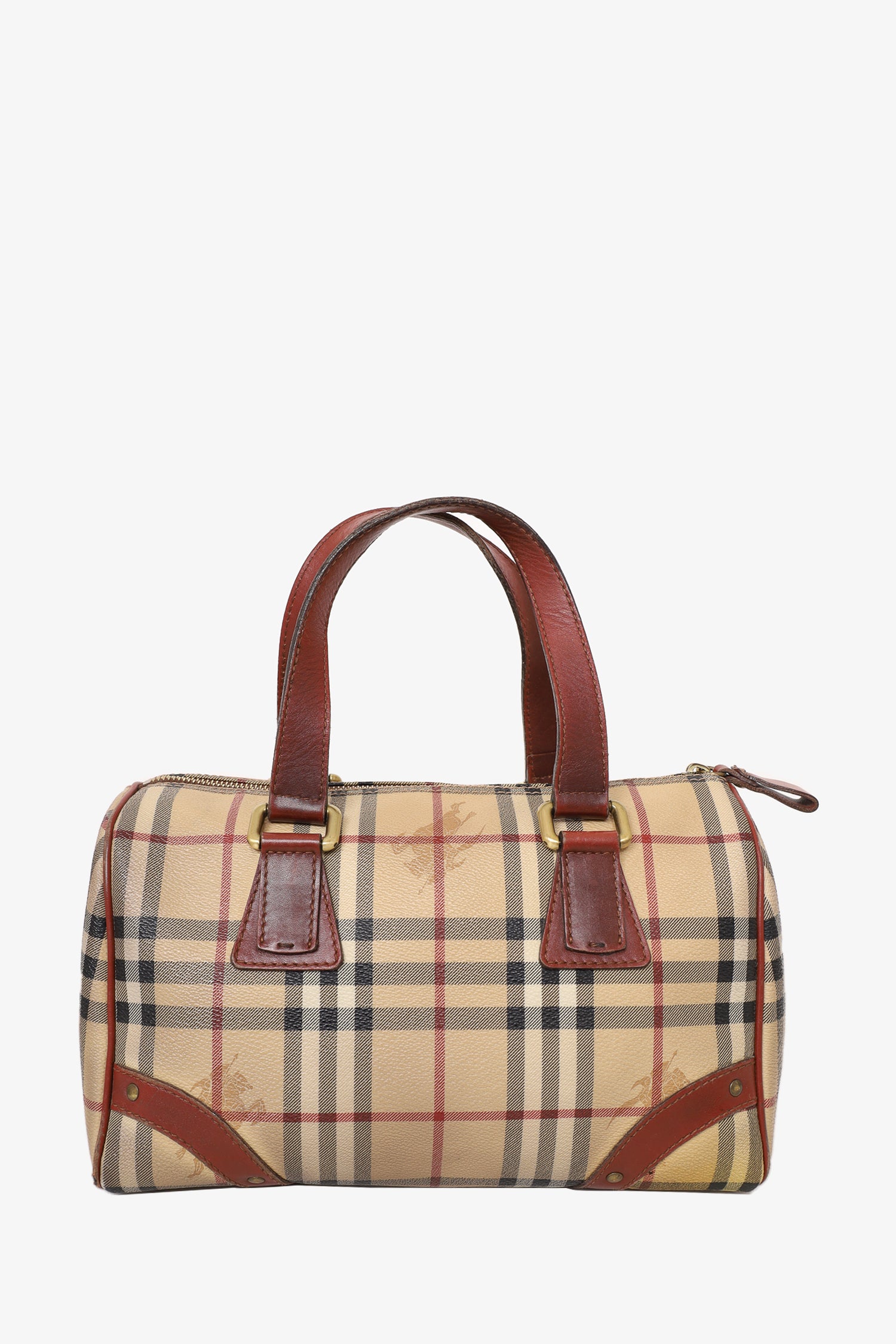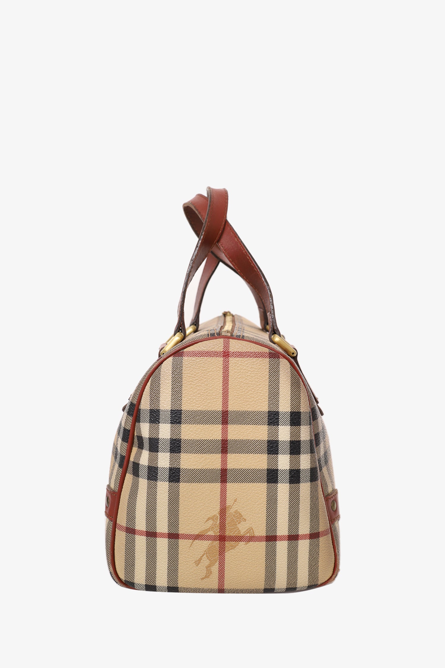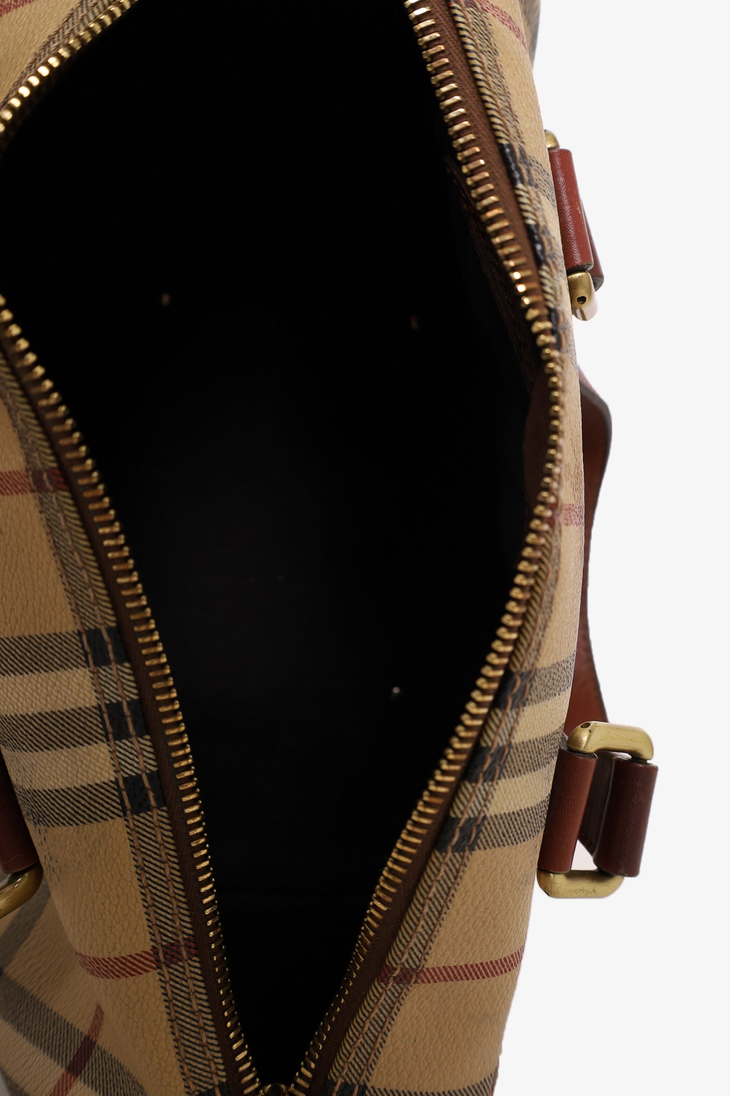 Burberry Beige Check Coated Canvas Bowling Bag. Top zip closure. 1 interior slip pocket. Top handle. Gold-tone hardware. Tonal stitching.