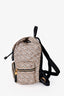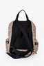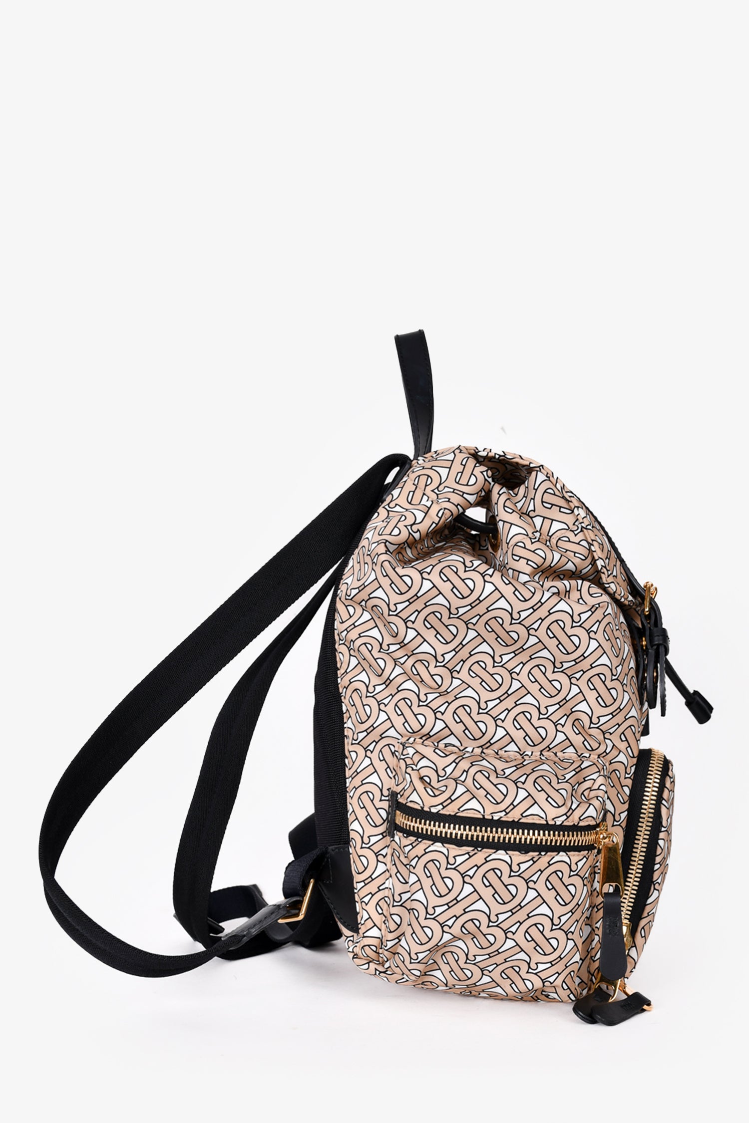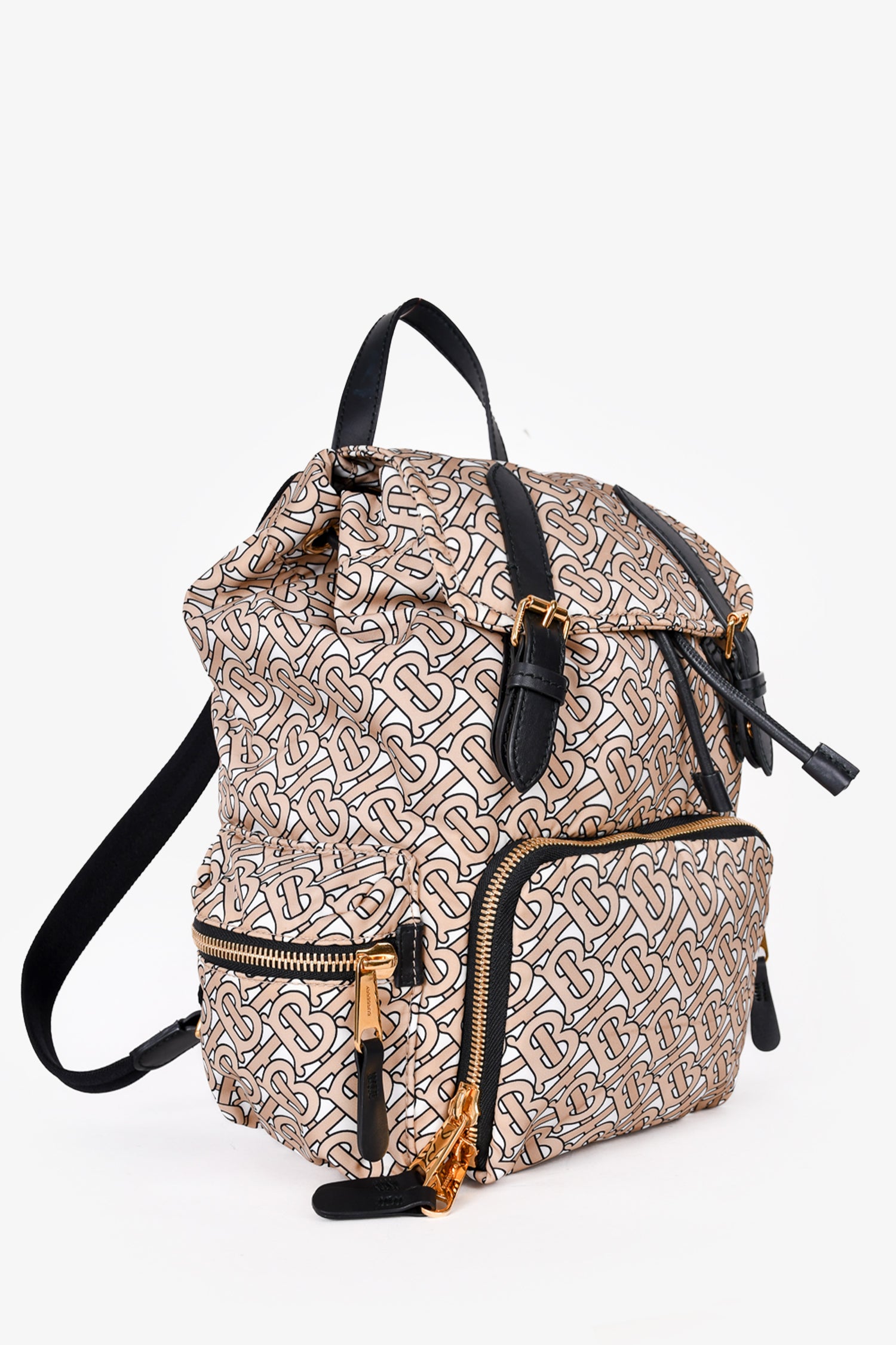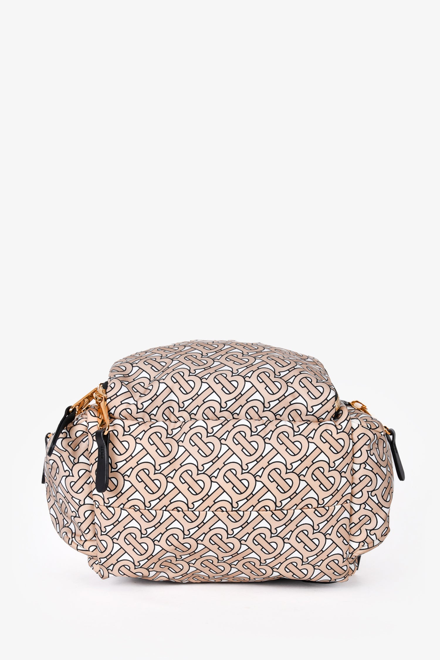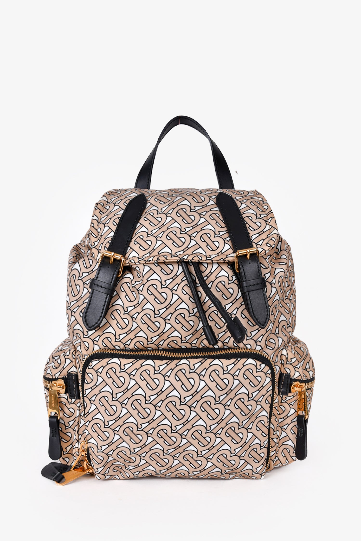 Refresh availabilityBurberry Beige Leather TB Monogram Backpack. Front fold over flap with button closures. 3 exterior zip pockets. Gold-toned hardware. Tonal stitching.