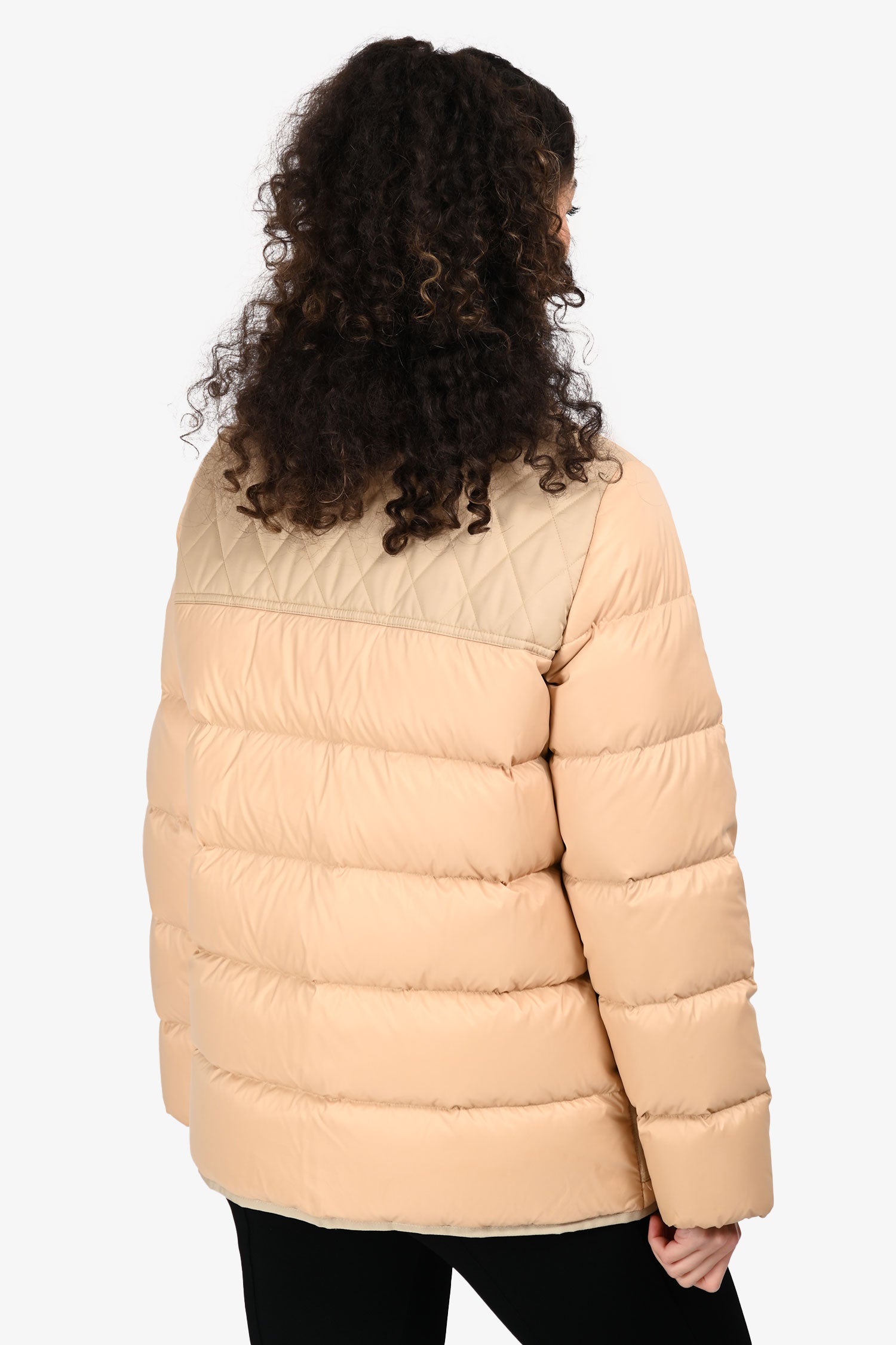 Refresh availabilityBurberry Beige Quilted Detail Down Jacket. Slip-on. Collared neckline. Front 2-way zip closure with snap placket. 2 exterior flap pockets with snap closures; 1 interior slip pocket with snap closure. Gold-tone hardware. Tonal stitching.