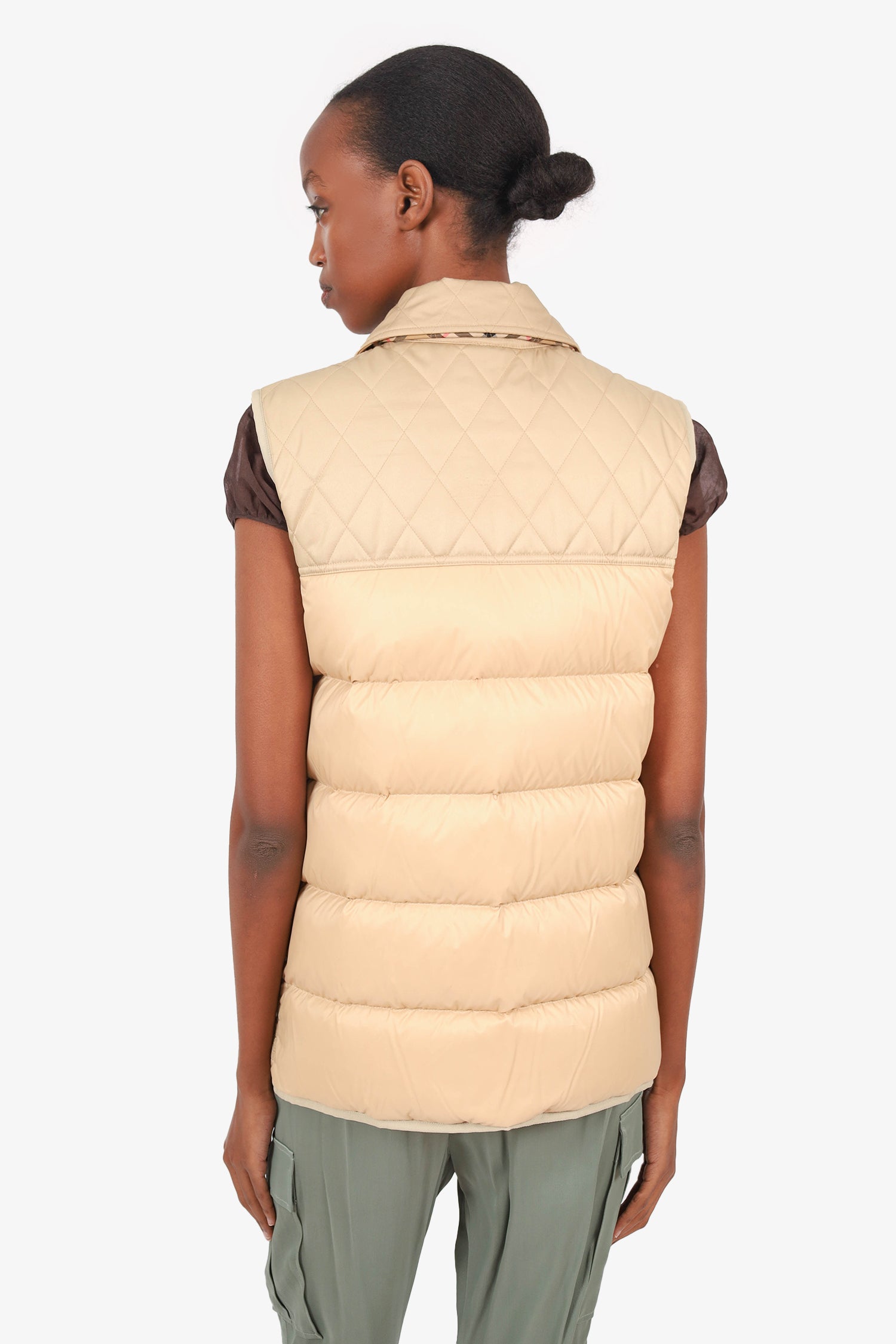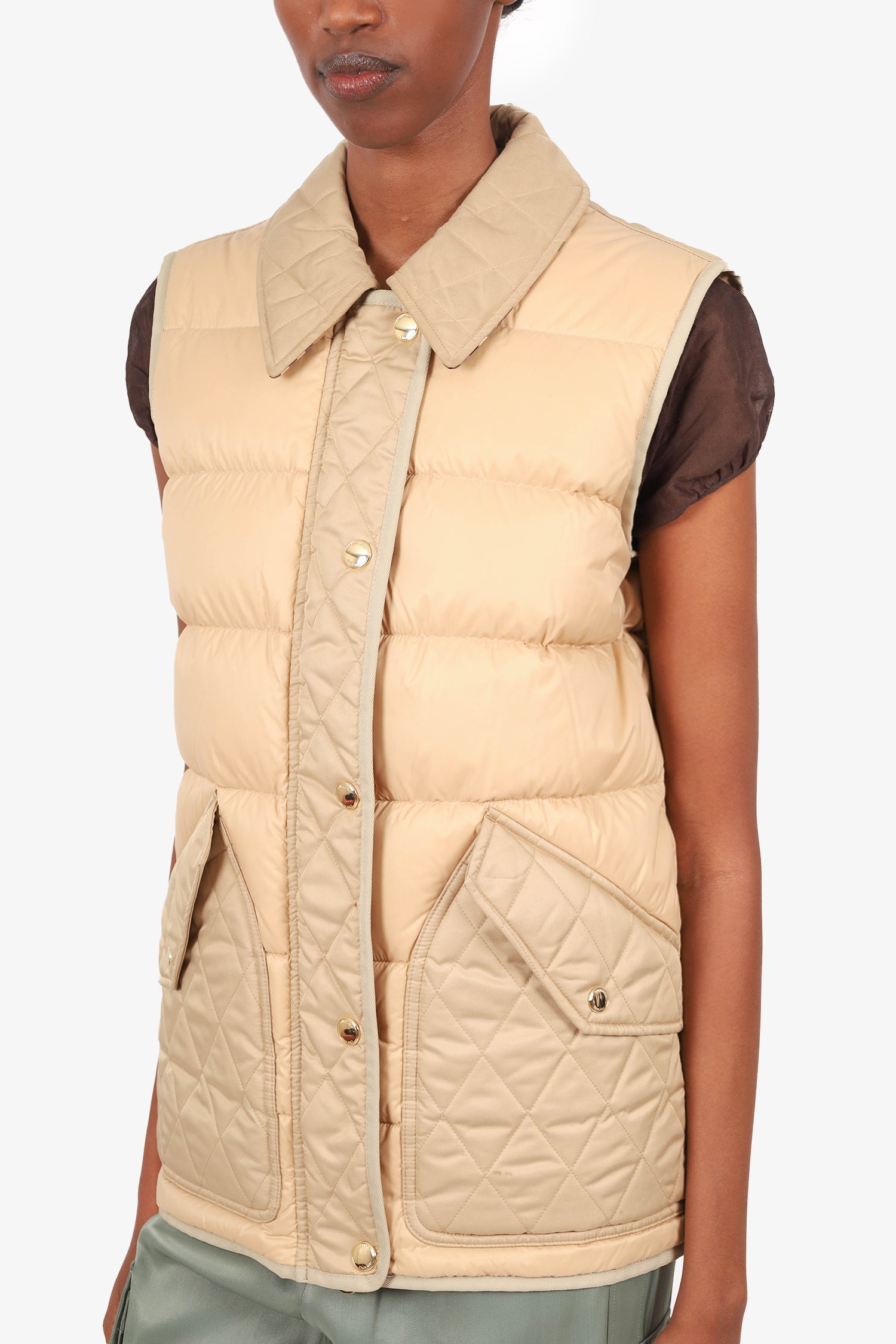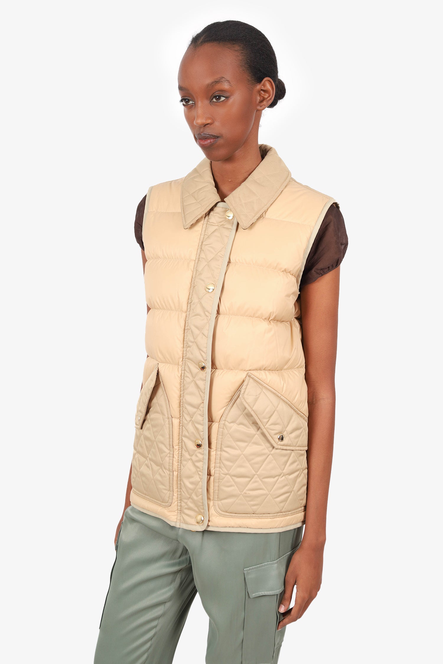 Refresh availabilityBurberry Beige Quilted Puffer Vest. Front zip and snap button closure. Front pocket with snap button closure. Gold-tone hardware. Tonal stitching.