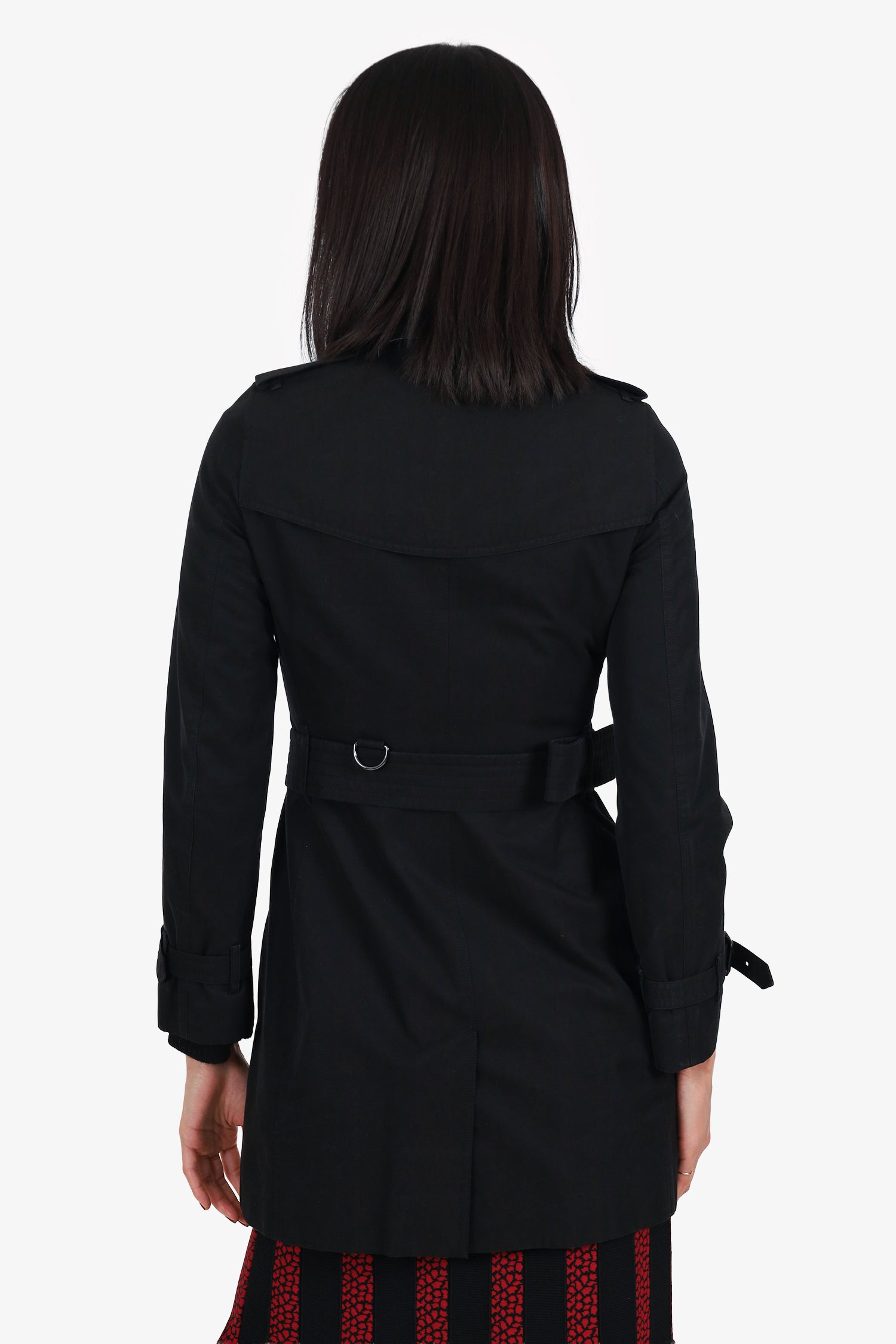 Refresh availabilityBurberry Black Belted Trench Coat. Pull-on. Collared-neckline with hook closure. Front button-up closure. Removable belt with adjustable pull-through buckle closure. Epaulettes with button-up closure at shoulder. Straps at sleeve cuffs with adjustable buckle closure. 2 exterior slip pockets. Single rear vent. Lined interior. Tonal hardware. Tonal stitching.