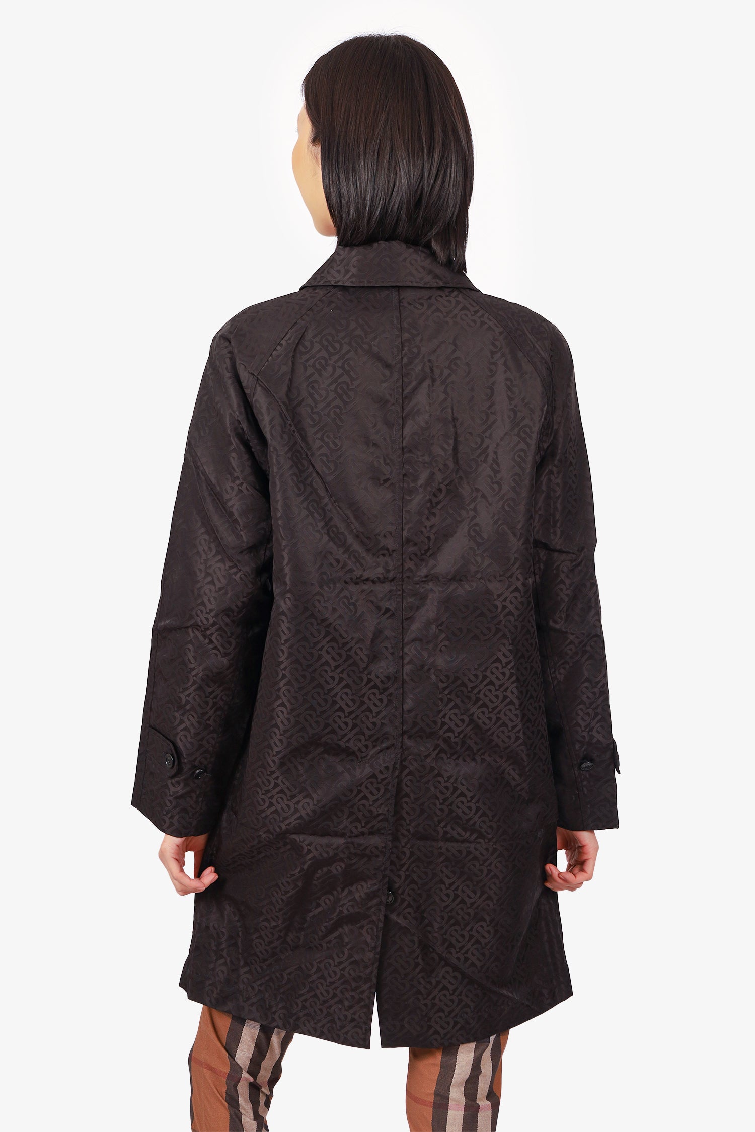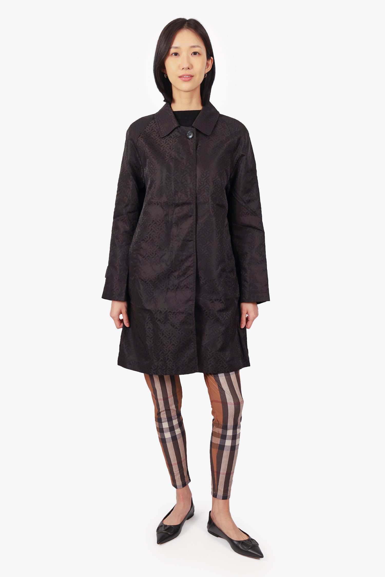 Refresh availabilityBurberry Black Camden TB Logo Monogram Car Coat. Collared-neckline. Front button-up closure. Button-up sleeve cuff closure. 2 front exterior side slip pocket with button closure. Single rear vent. Strap piece at sleeve cuff with button closure. Partially lined interior.