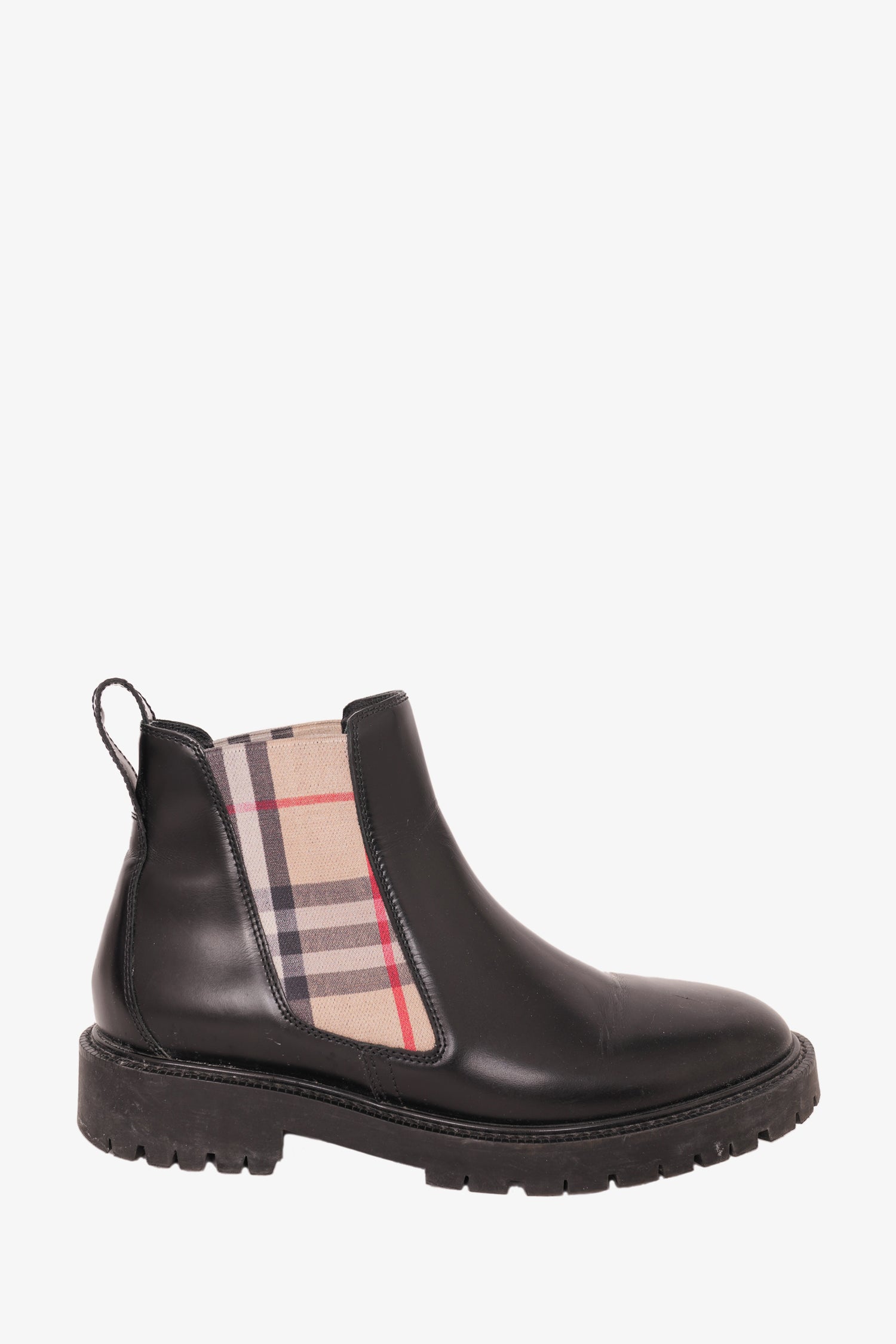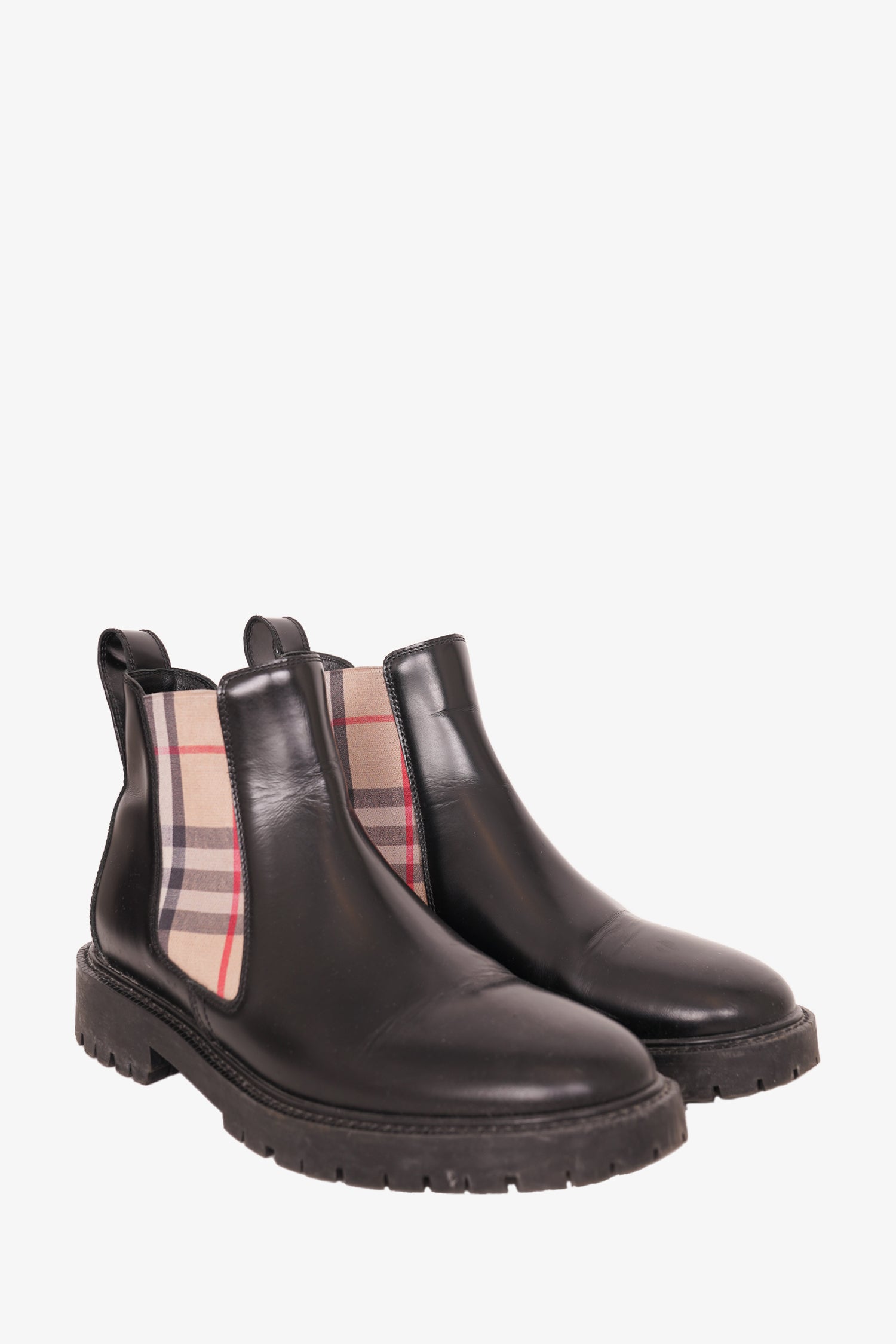 Refresh availabilityBurberry Black Check Leather Chelsea Boots. Elasticated Burberry Nova Check pattern. Tonal stitching. Round-toe. Pull tab. Tonal stitching.