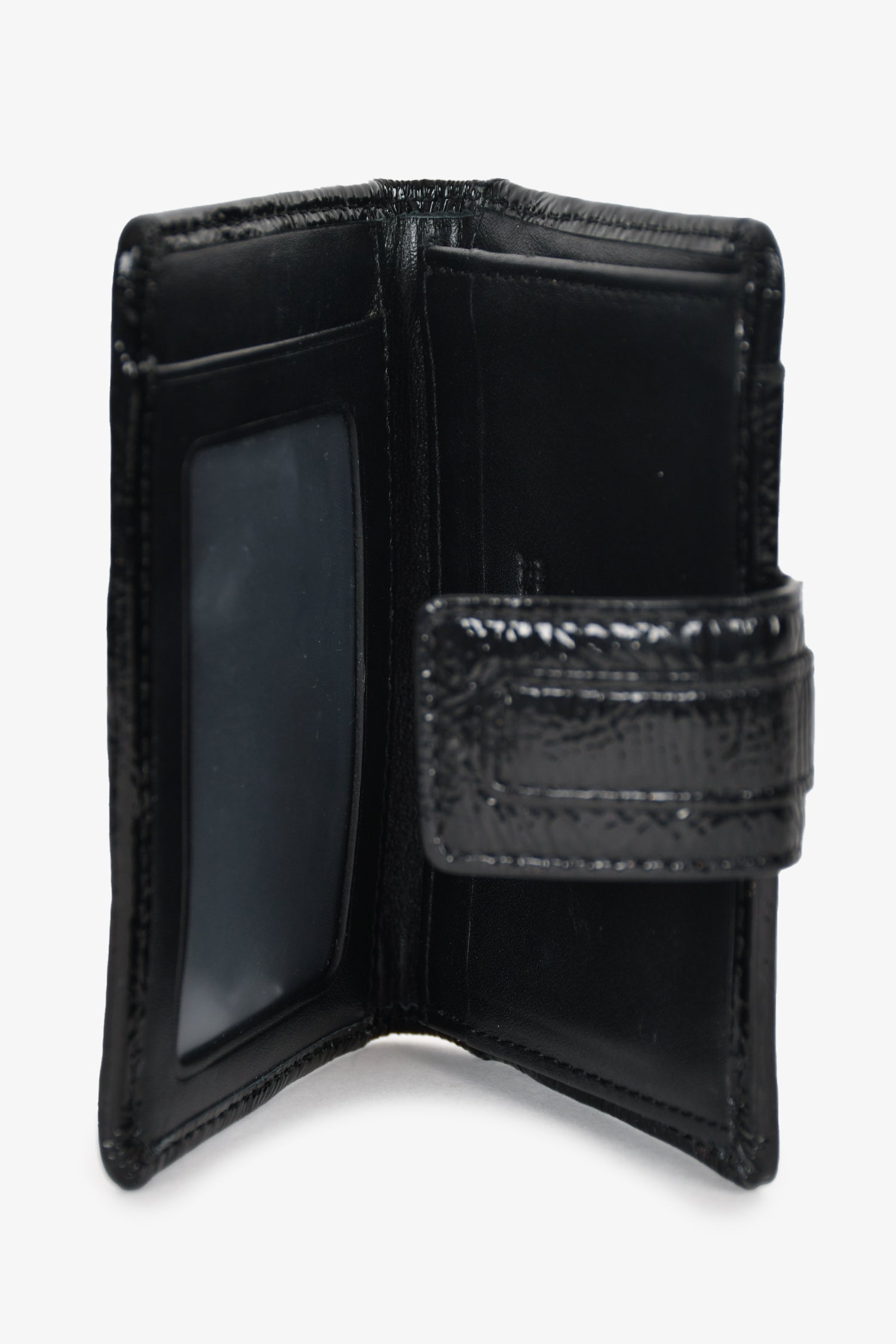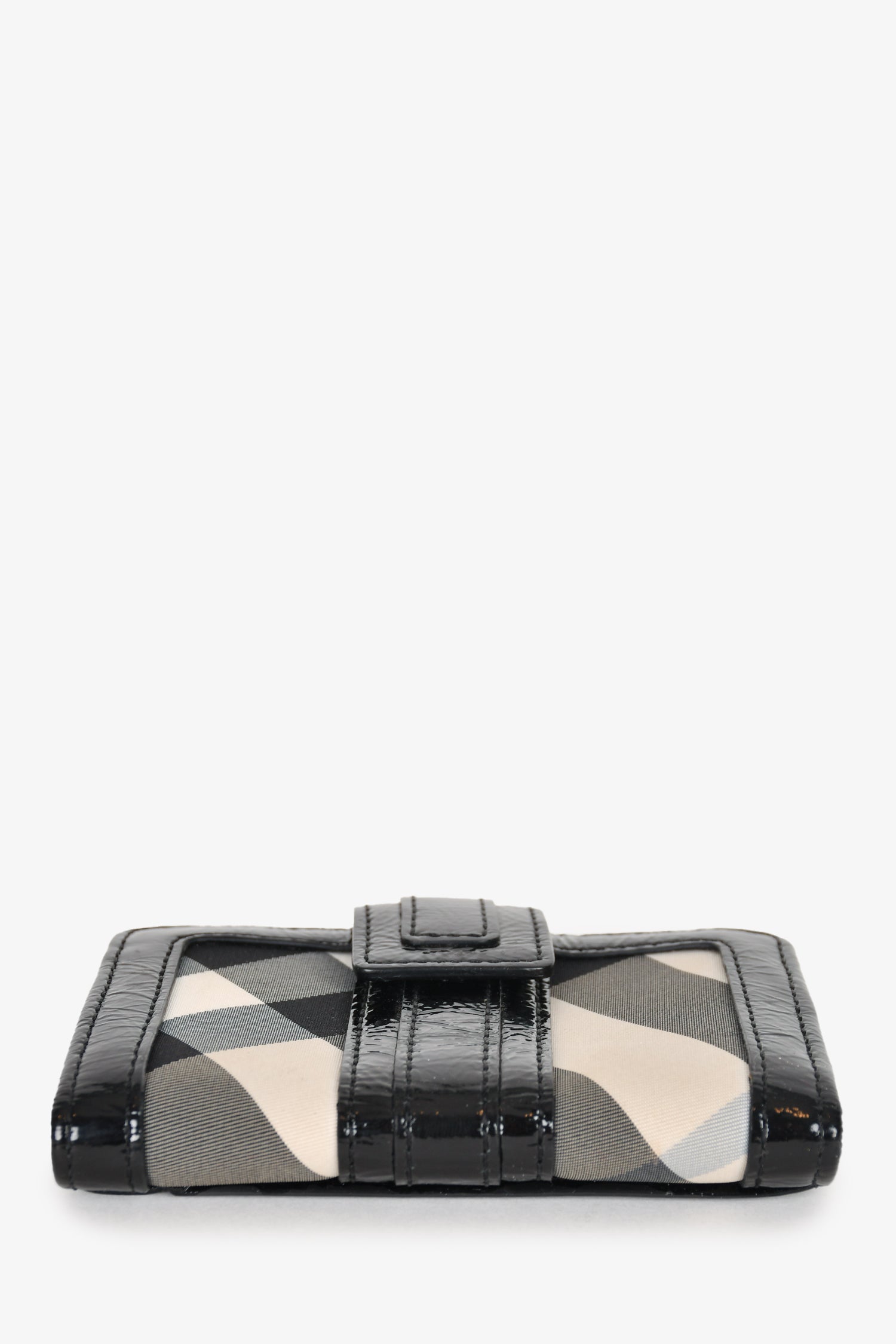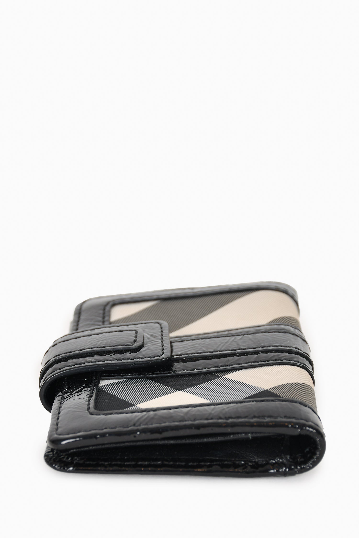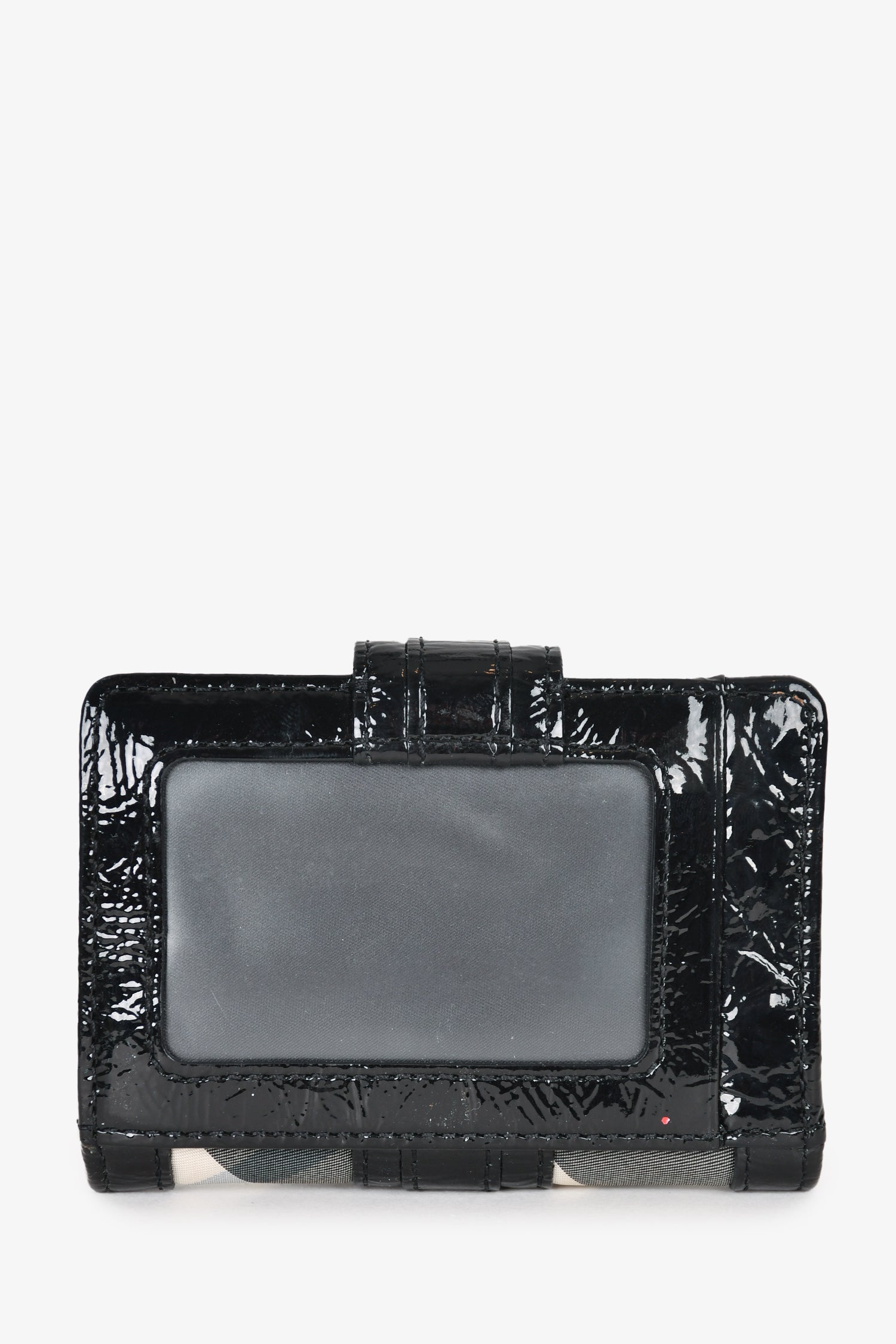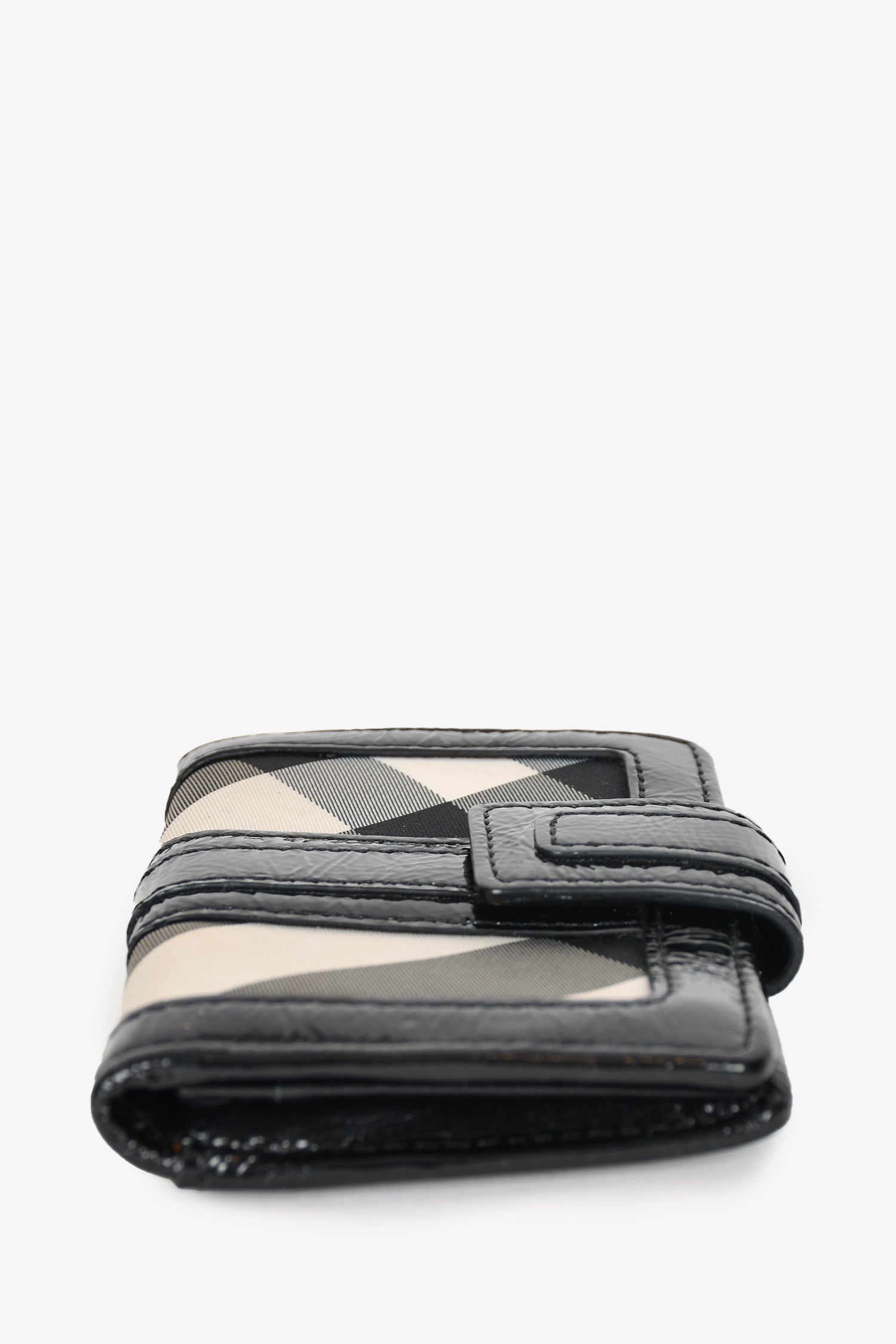 Refresh availabilityBurberry Black/Cream Patent Leather Compact Wallet. Snap closure. 3 card slots. 2 slip pockets. Tonal stitching.