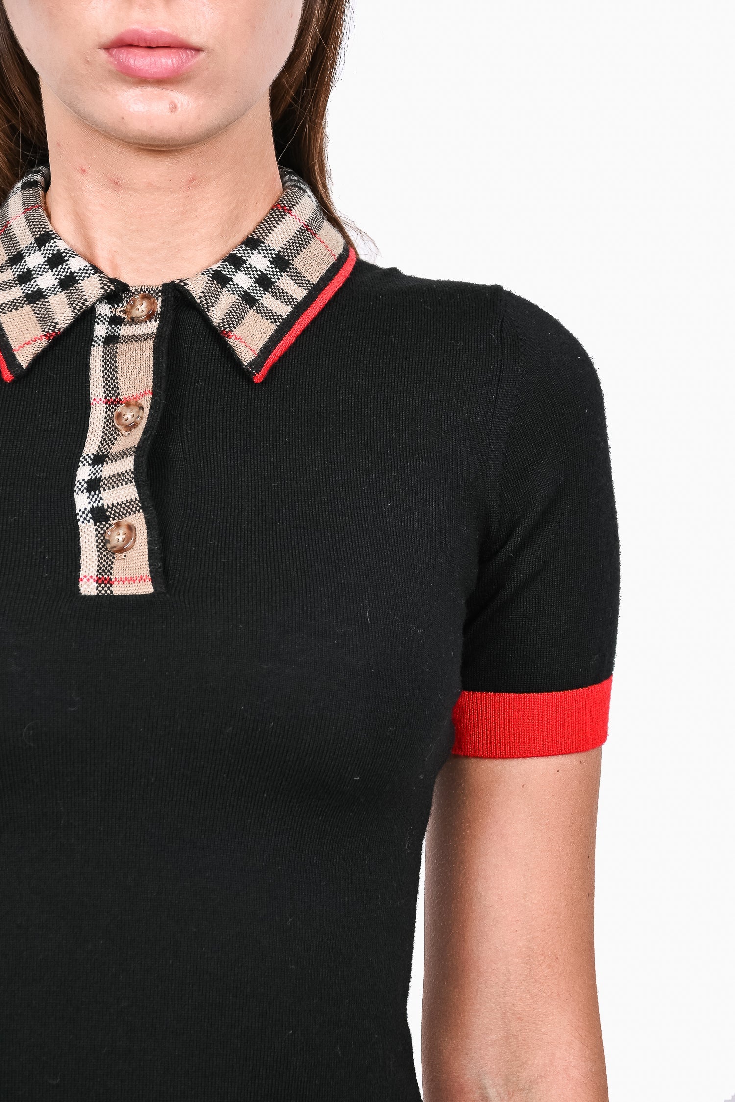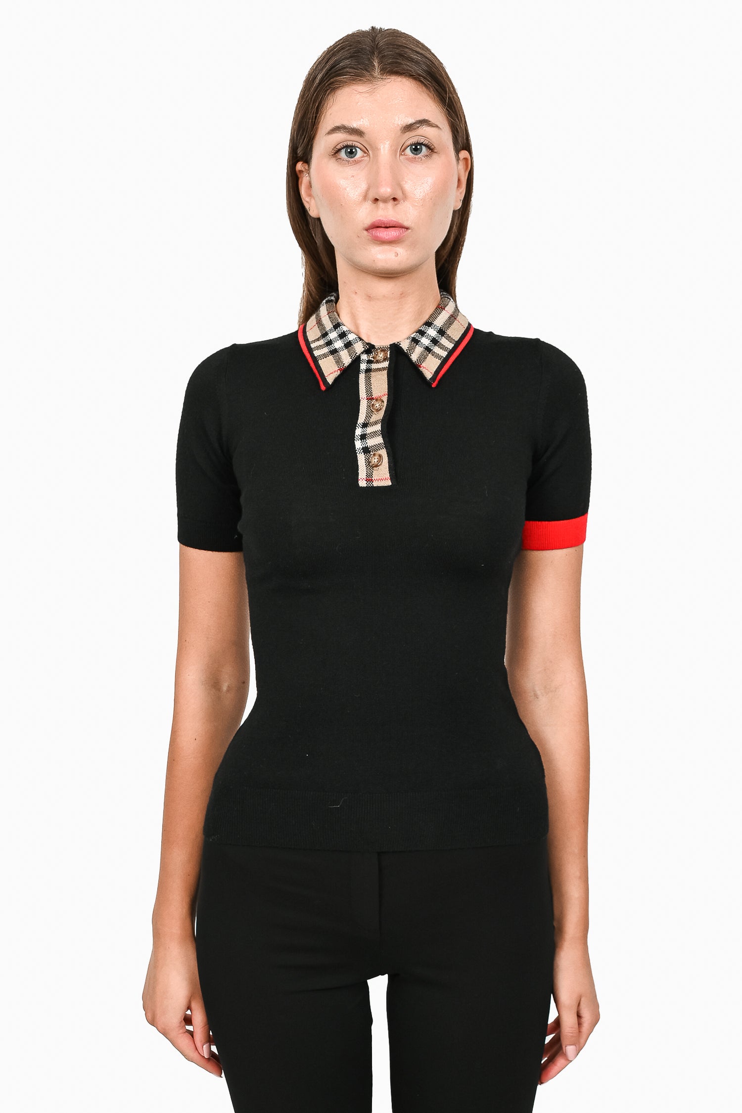Refresh availabilityBurberry Black Knit Nova Check Collared Polo Top. Front button-up closure. Tonal stitching.