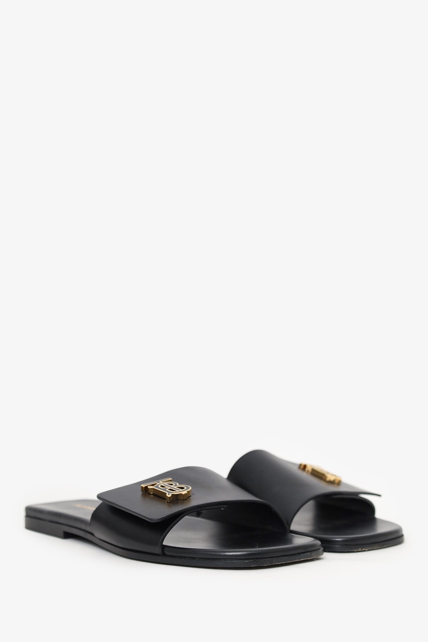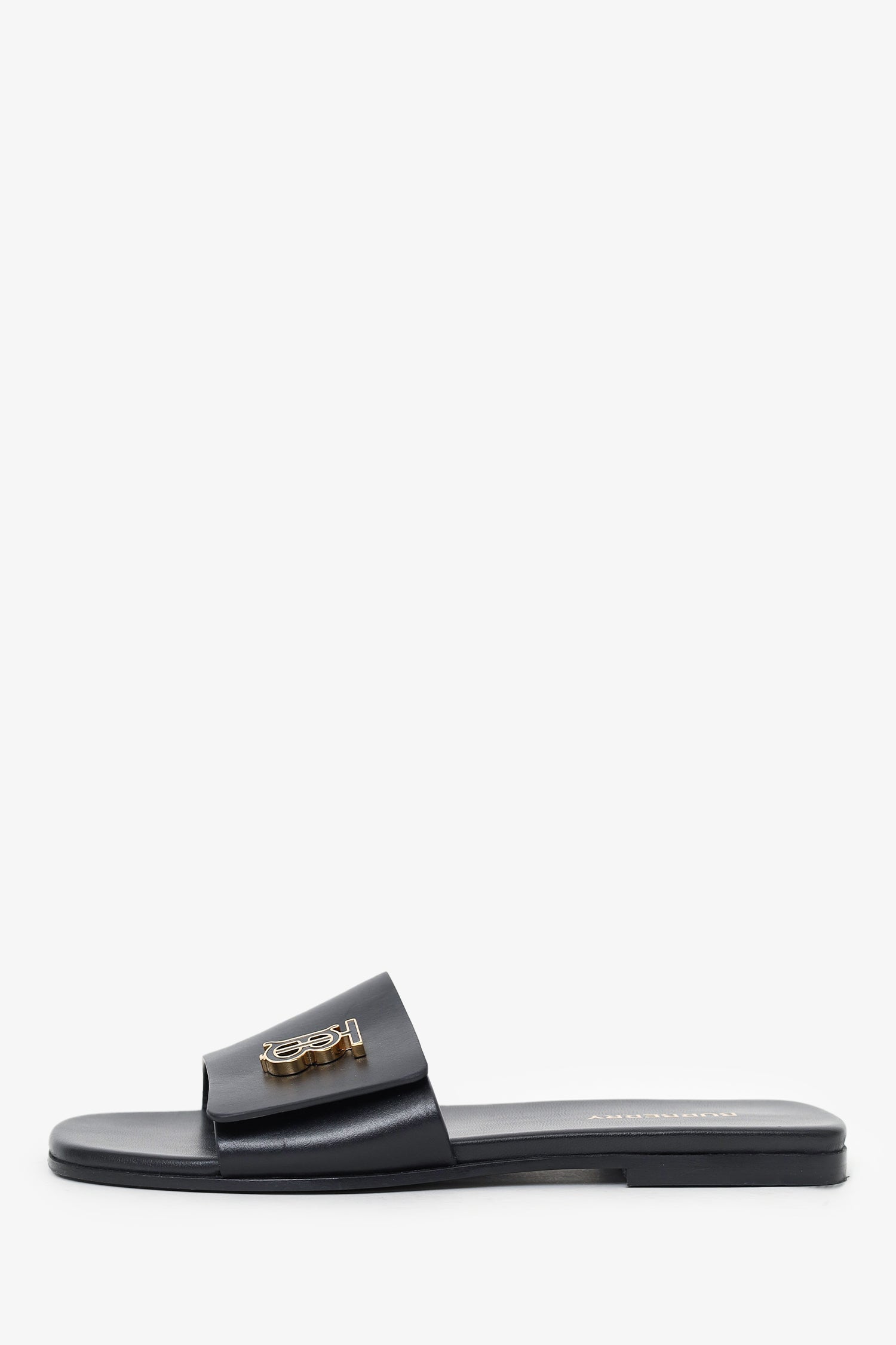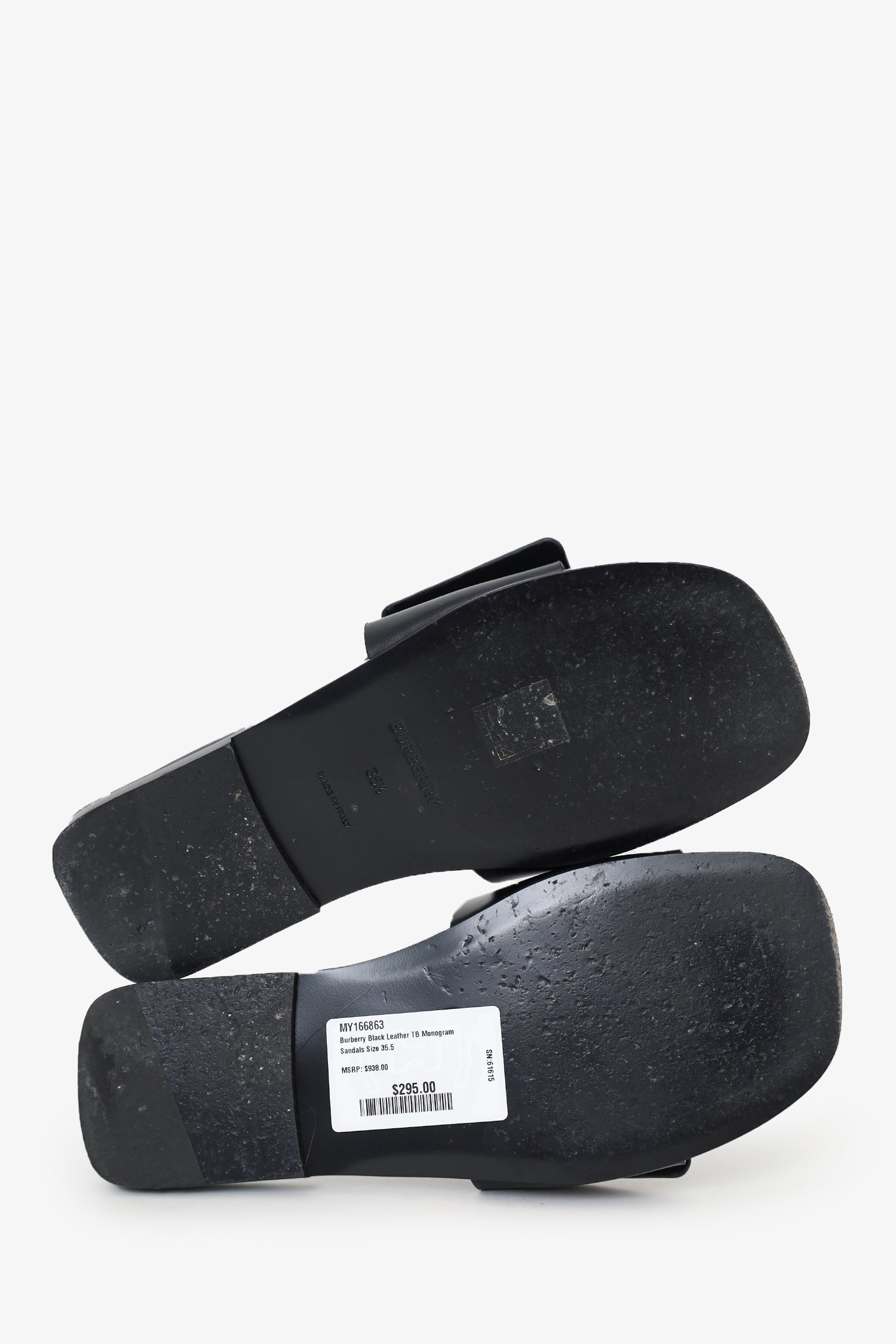 Refresh availabilityBurberry Black Leather TB Monogram Sandals. Slip-on. Open-squared toe. Gold-tone hardware. Tonal stitching.