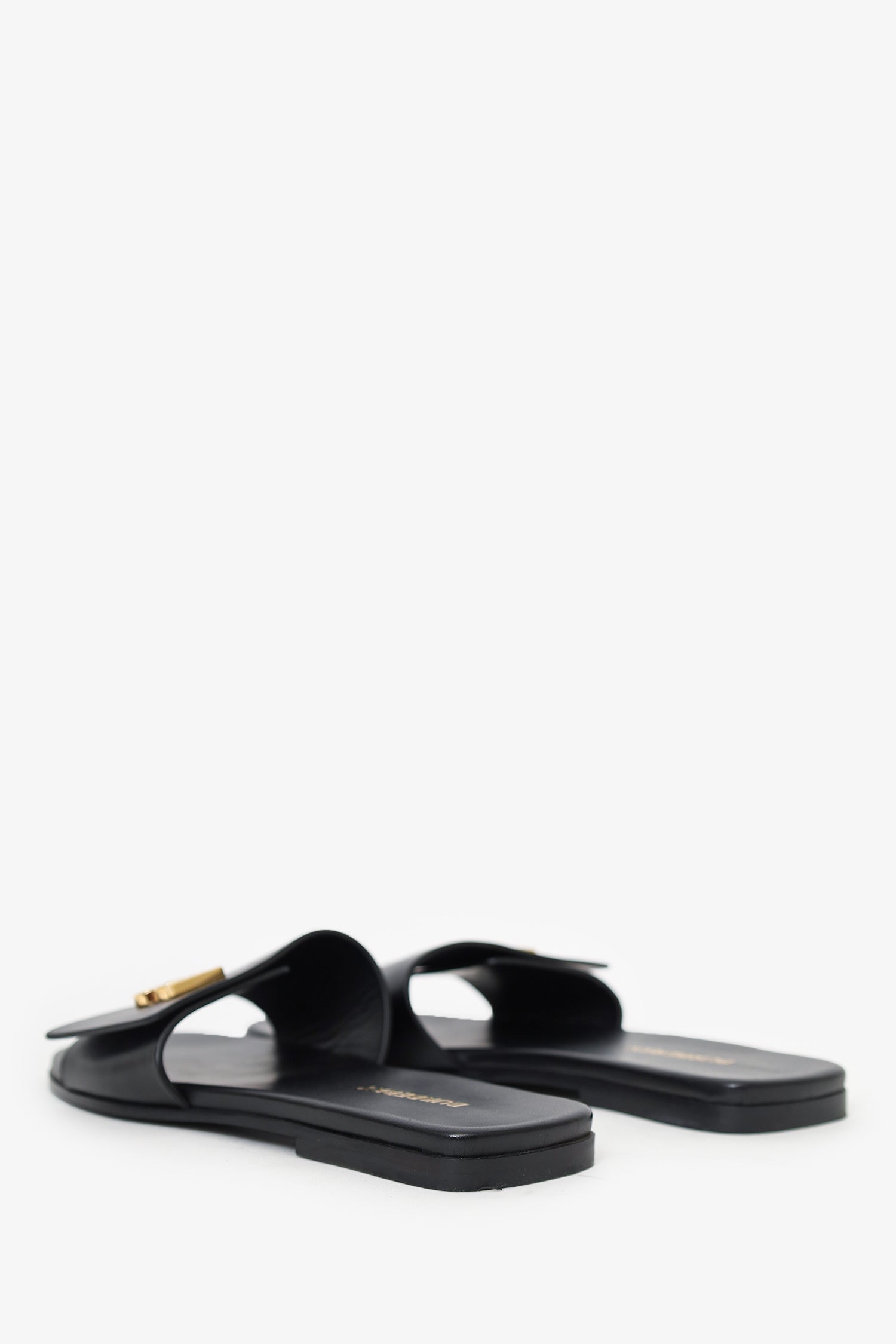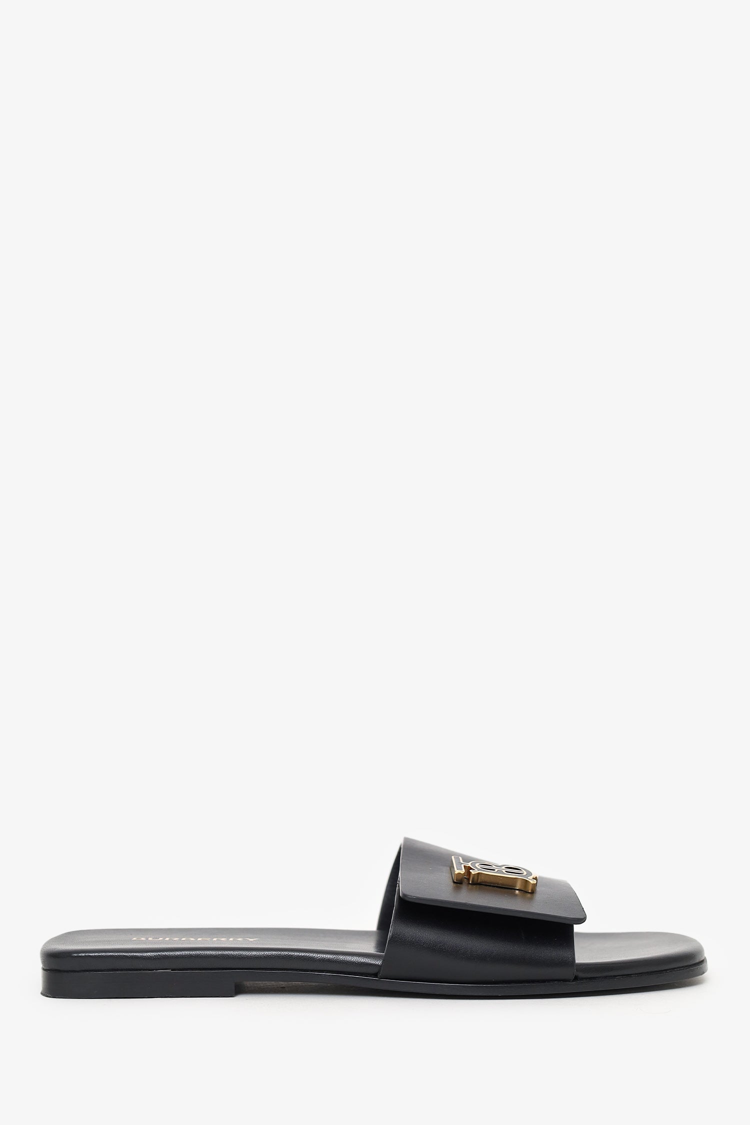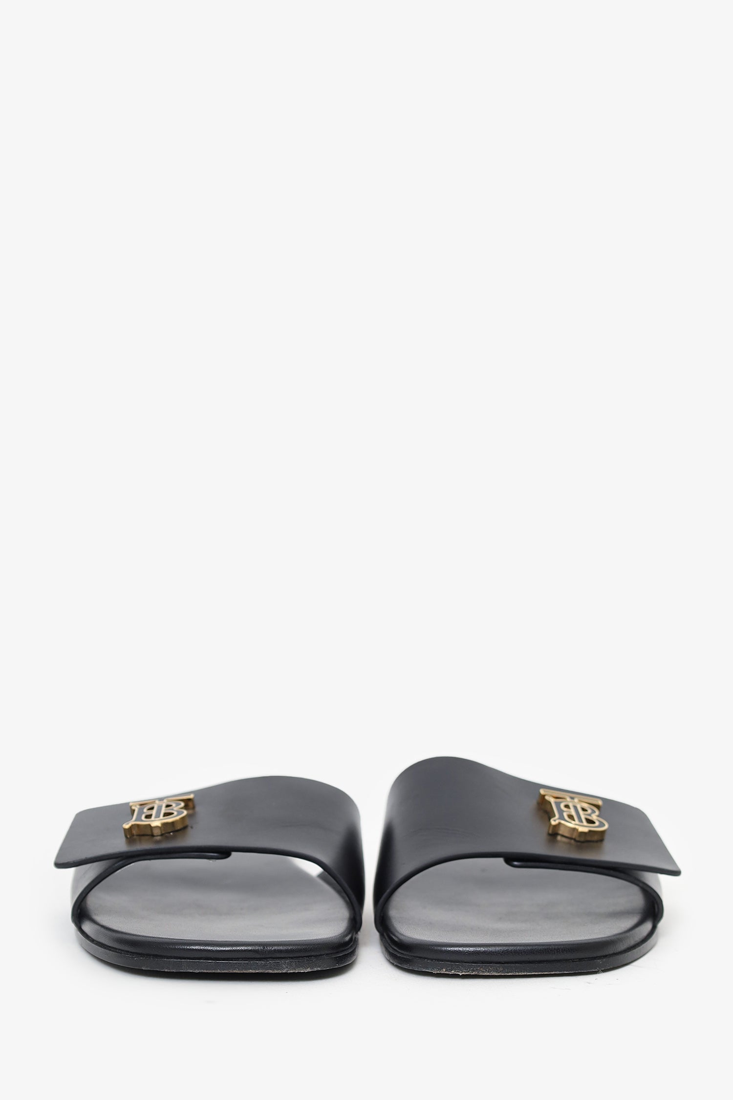 Refresh availabilityBurberry Black Leather TB Monogram Sandals. Slip-on. Open-squared toe. Gold-tone hardware. Tonal stitching.