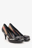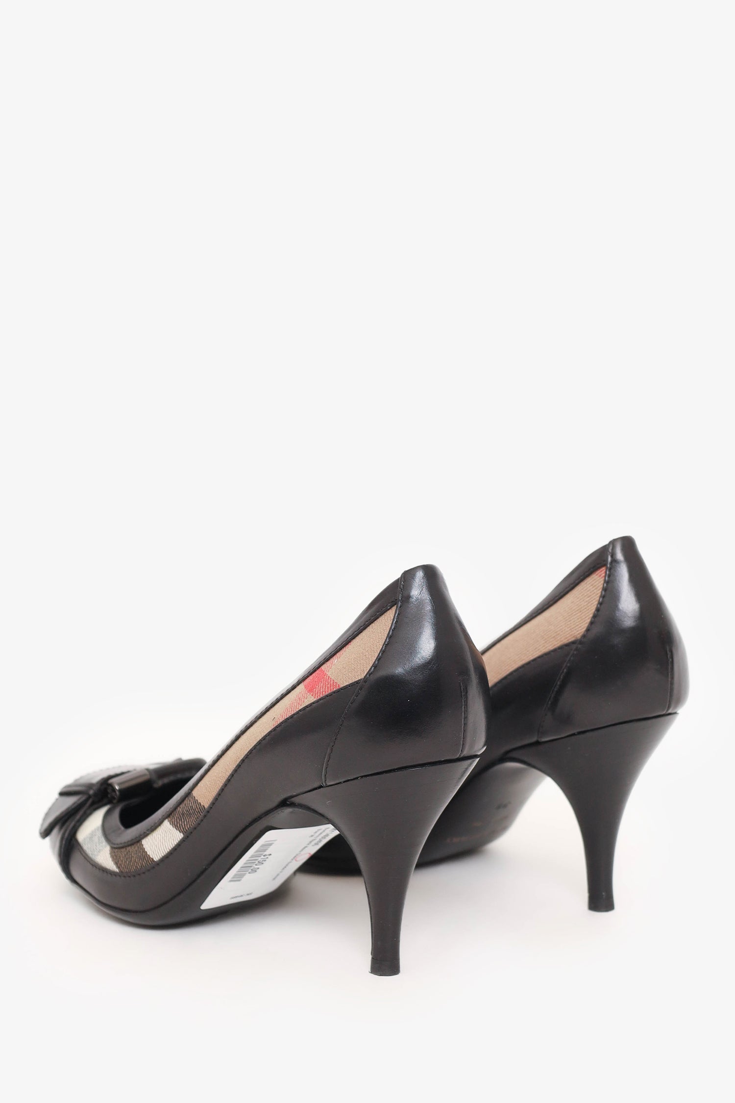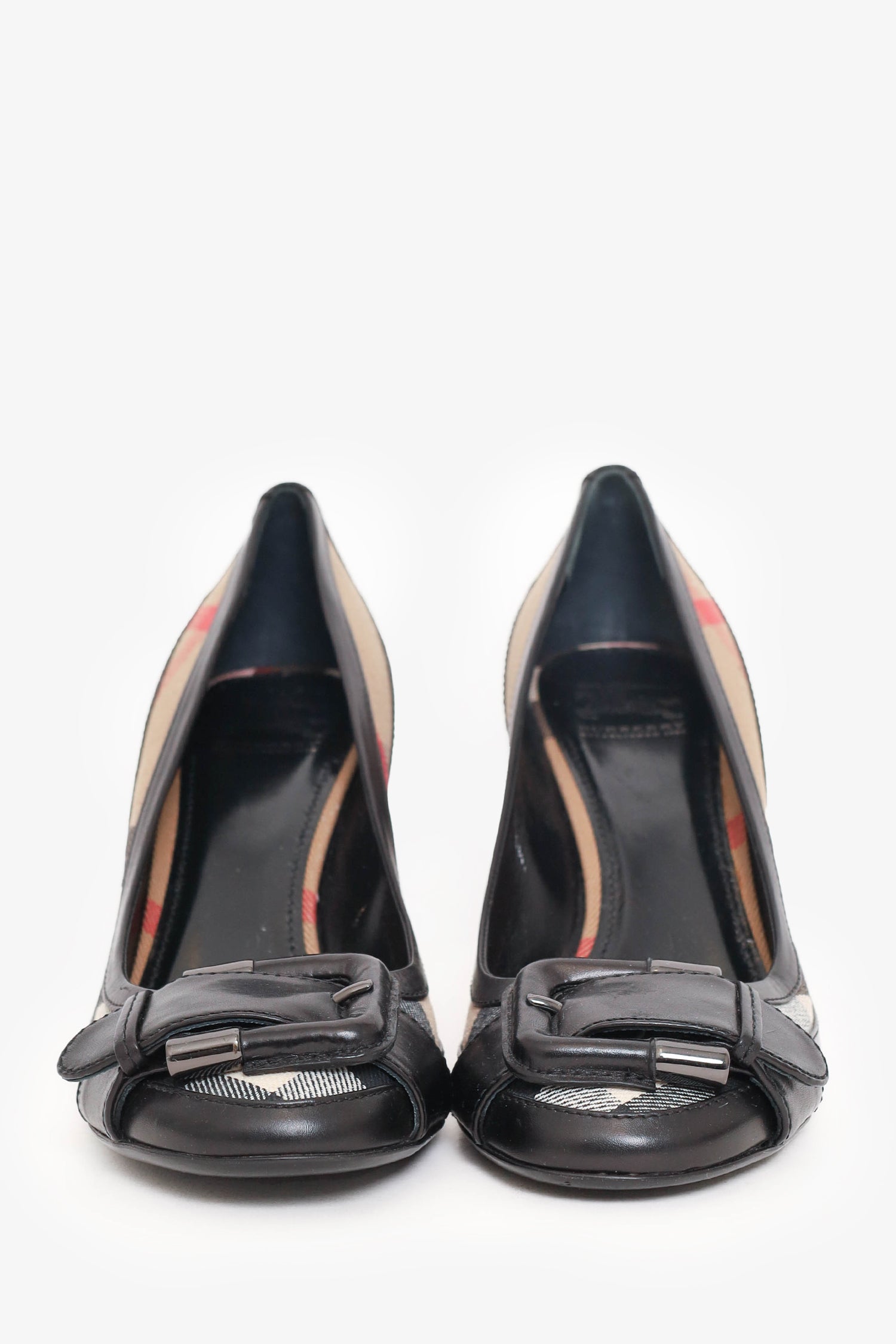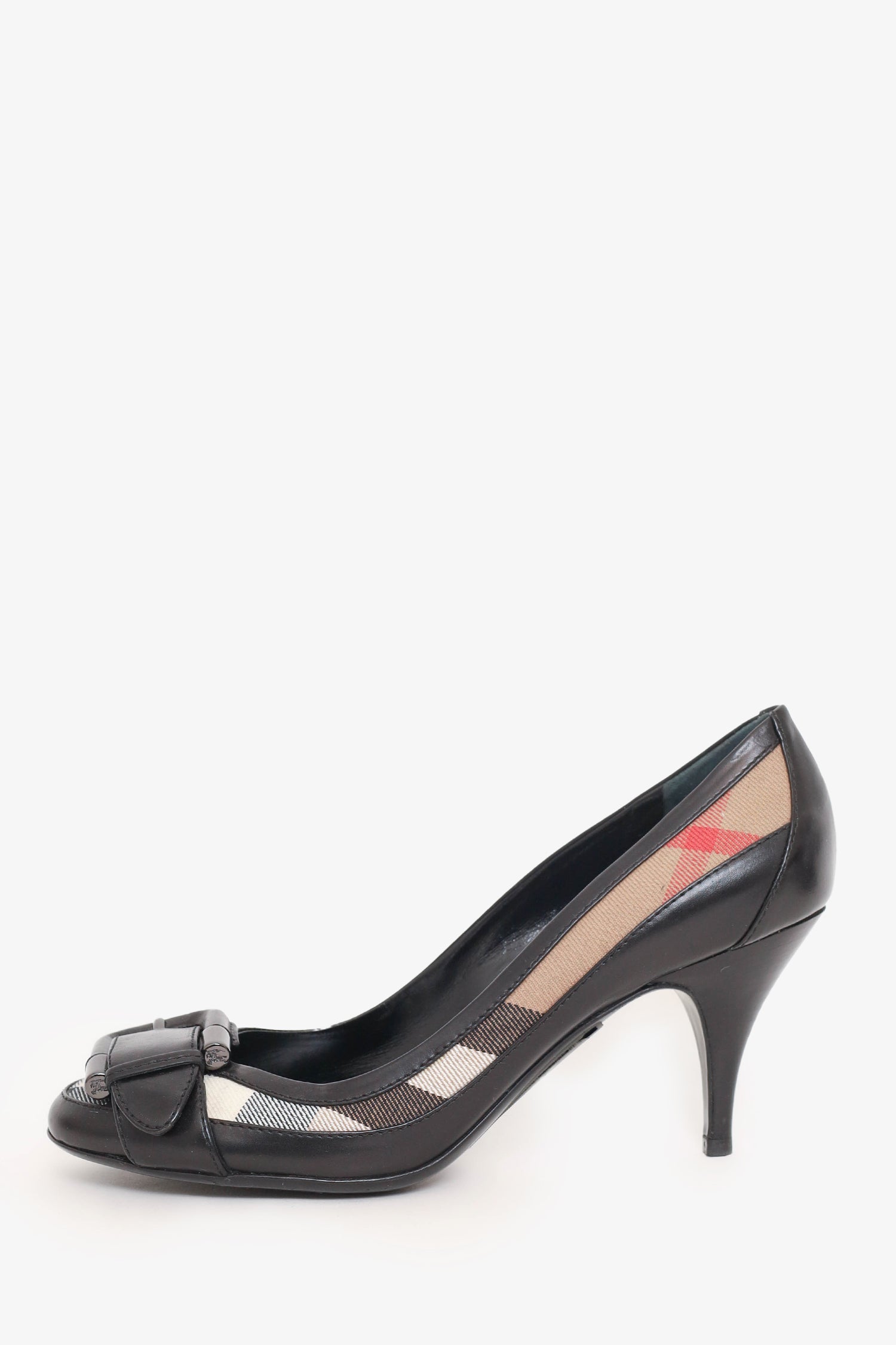 Refresh availabilityBurberry Black Nova Check Buckle Pumps. Slip-on. Round toe. Monogram detailing throughout. Buckle strap detail on toe cap. Tonal stitching.
