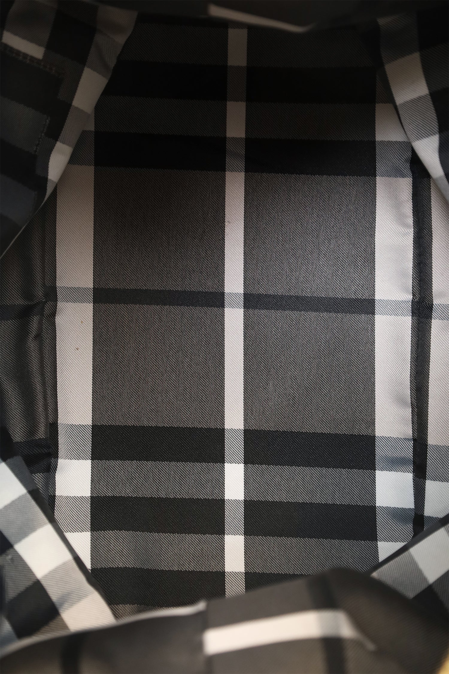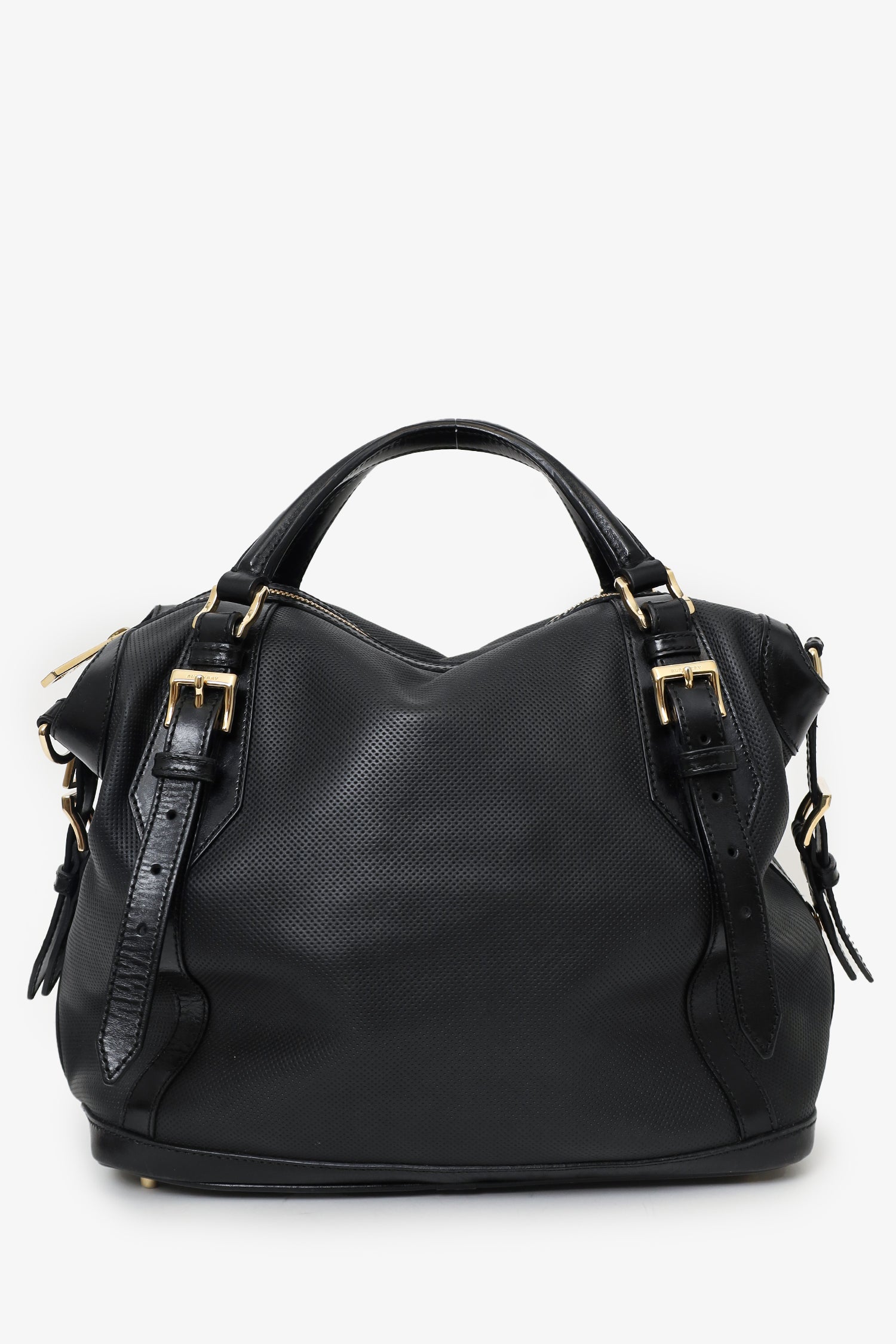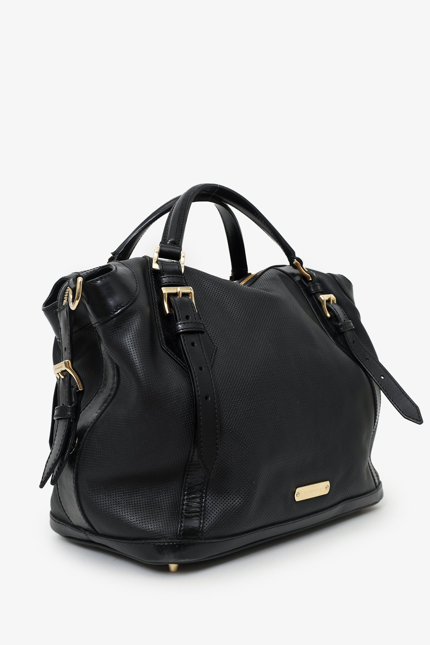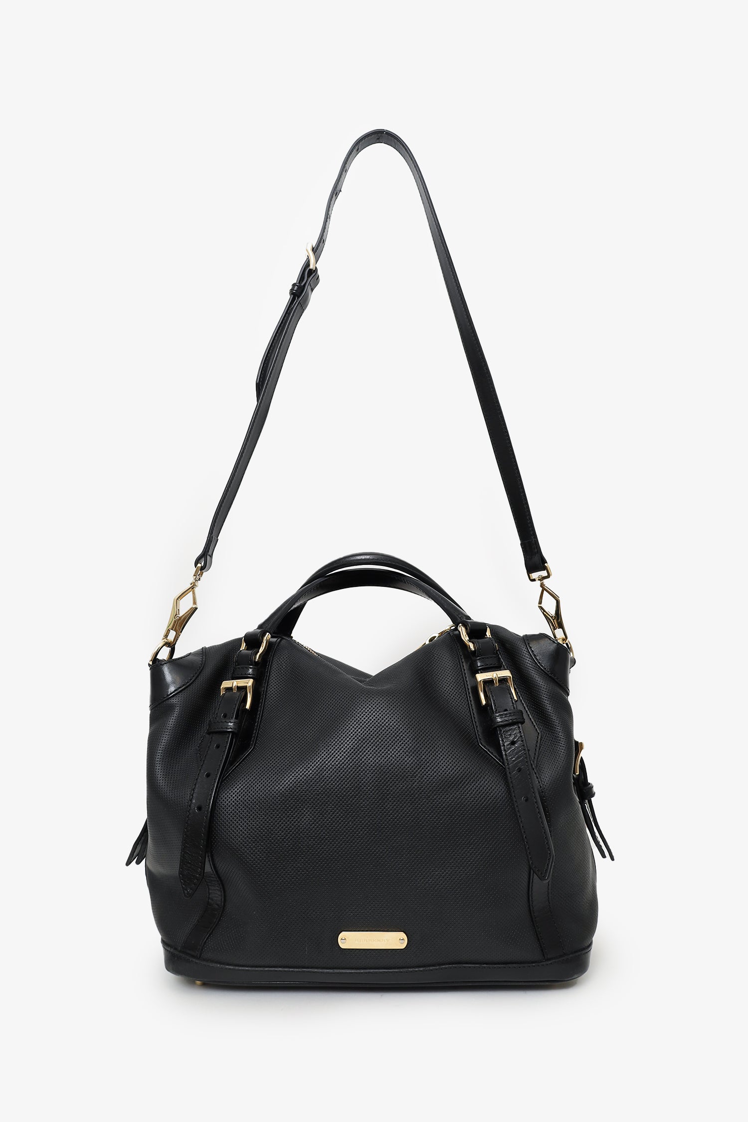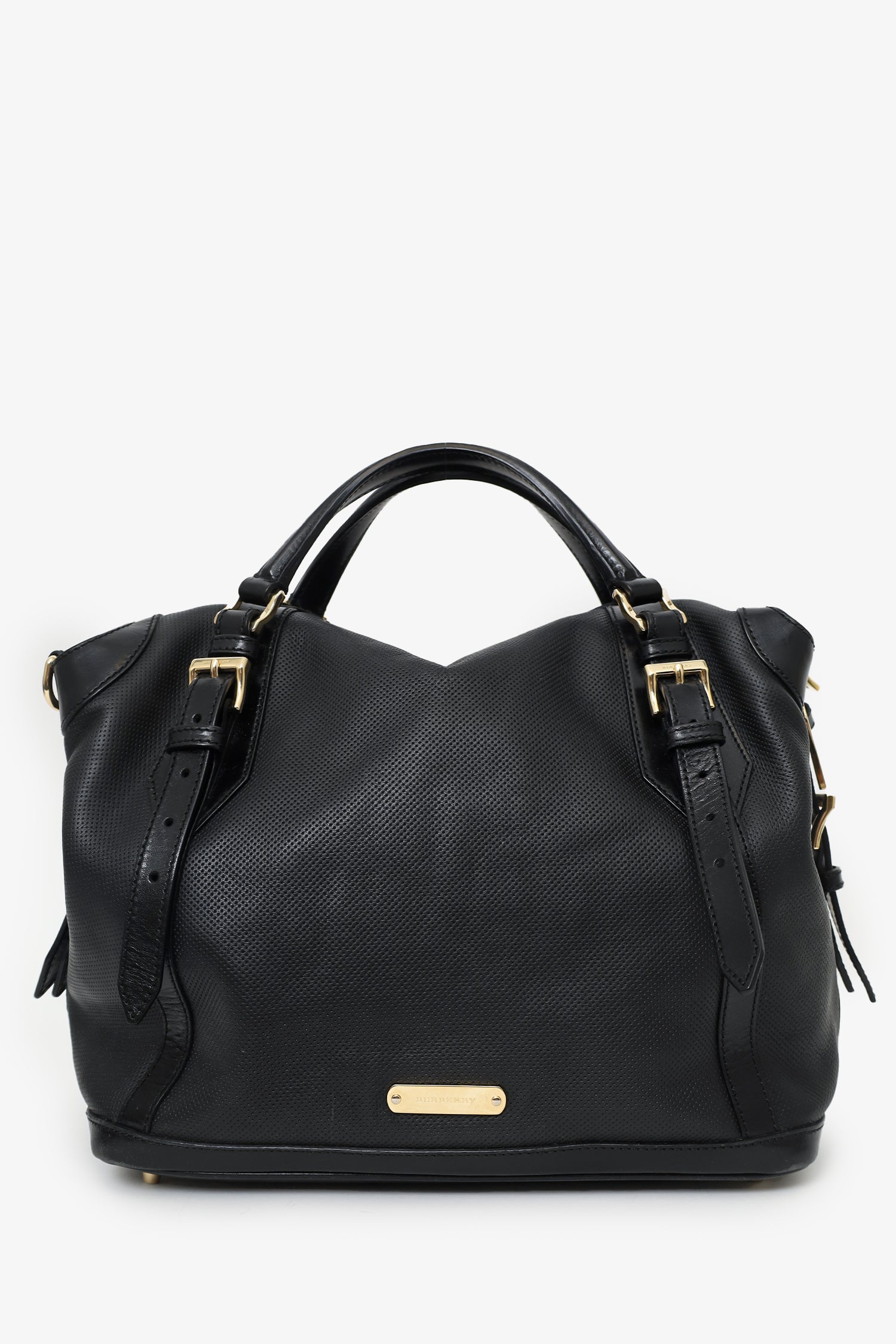 Refresh availabilityBurberry Black Perforated Leather 'Ellers' Bag with Strap. Top zip closure. Dual top handles with adjustable buckle detail on both sides. Removable and adjustable crossbody strap. Protective metal bottom. 2 interior front wall slip pockets and 1 interior rear zip pocket. Burberry print interior lining. Gold-tone hardware. Tonal stitching.