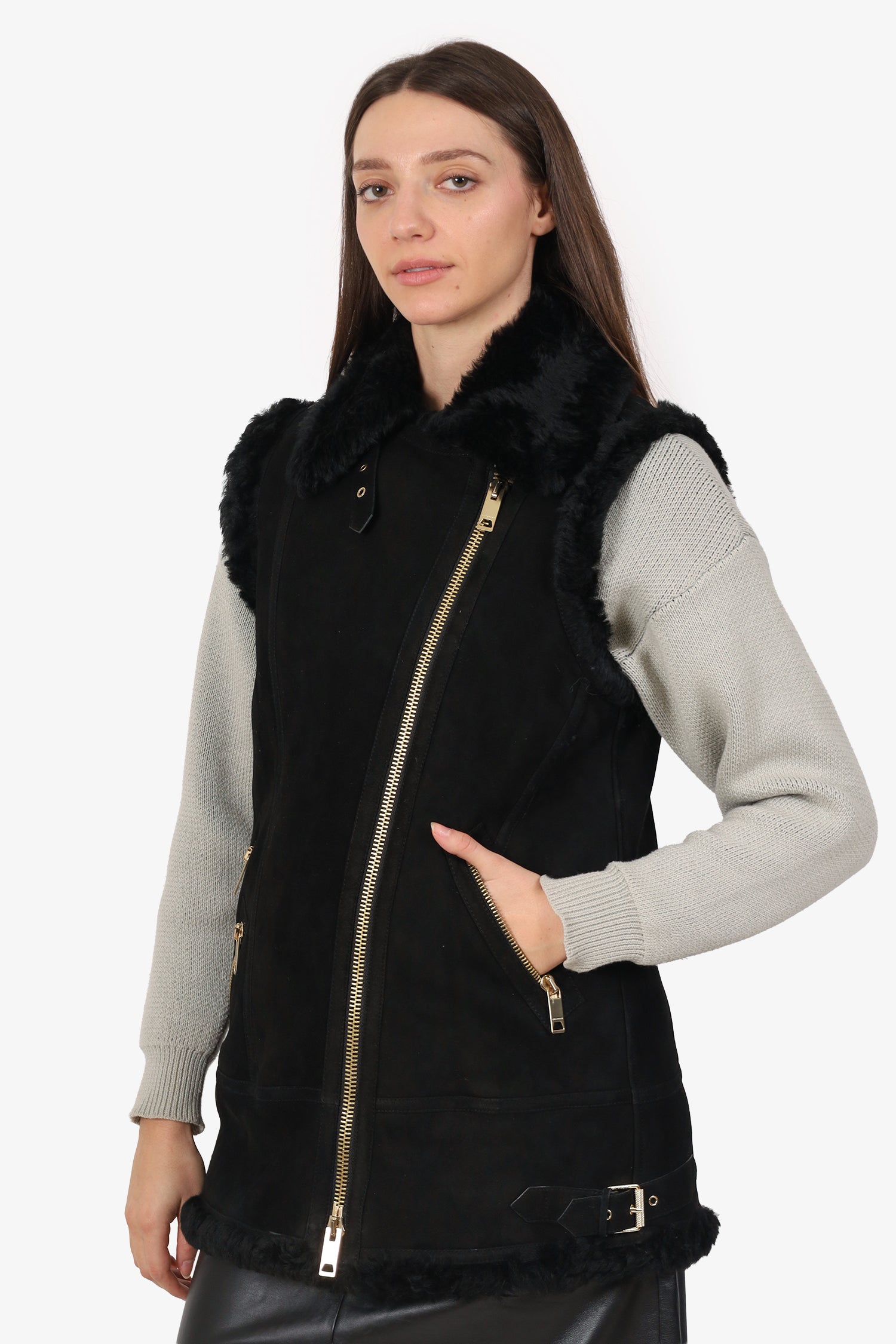 Refresh availabilityBurberry Black Shearling Biker Vest. Pull-on. Collared neckline. 2-way front zip with adjustable pull-through buckle closure. 3 exterior front zip pockets. Rear adjustable pull-through buckle closure. Gold-tone hardware. Tonal stitching.