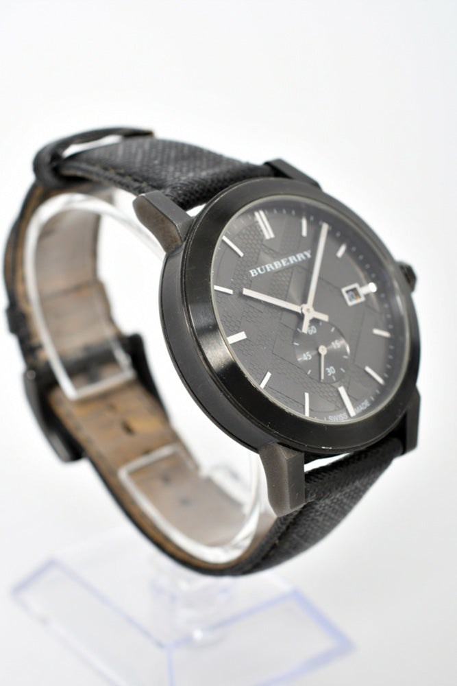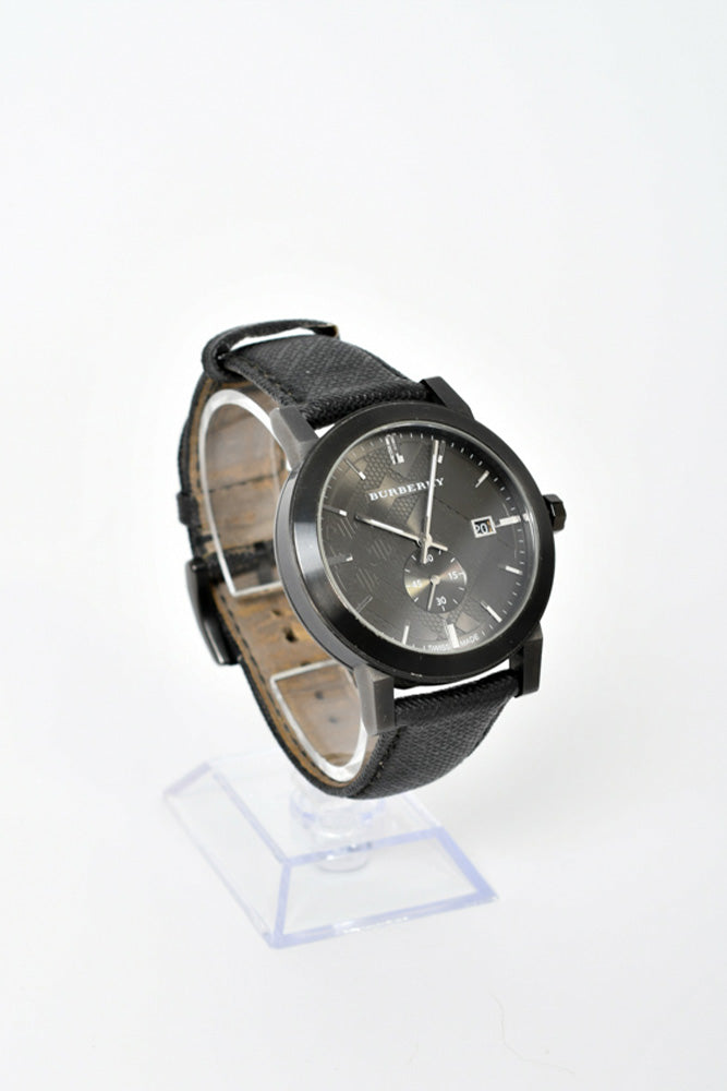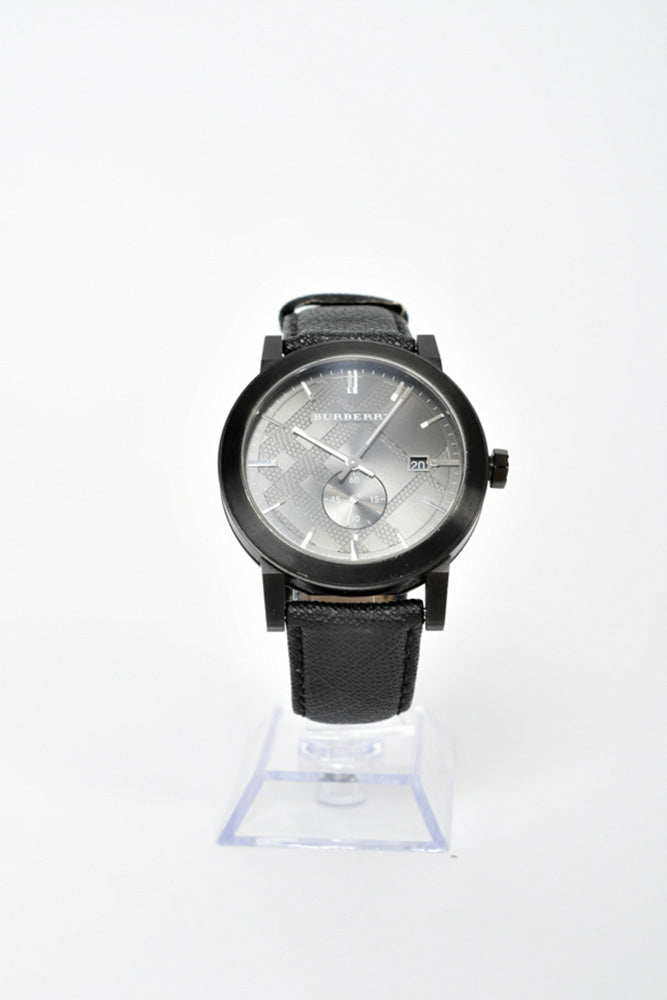 Burberry Black Textured Leather "City" Watch. Round watch face. Buckle closure.