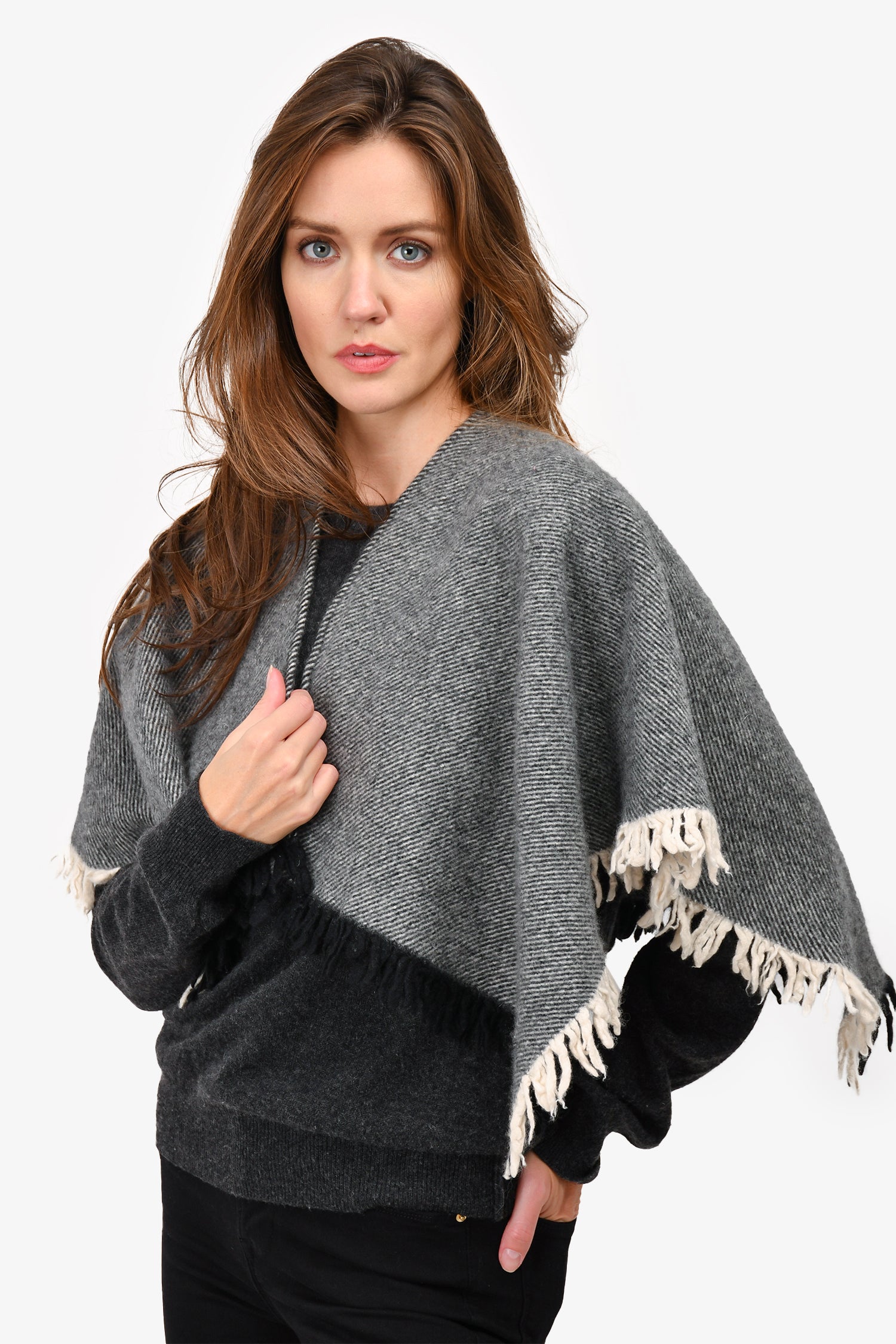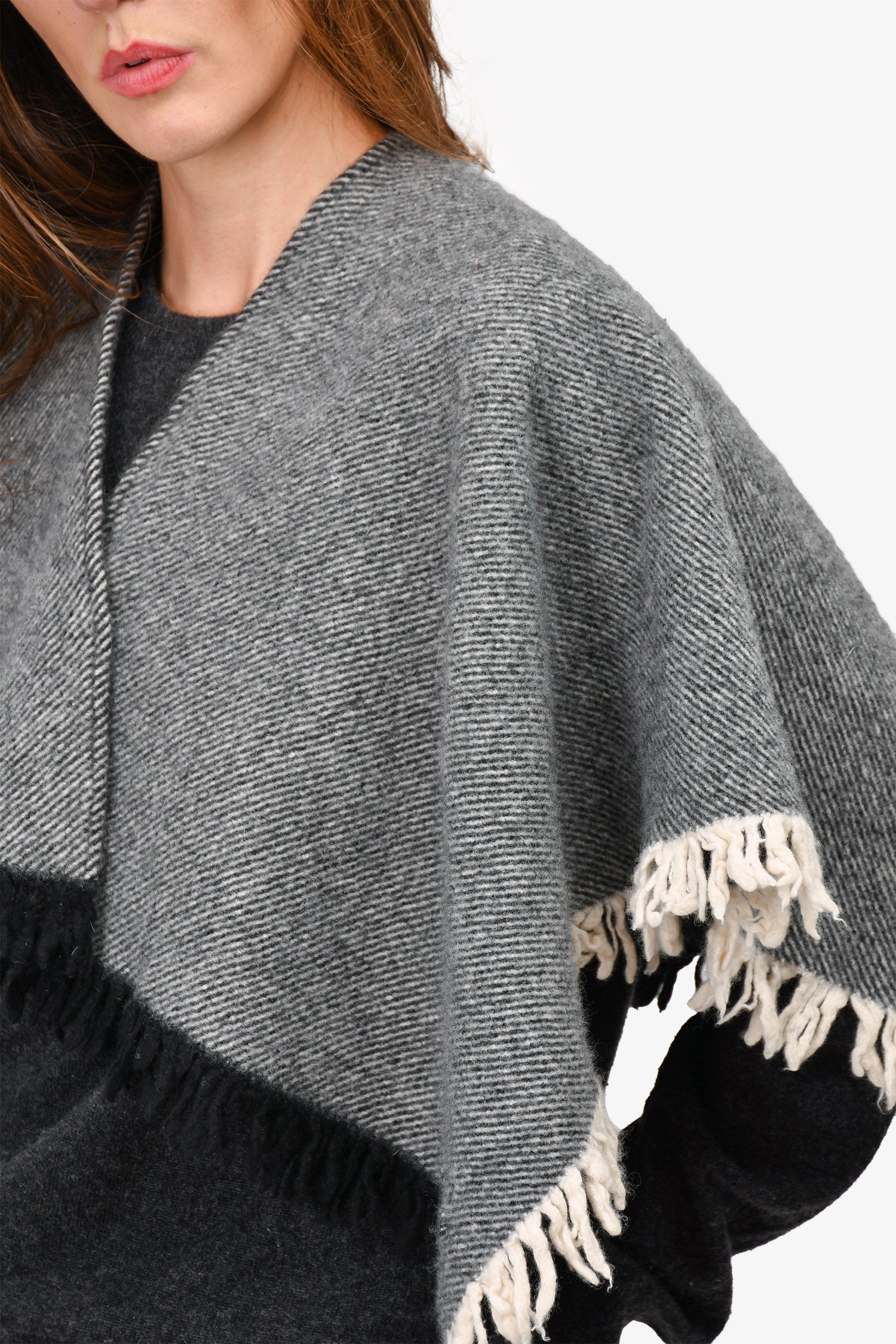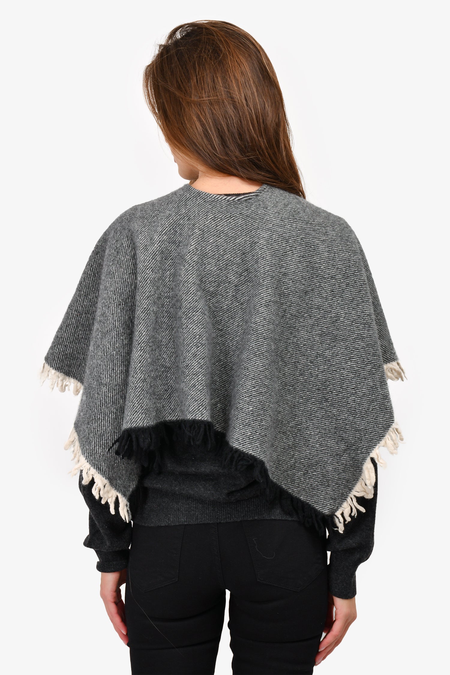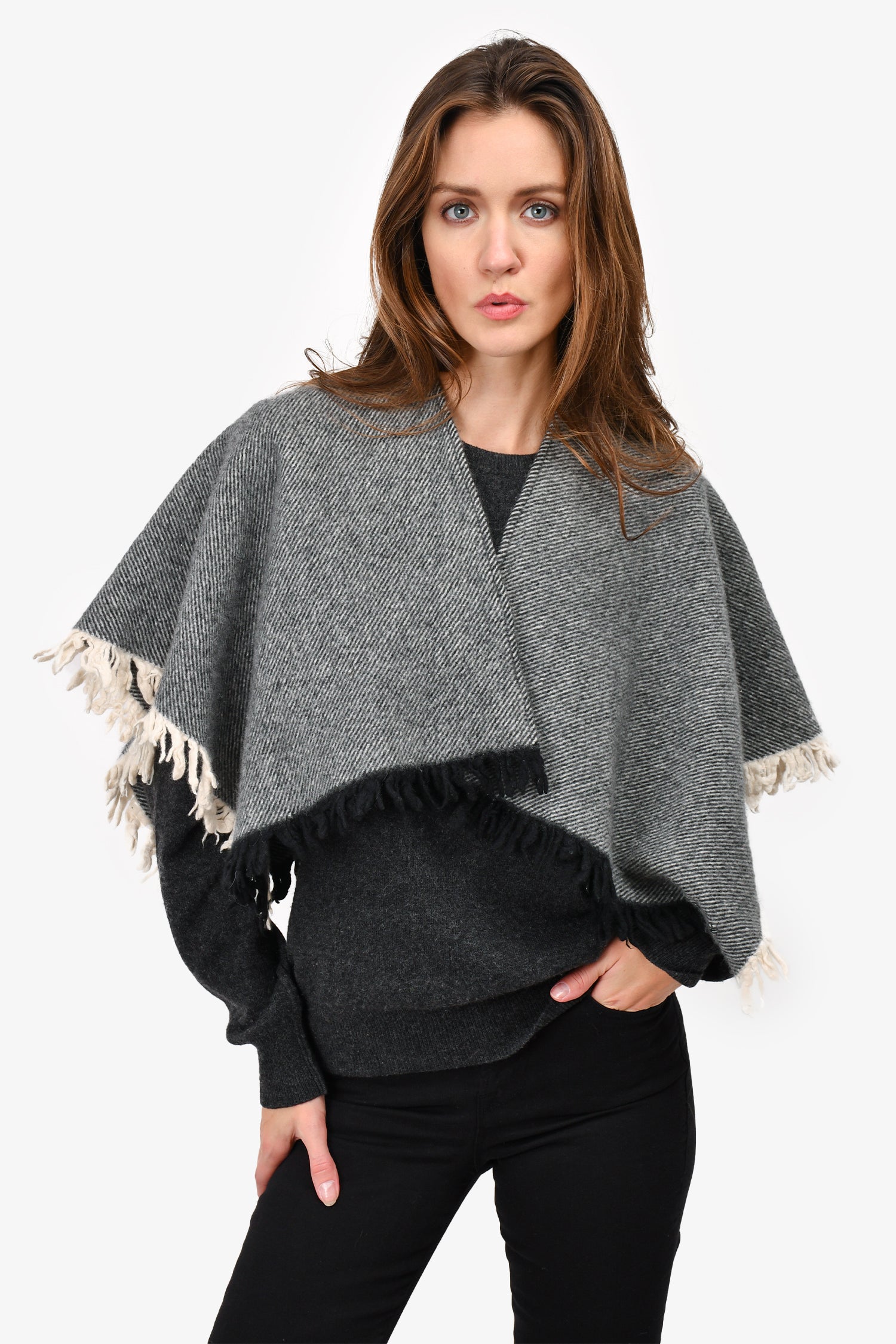 Refresh availabilityBurberry Black Wool/Cashmere Herringbone Mini Cape. Two-tone fringe at the hem. Tonal stitching.