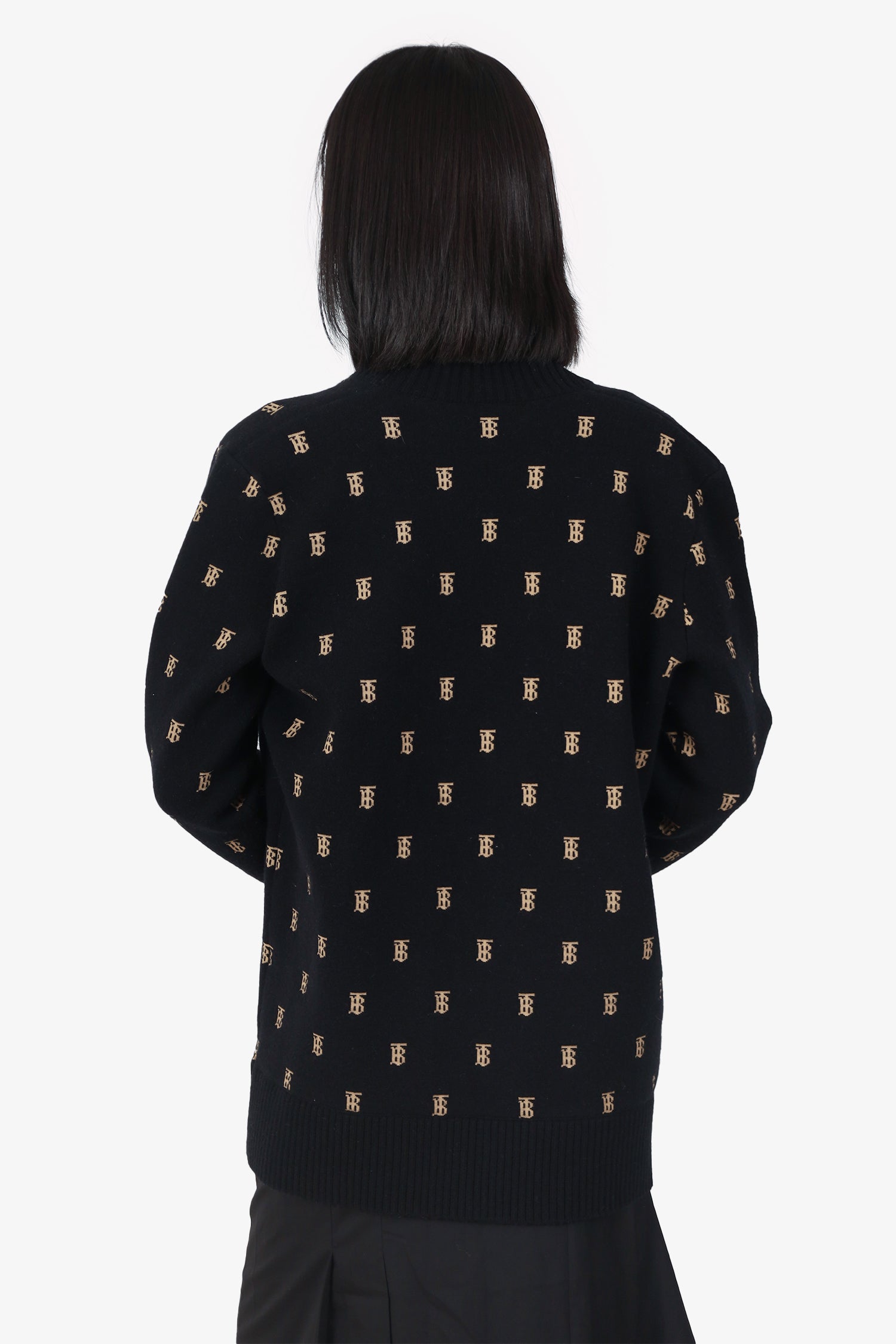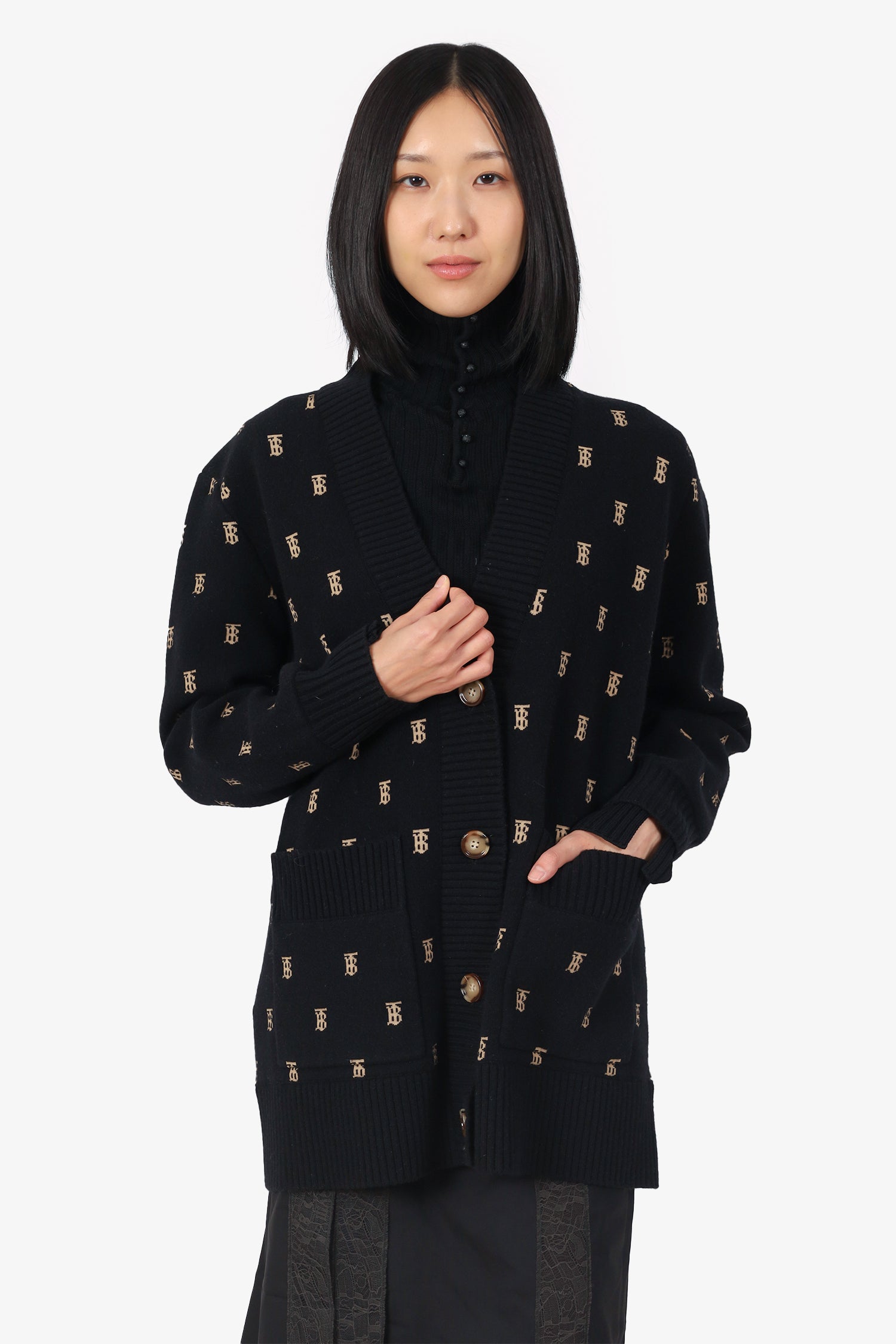 Refresh availabilityBurberry Black Wool Tb Monogram Knit Cardigan. Pull-on. V-neckline. Front button-up closure. 2 exterior front slip pockets. Tonal stitching.