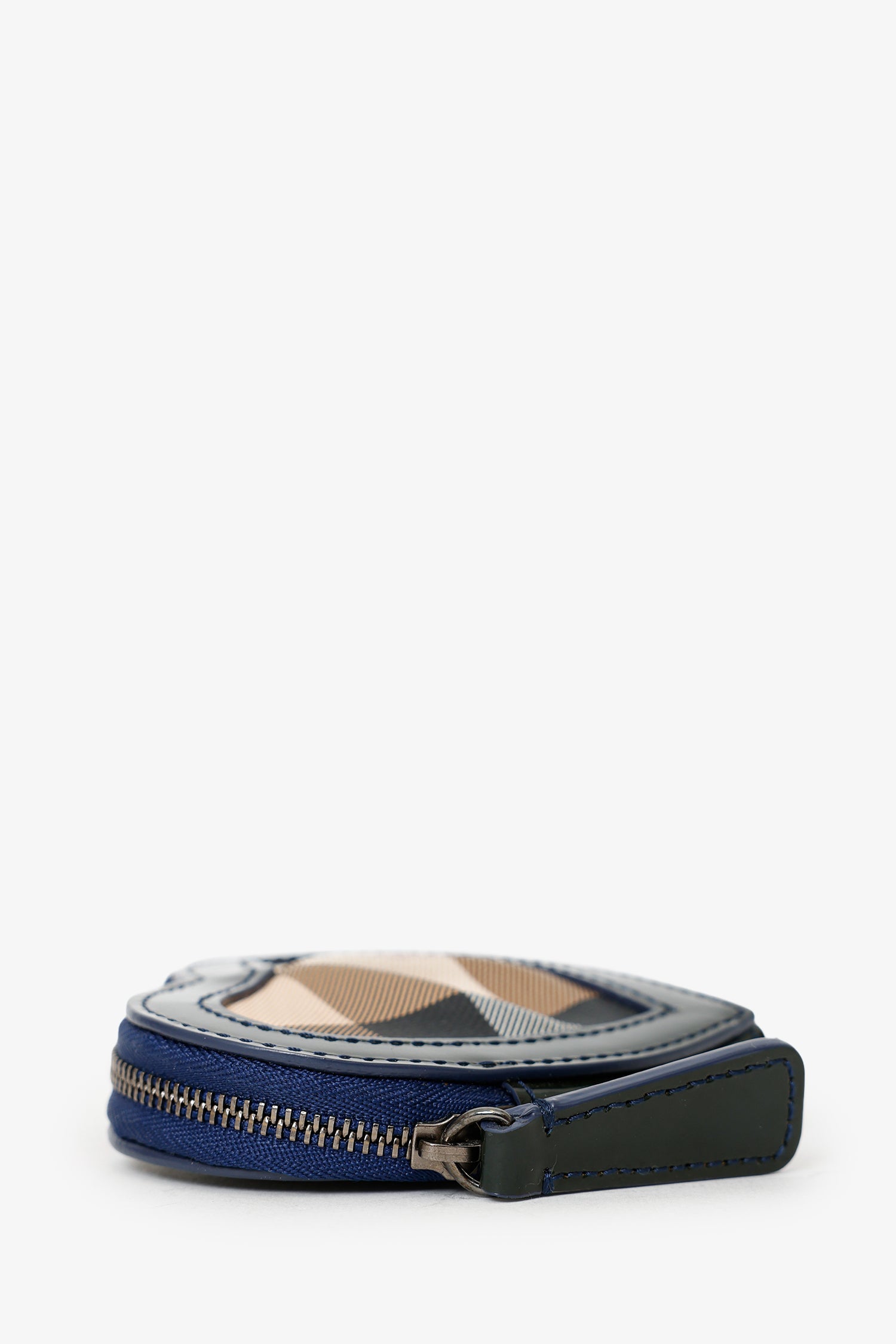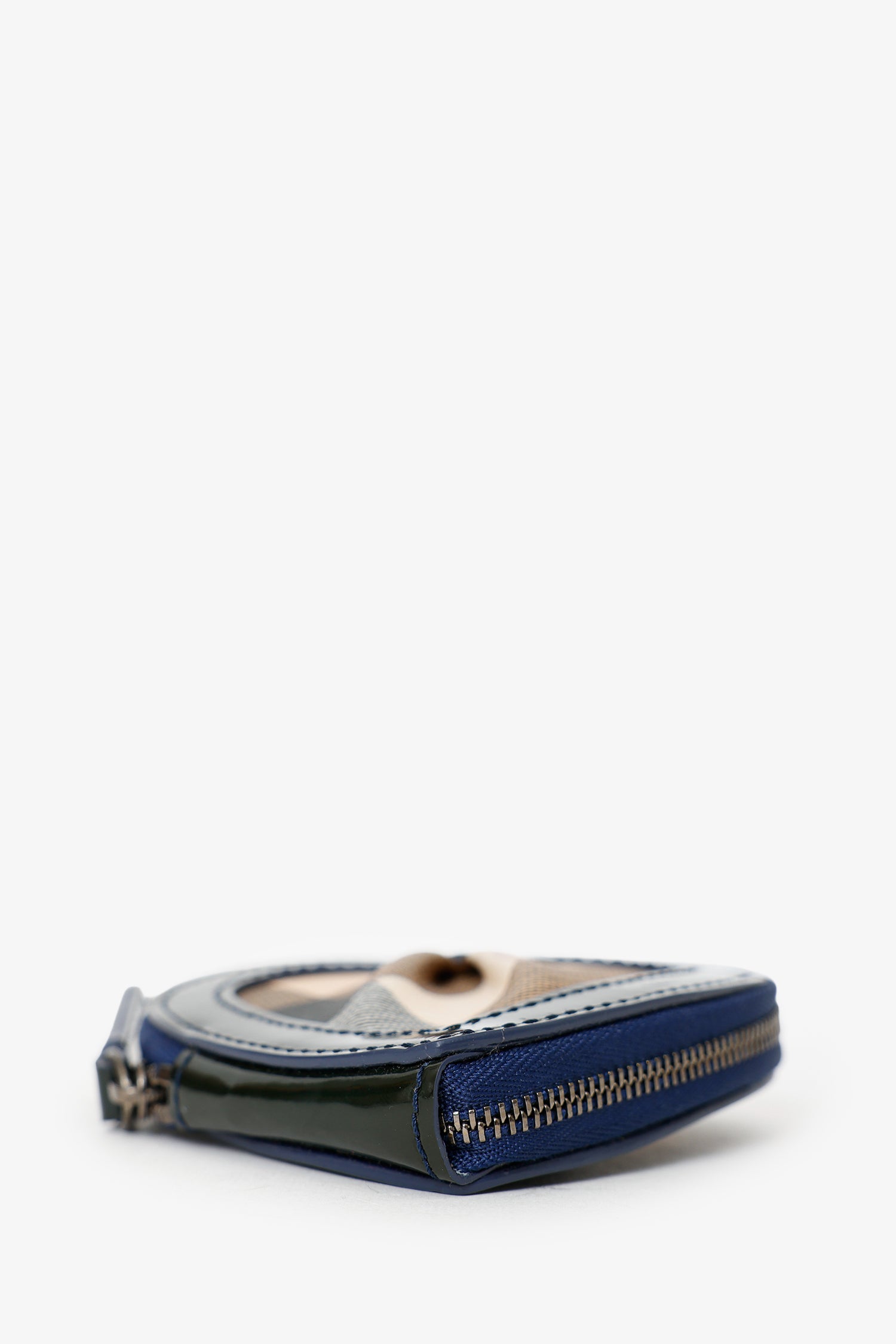 Refresh availabilityBurberry Black/Beige Patent/Canvas Nova Check Heart Coin Pouch. Top zip-up closure. Lined interior. Brass-tone hardware. Tonal stitching.