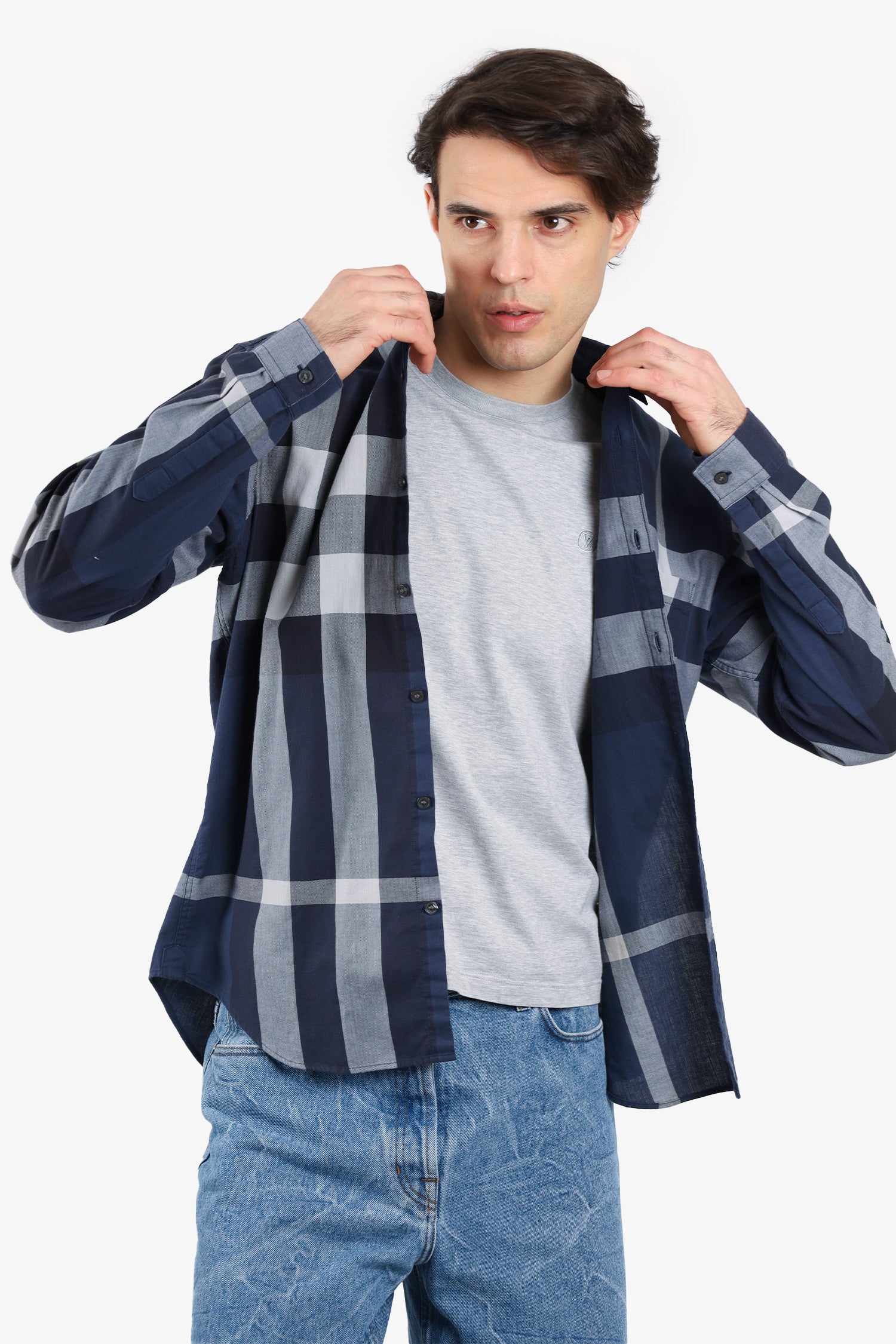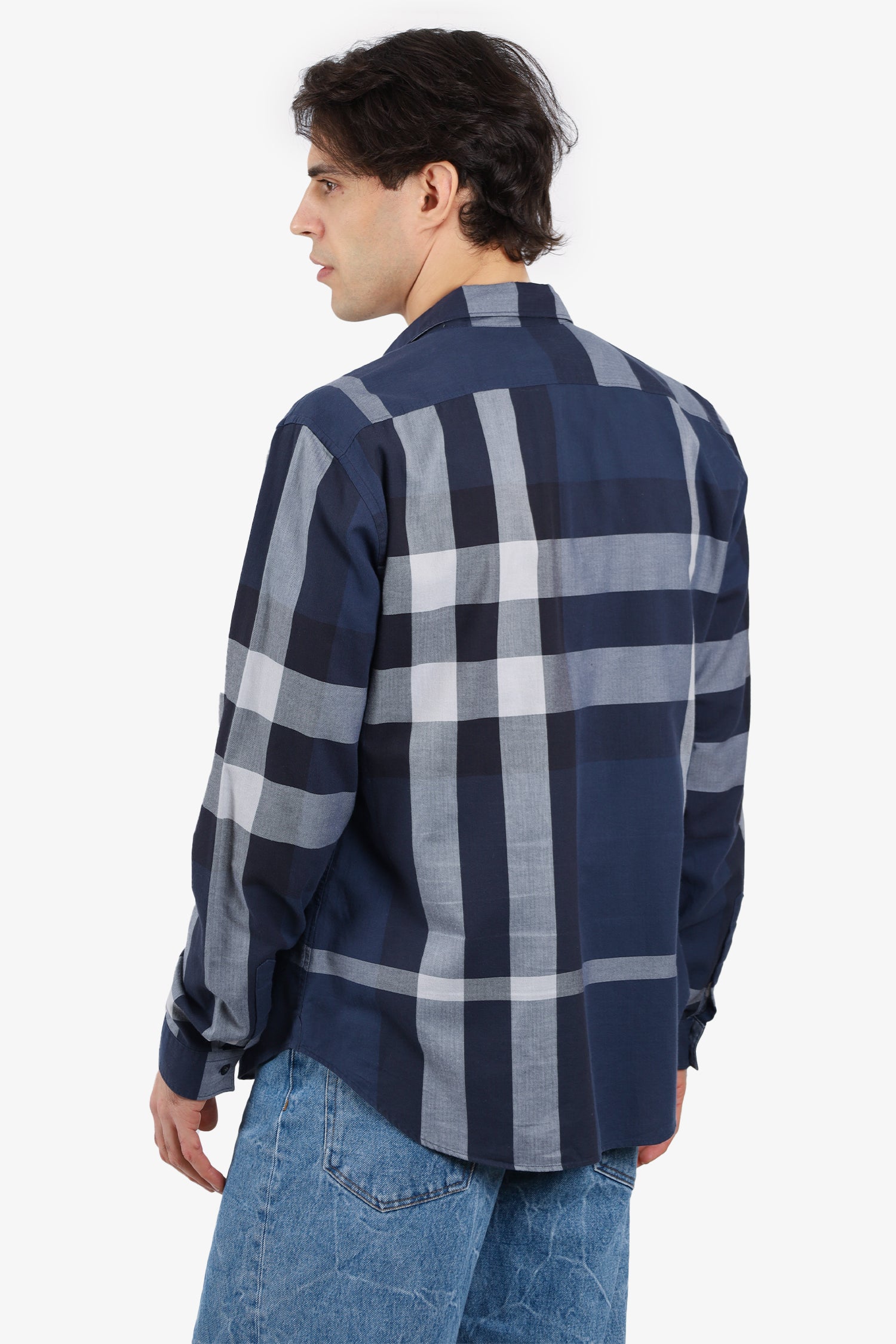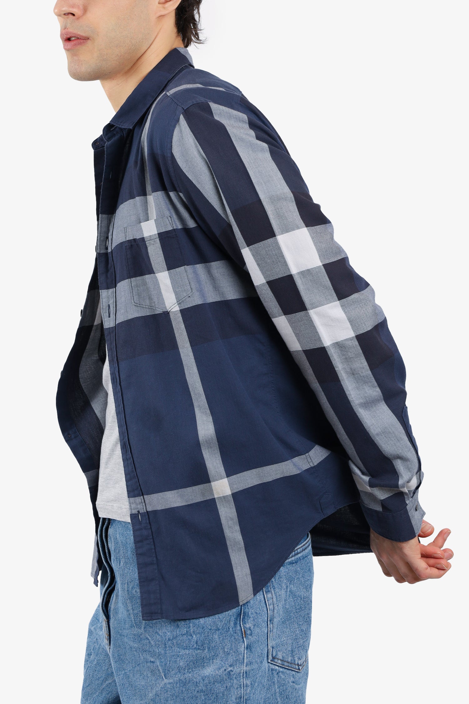 Refresh availabilityBurberry Brit Blue Check Long Sleeve Shirt. Collared neckline. Front button closure. Breast open pocket. Tonal stitching.