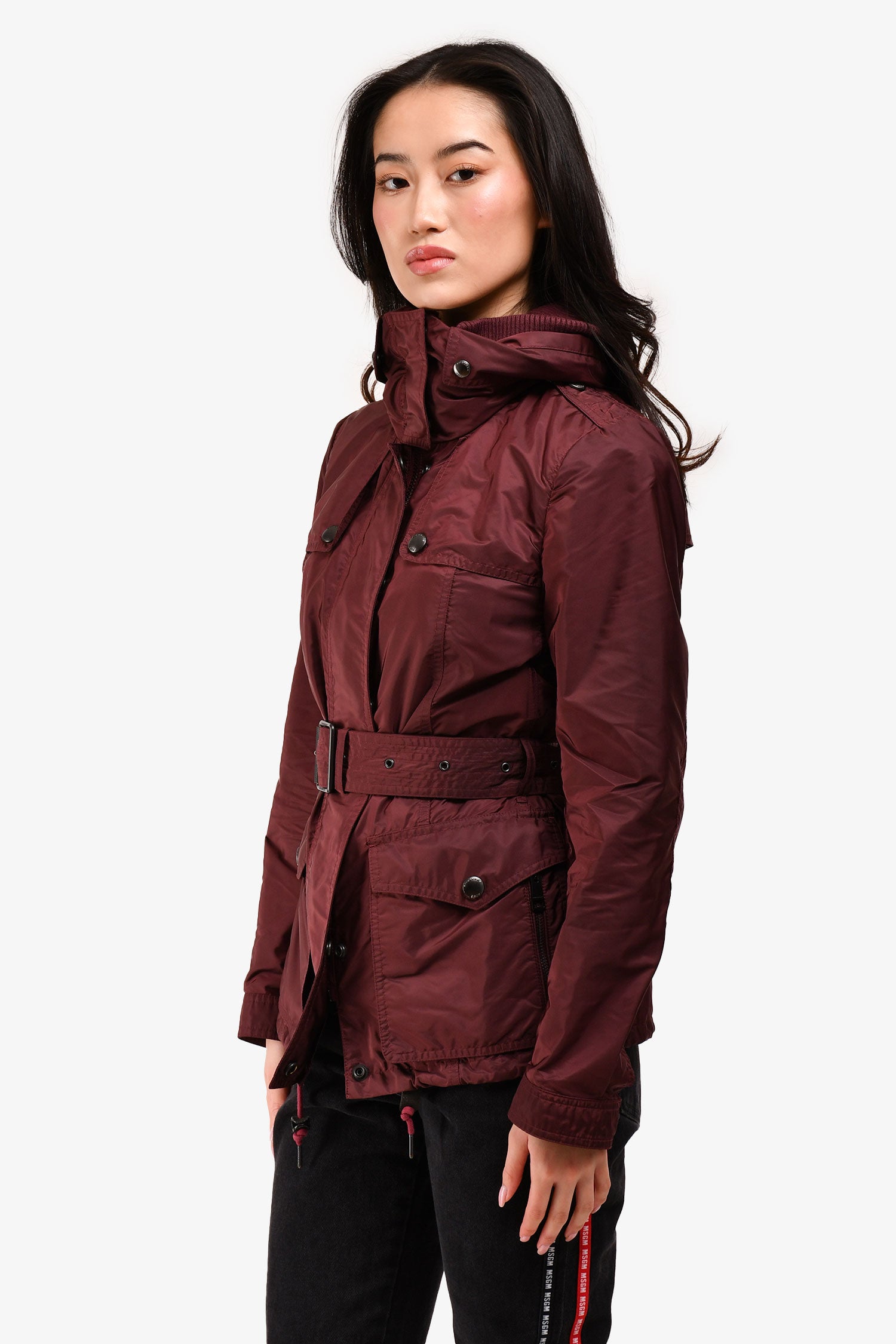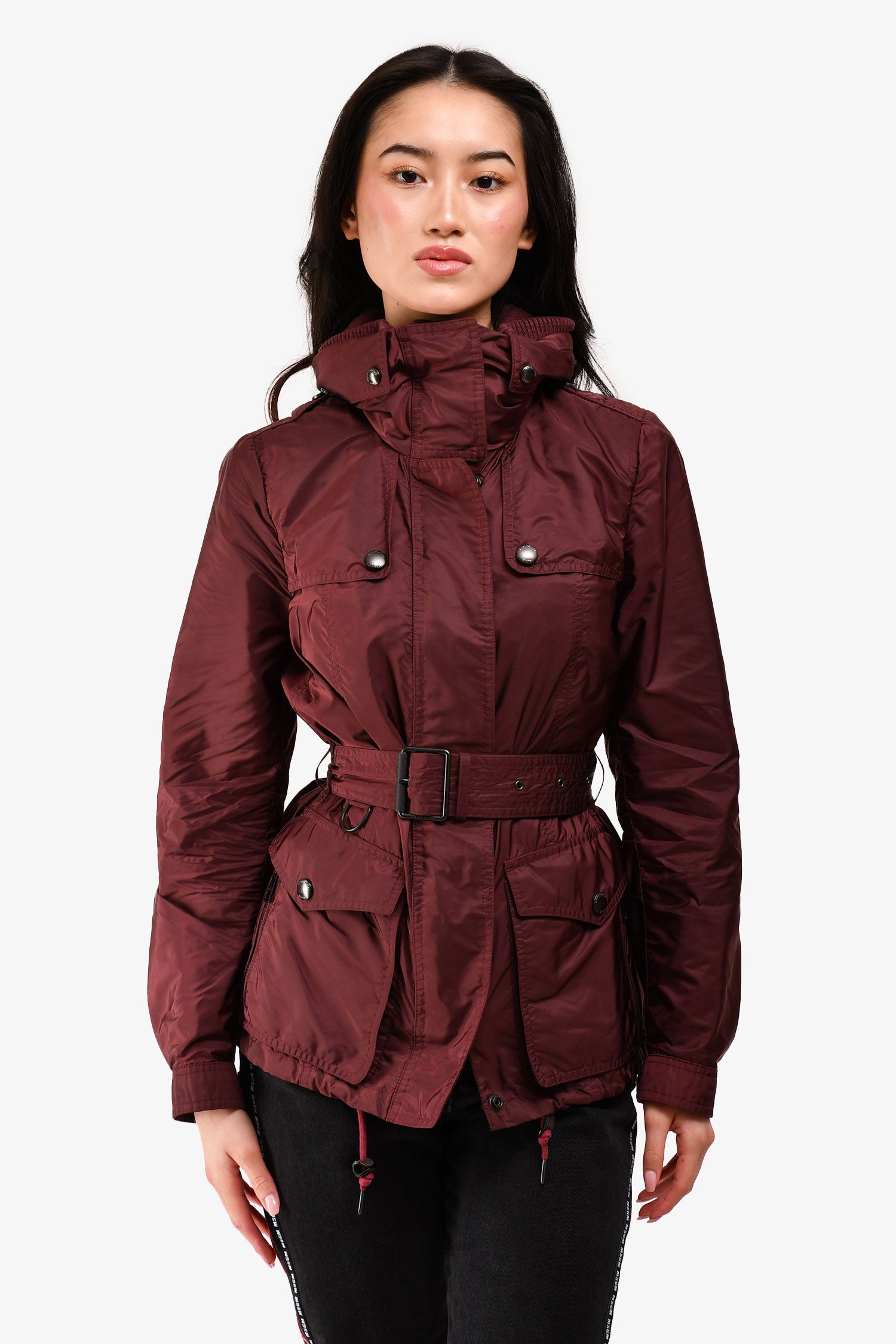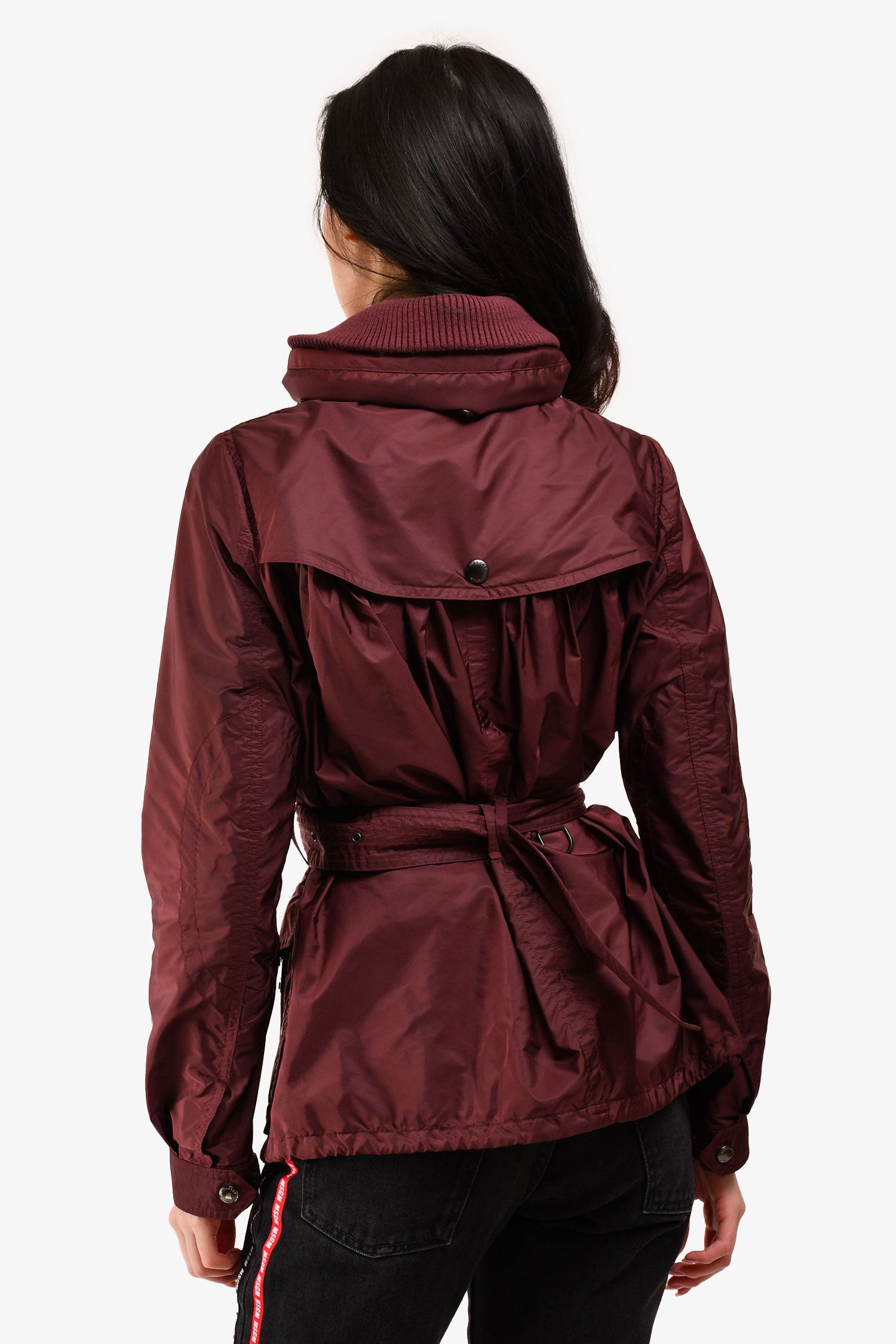 Refresh availabilityBurberry Brit Burgundy Nylon Rain Jacket. Dark chrome-tone hardware. Front zip and snap button closures. Removable hood. Adjustable waist belt. 6 pockets; 2 breast and 2 hand pockets with dual openings. Unlined. Buttoned cuffs. Tonal stitching.