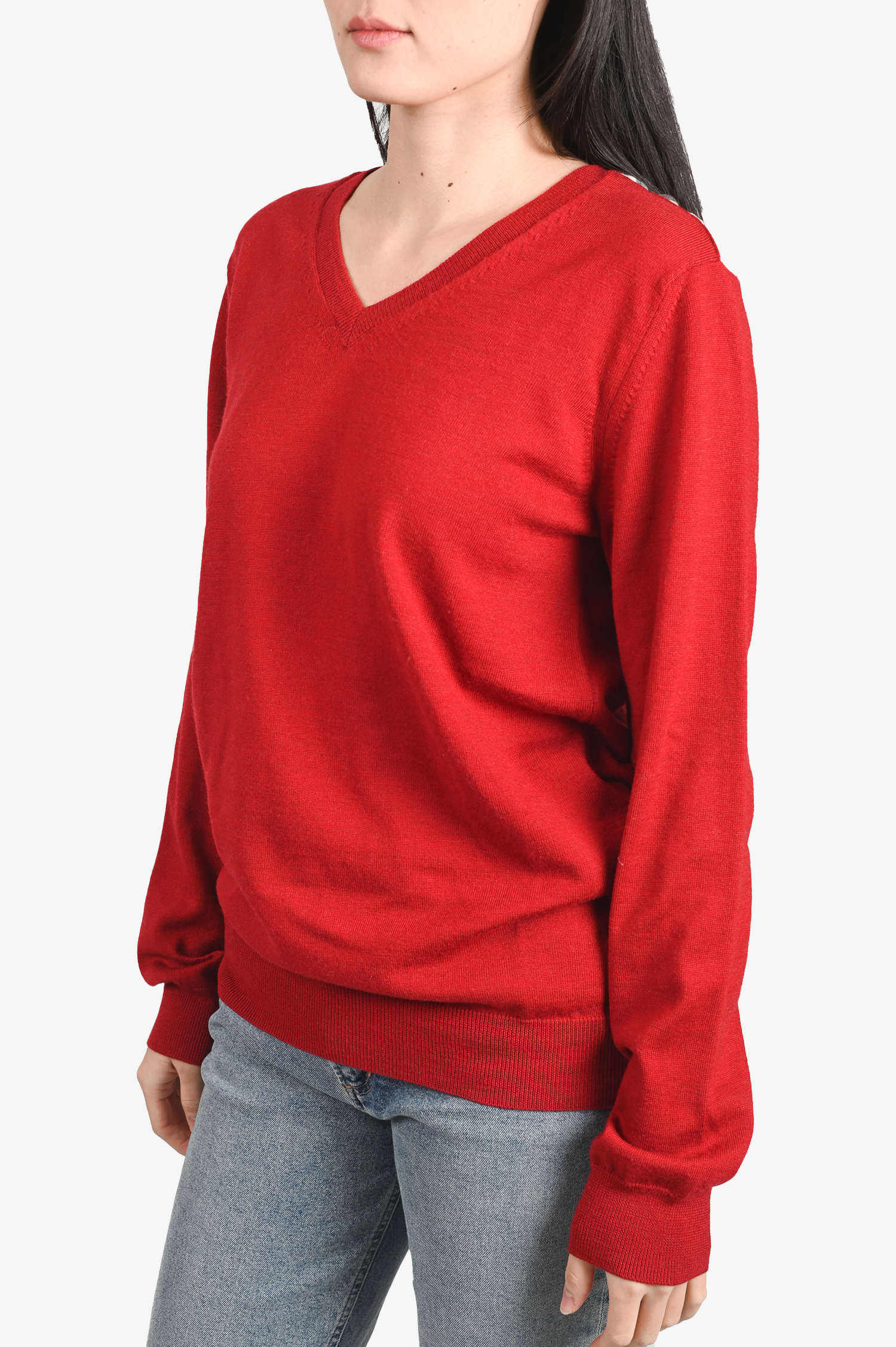 Refresh availabilityBurberry Brit Red Merino Wool V-Neck Sweater. Pull-on. Ribbed neck, cuffs and hem. Signature nova check trims on the shoulders. Tonal stitching.