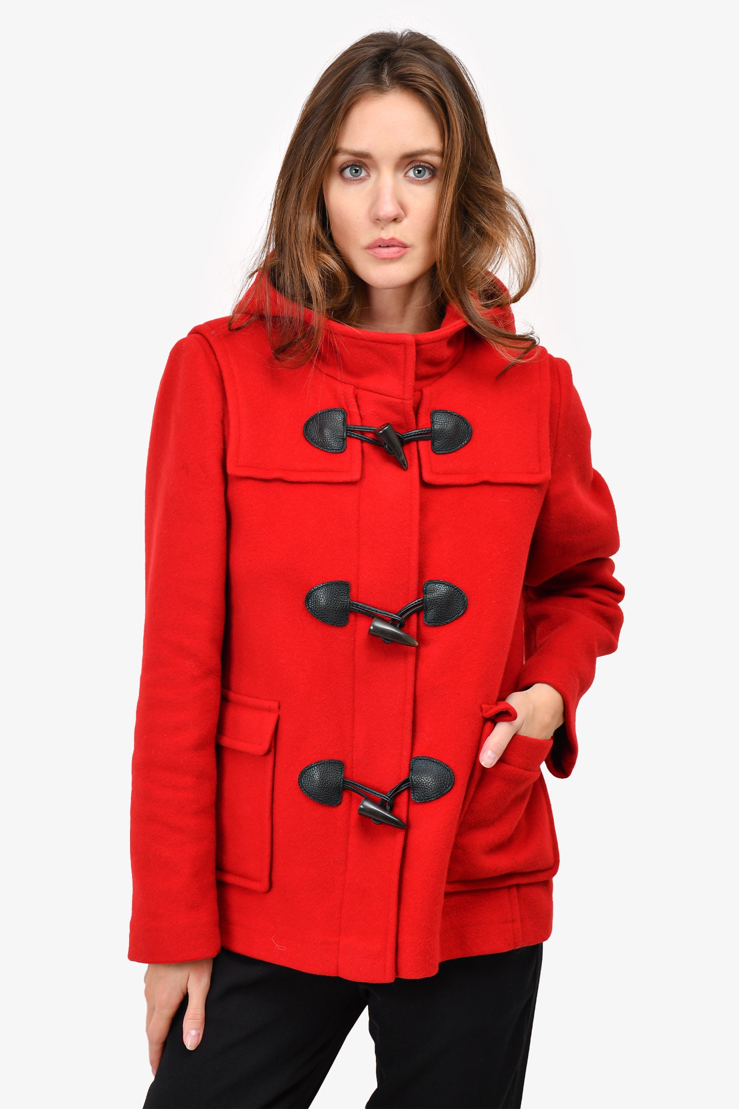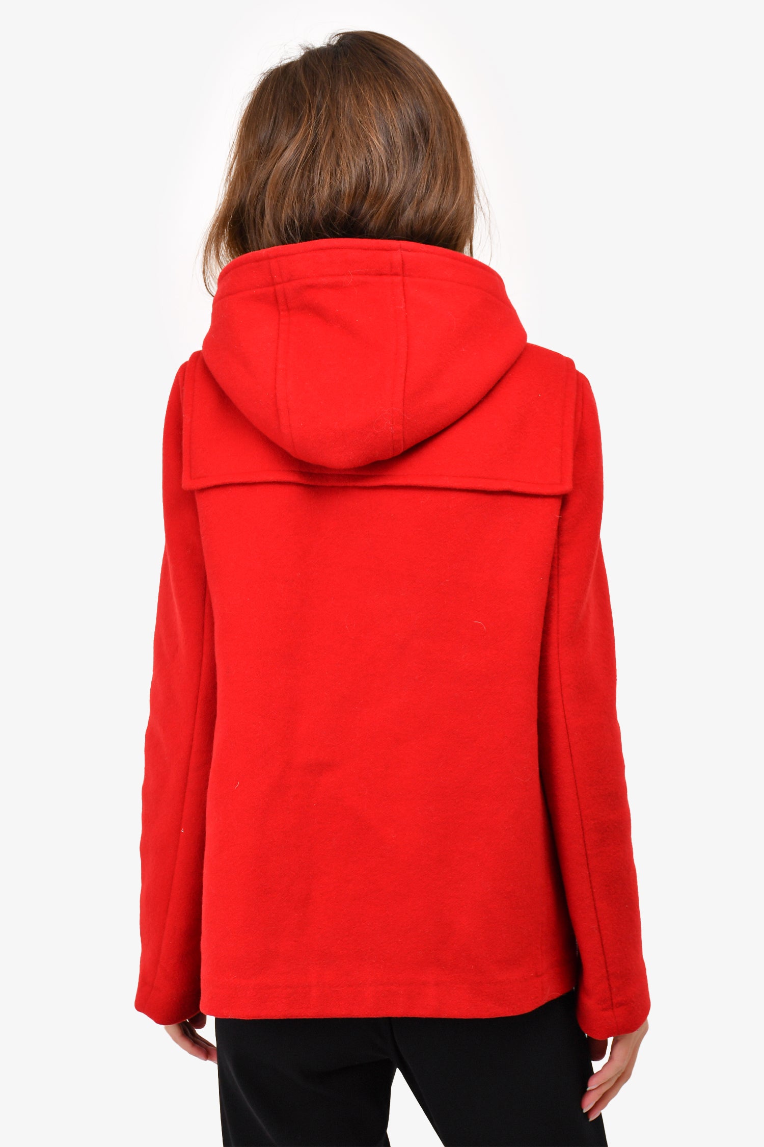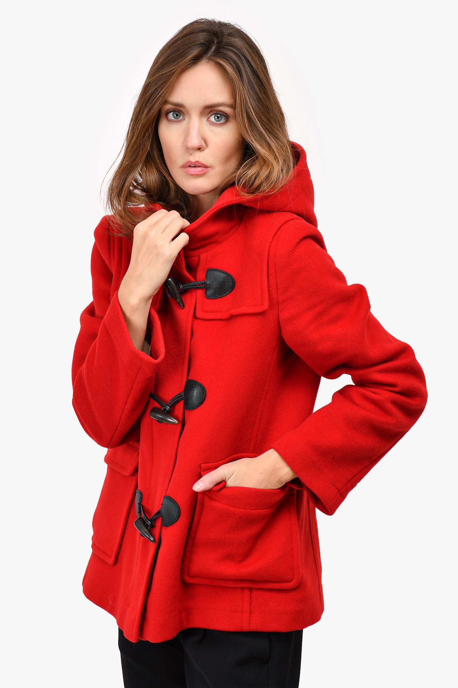 Refresh availabilityBurberry Brit Red Wool Short Toggle Coat. Front zip and toggle closures. Unlined. Hooded. Gunmetal-tone hardware. 2 hand pockets with flaps. Tonal stitching.