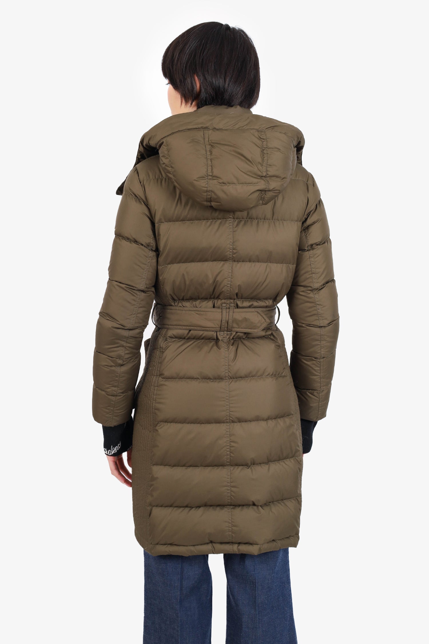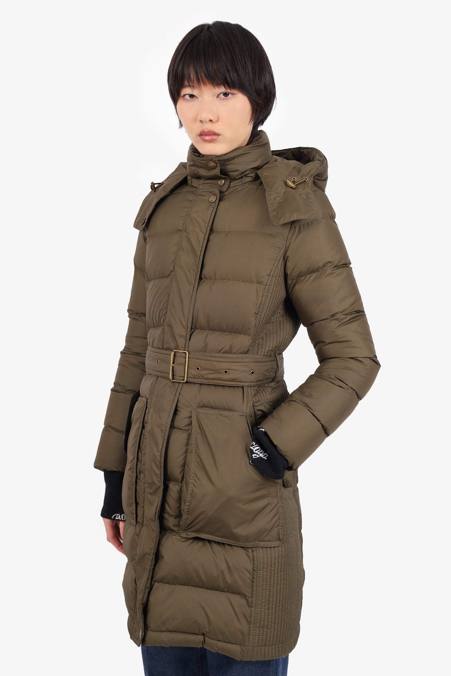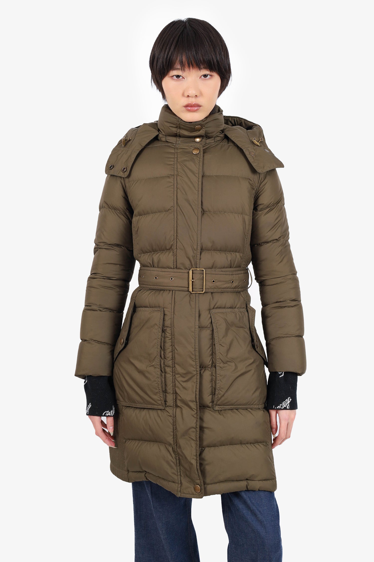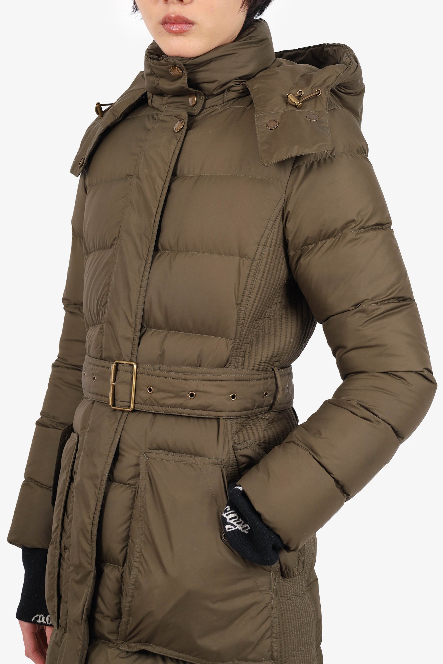 Refresh availabilityBurberry Britt Green Quilted Puffer Jacket with Removable. Front double-ended zip with snap button closure. 2 front snap button pockets. Cinching tabs on either side of hood. Adjustable/removable pull-through belt along waist. Lined. Tonal stitching.