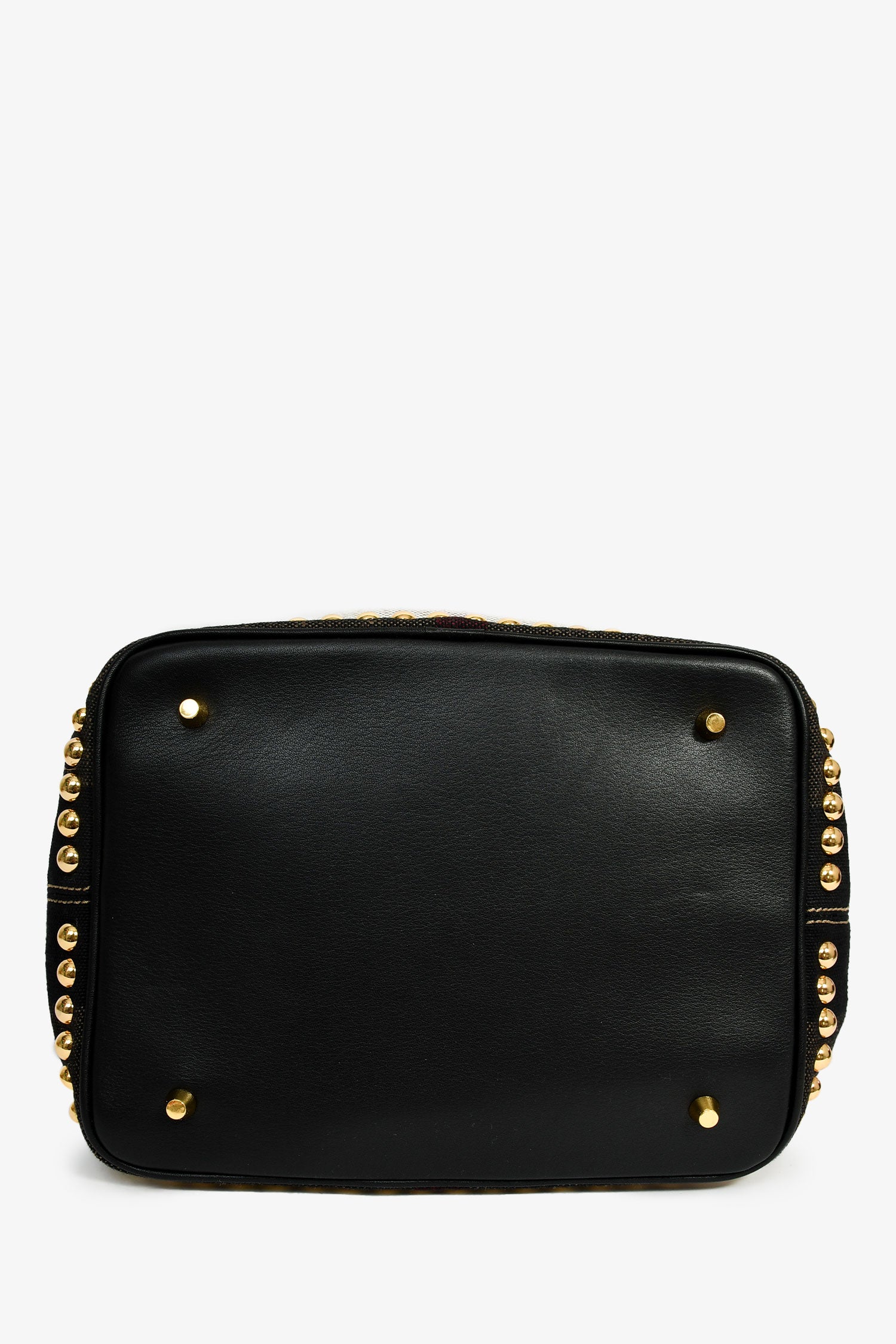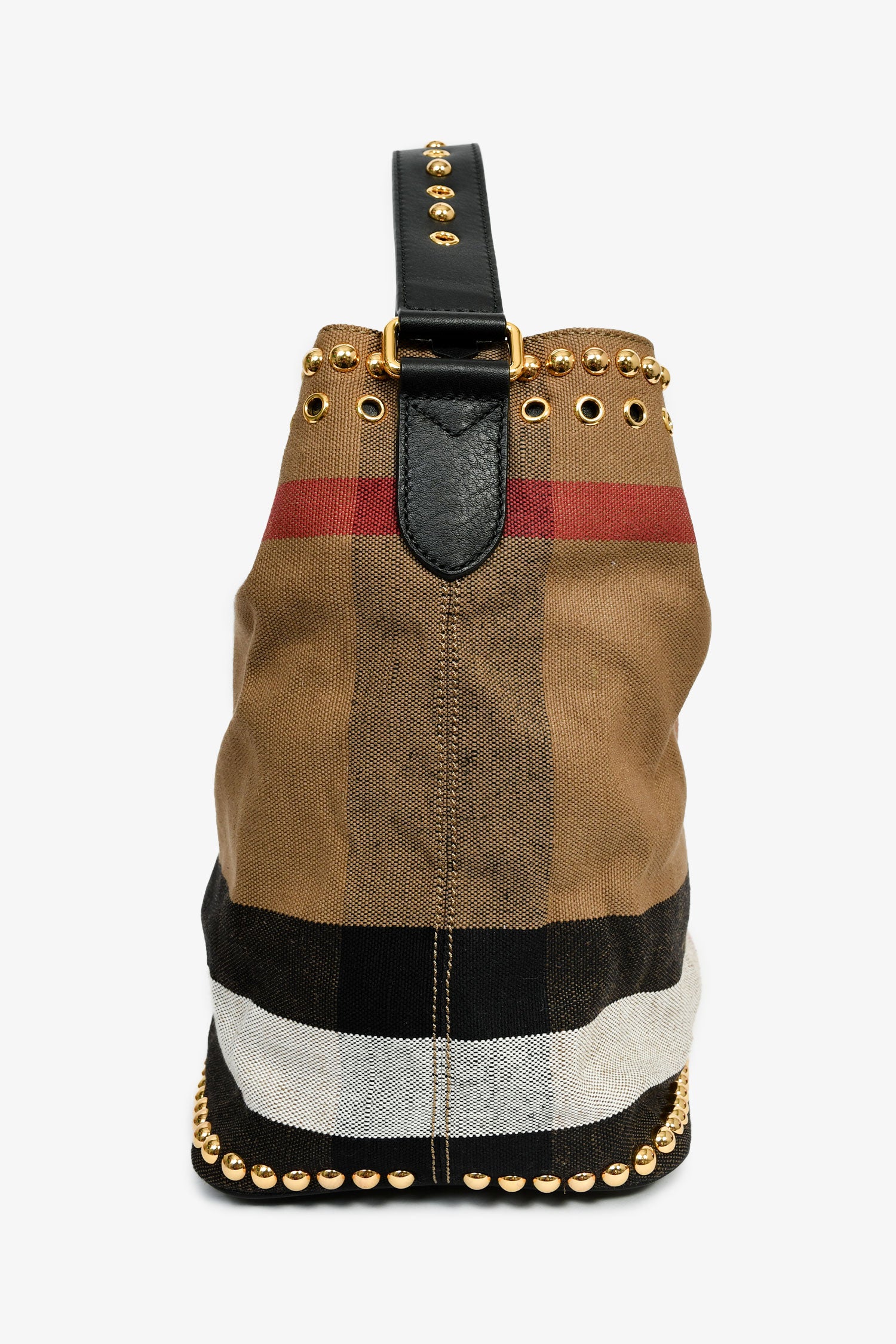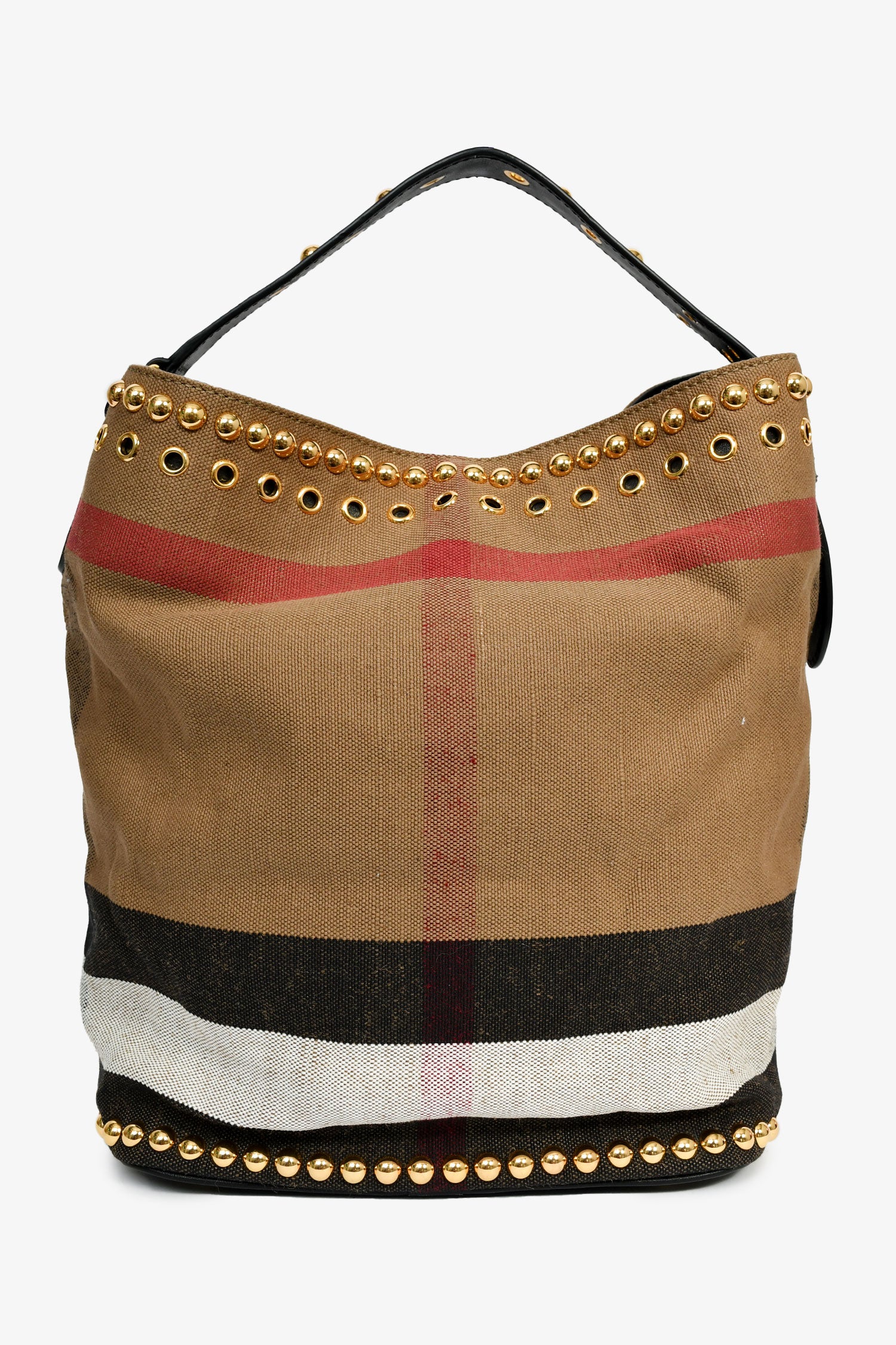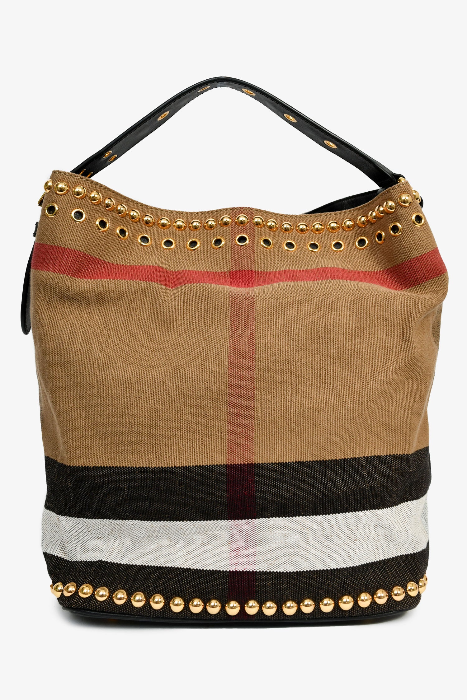 Refresh availabilityBurberry Brown/Black Linen/Leather Novacheck Studded Hobo Bag. Gold-tone hardware. Leather strap and trim. Canvas-lined interior. Single zipped pocket and 2 compartments. Tonal stitching.
