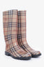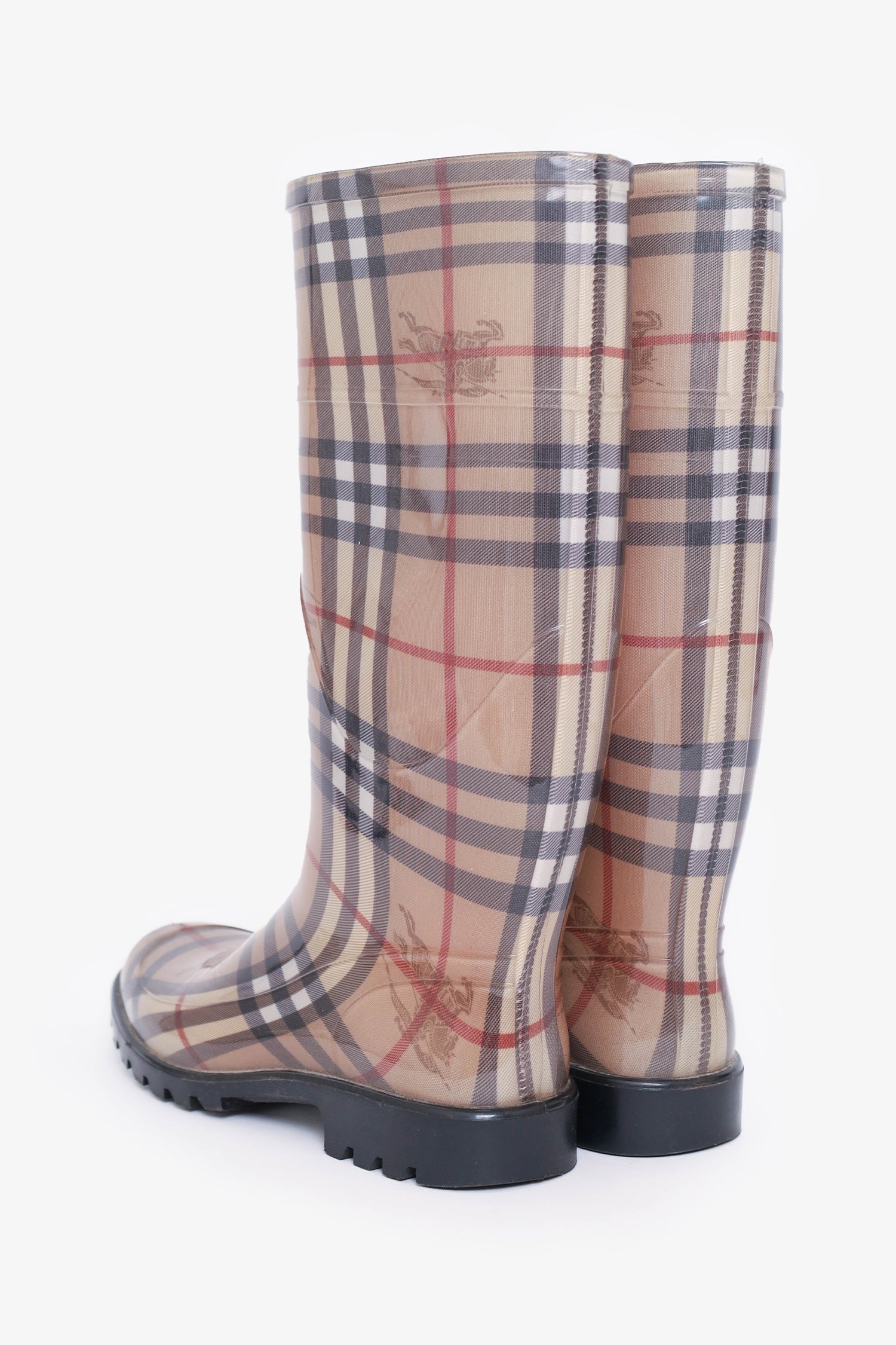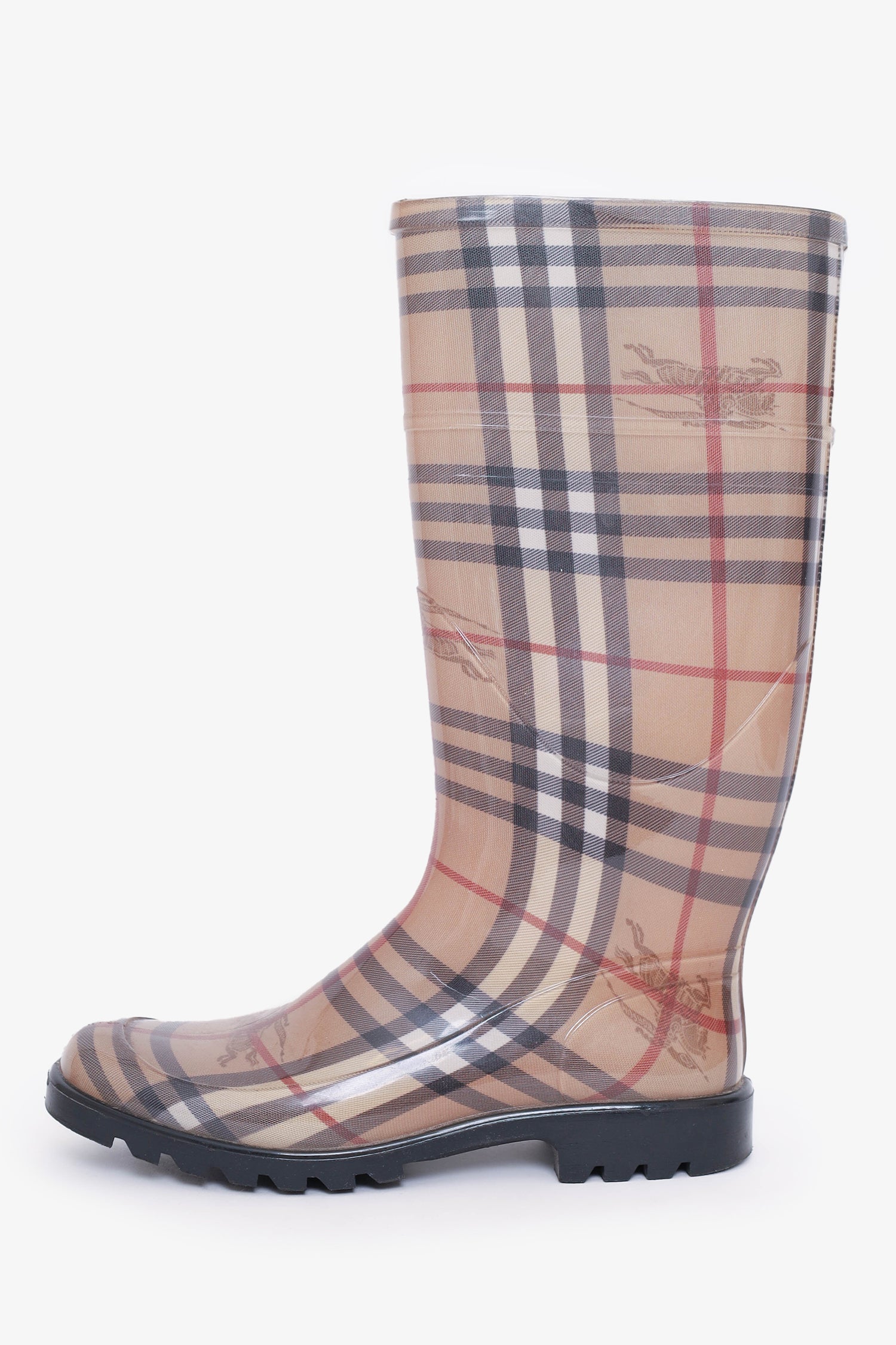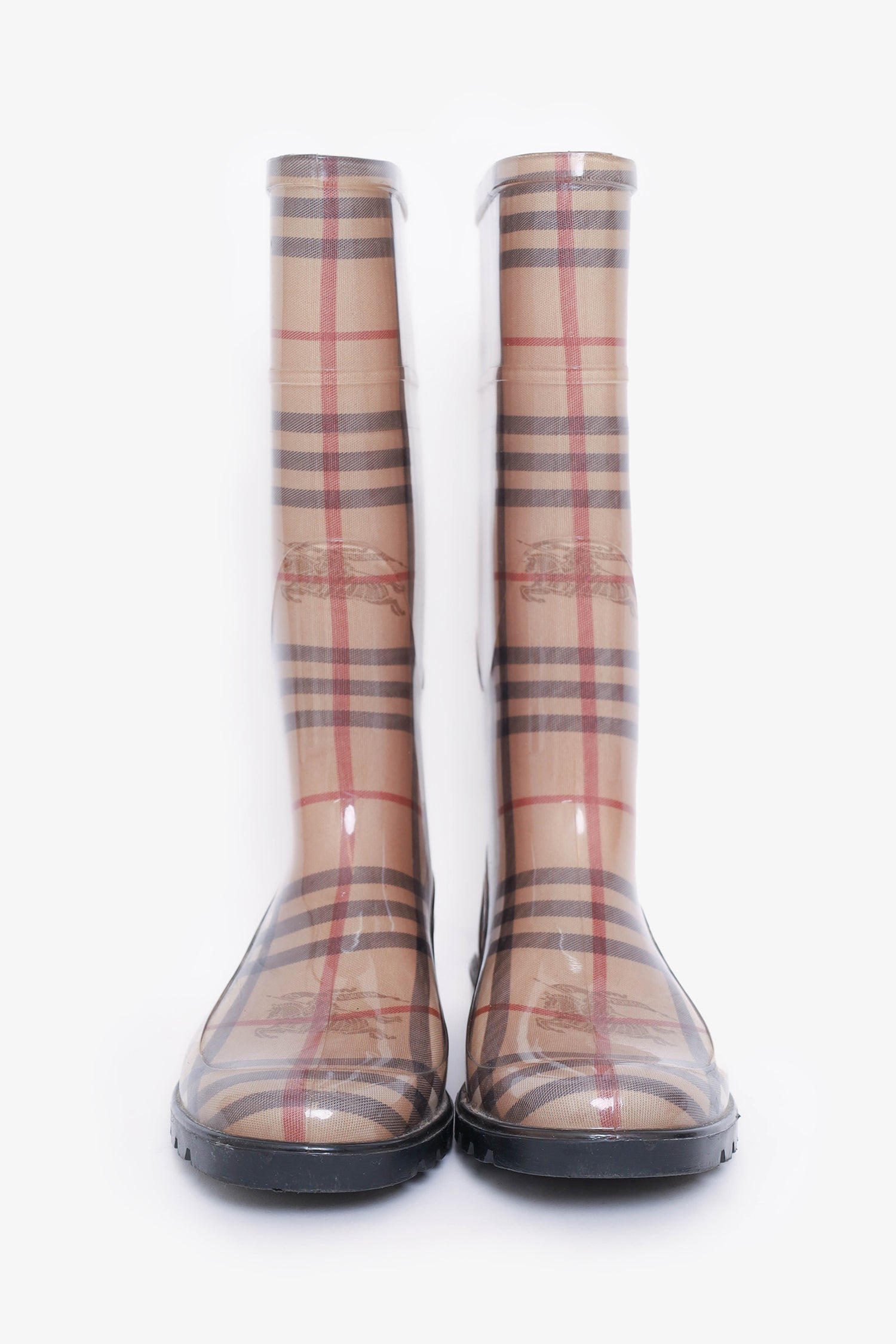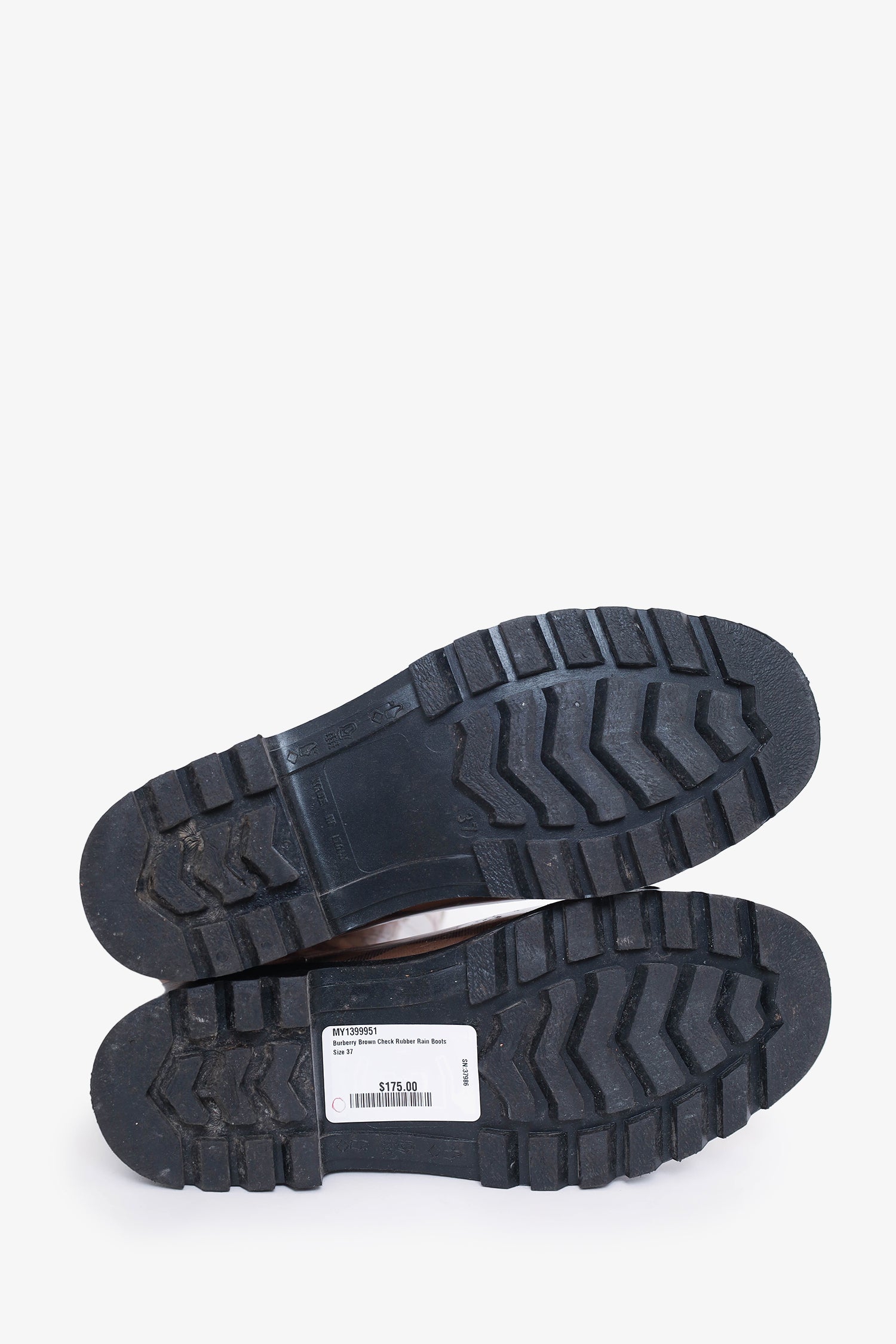 Refresh availabilityBurberry Brown Check Rubber Rain Boots. Pull-on. Round toe. Tonal stitching.