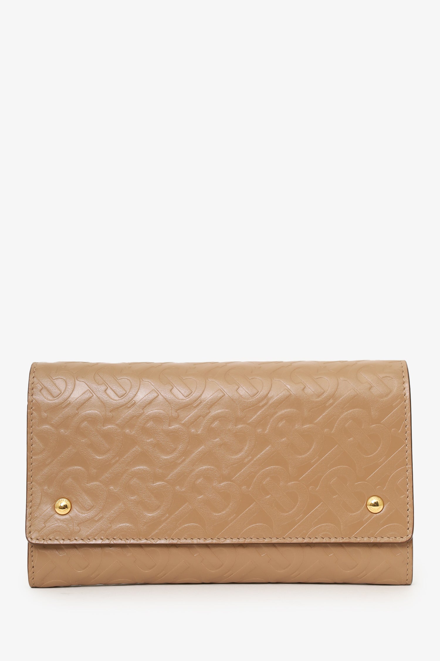 Refresh availabilityBurberry Brown Leather 'TB' Embossed Hazelmere Wallet On Strap. Front fold-over flap with snap-button closure. Removable strap with adjustable buckle closure. 4 interior compartments; front zip, second with 6 card slots, third open, rear with 6 card slots and 1 bill slot. Gold-tone hardware. Tonal stitching.